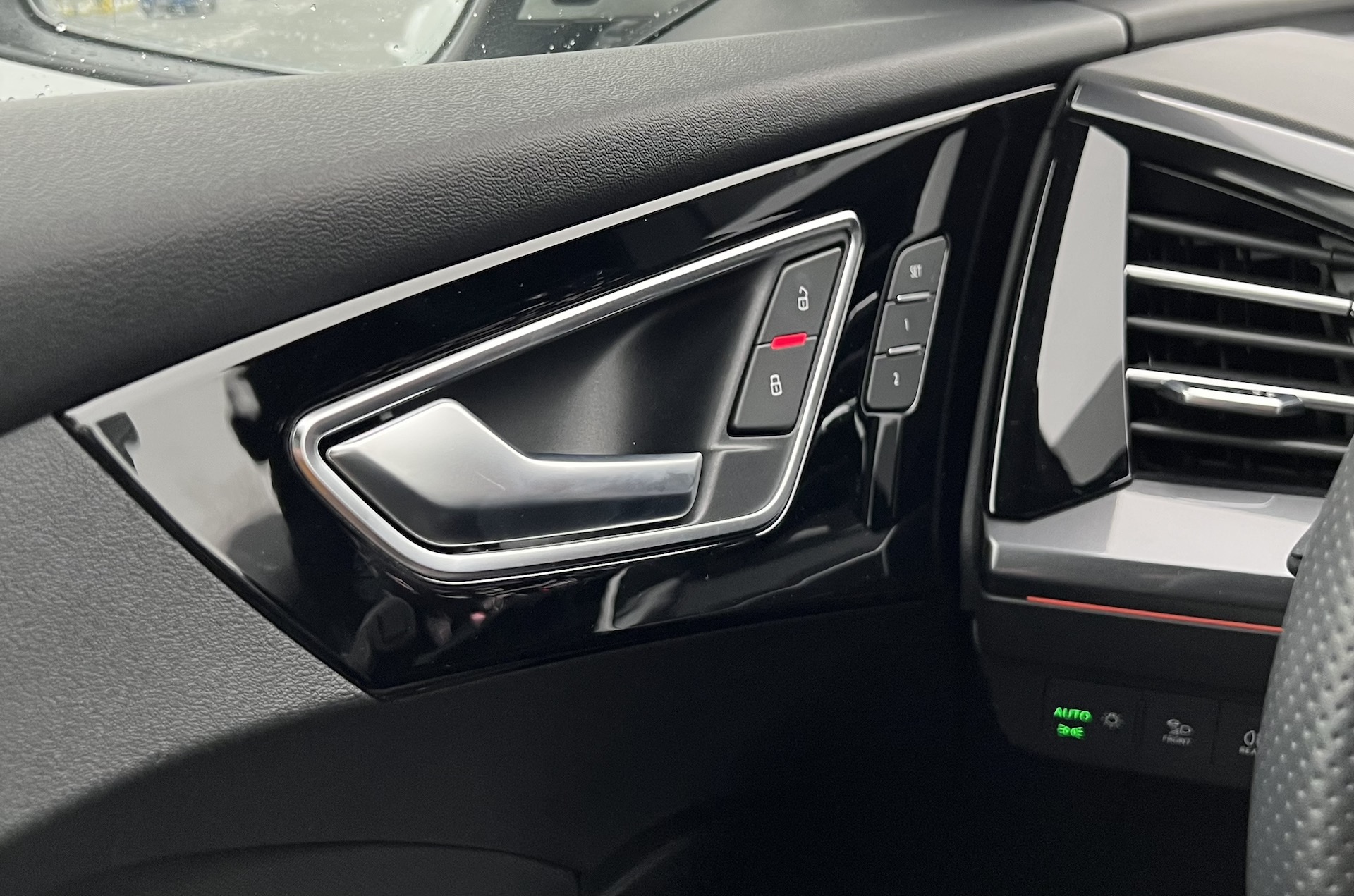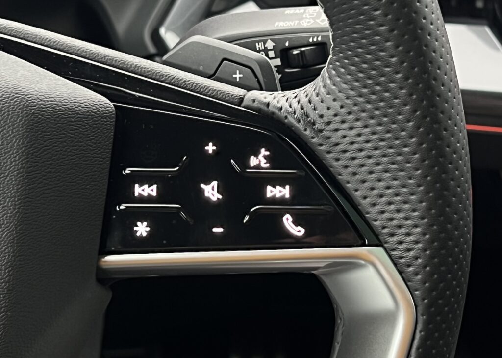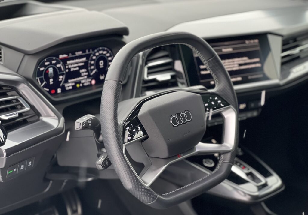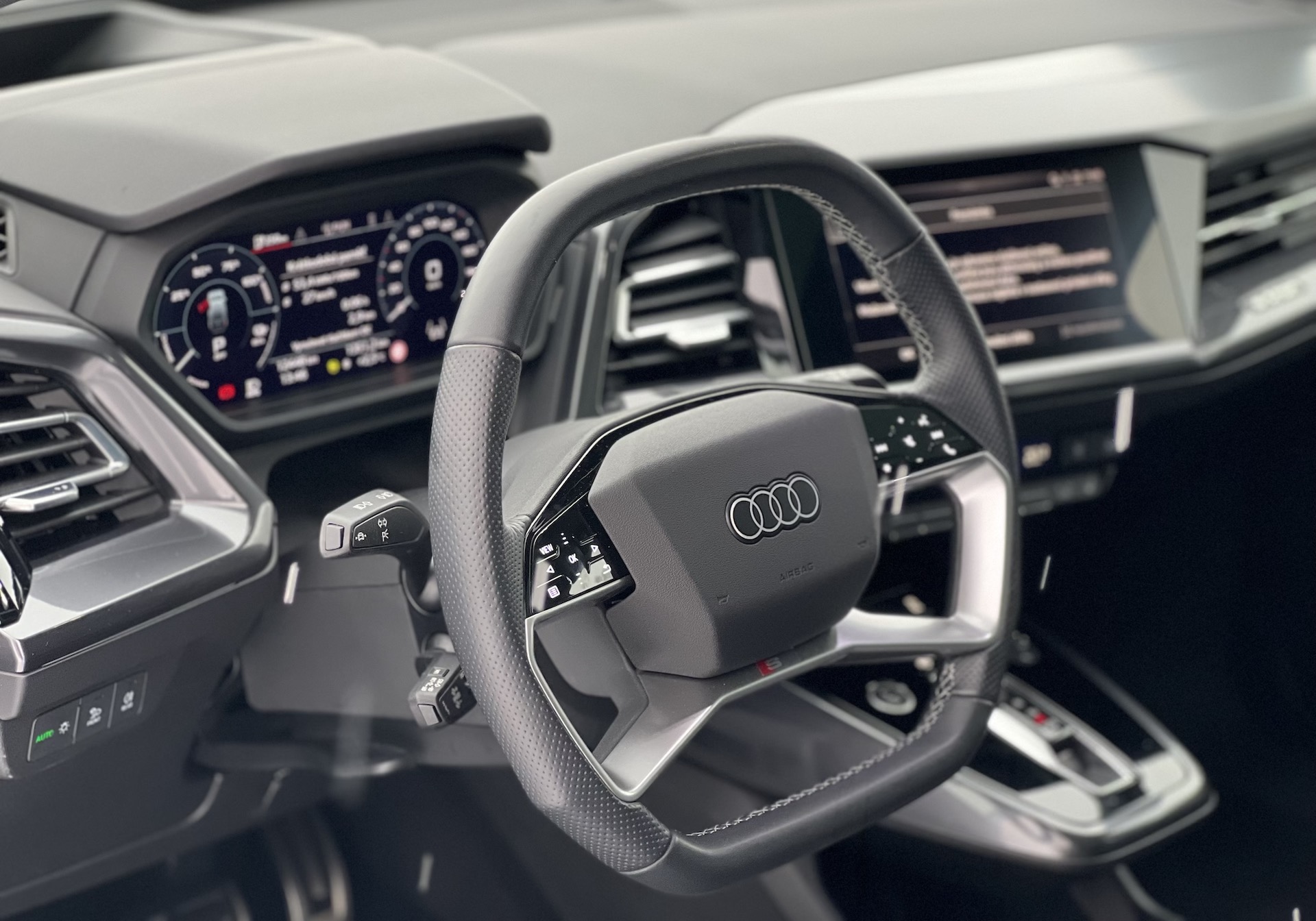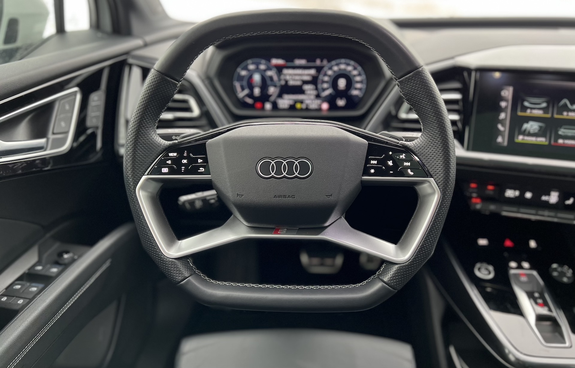 ovládání kombinující dotykové ovládání, a zajímavý dotykový kruh pro několik zásadních funkcí – hlasitost se totiž řeší kroužením prstem po obvodu. Ten se nachází na středové konzoli, která má pod sebou poměrně velký úložný prostor. Po stránce infotainmentu Audi těží z toho, že se mohlo částečně osamostatnit od „konvenčního“ řešení koncernu VW, které, jak je veřejně známo, ve své poslední generaci trápí řada problémů. Infotainment Audi i digitální přístrojový štít se zatím jeví jako bezproblémové a uživatelsky přívětivé.