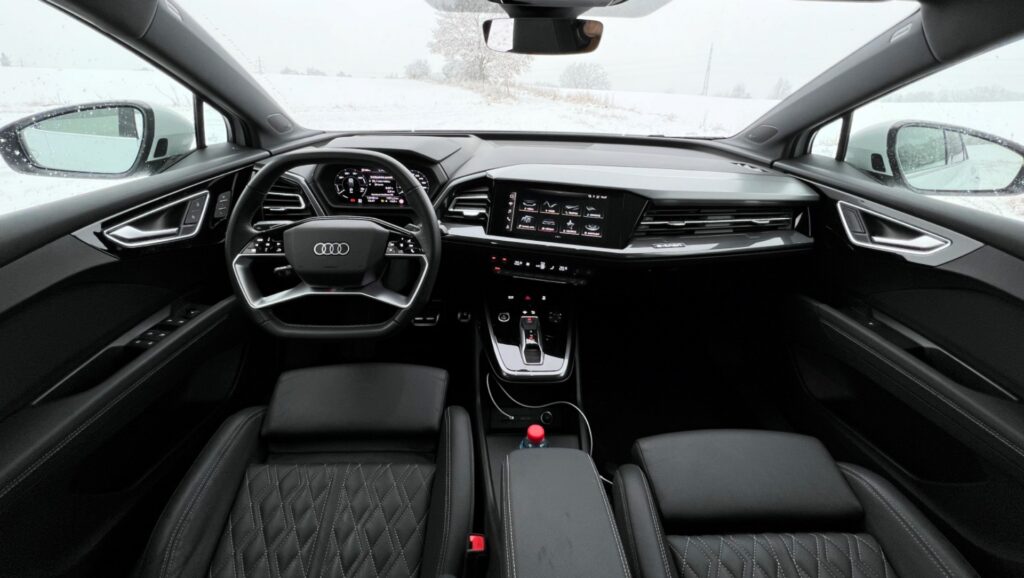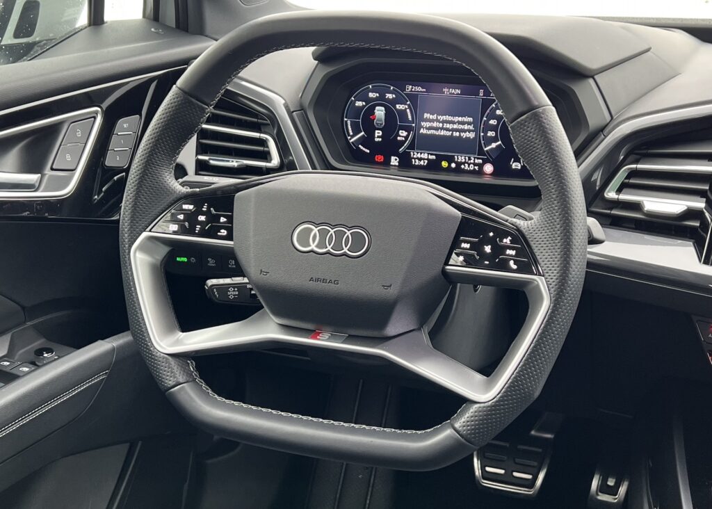 První dojem je opravdu velmi pozitivní. Při příchodu ke Q4 si budete chvíli prohlížet její „čumák“, jelikož vypadá opravdu mohutně. Poté si všimnete nádherných, ale skoro až zbytečně obřích kol (v našem případě 21“). Velikostně pak sice Q4 skvěle vyplňuje mezeru mezi Q3 a Q5 – pokud se dá vůbec hovořit o mezeře – a nebýt označení „e-tron“ vůbec by mě (alespoň po designové stránce) nenapadlo, že stojí tak trochu mimo tradiční modelovou řadu. Zž na první pohled je navíc vidět, že blíže má spíše Q5. Technicky toho sice moc společného nemají, svým mohutným vzhledem ale vystupuje Q4 velmi dospěle. S délkou 4,59 metru je jen o necelých 7 cm kratší než právě Q5 a v rozvoru je tomu tak dokonce jen o 5,5 cm. Tím místem, kde si tihle dva sourozenci příliš nezadají, je hmotnost. Ta ale na první (ani druhý) pohled není vidět, takže se pojďme podívat zpět na design. Po této stránce považuji za povedenou taktéž zadní část, která se příjemně zakulacuje i ve standardní verzi. Sportback je pak ještě o poznání odvážnější. To, co jednoho láká, druhému vonět nemusí, a tak chválím, že se Audi rozhodlo připravit pro potenciální zákazníky možnost volby mezi relativně tradiční siluetou SUV a stylu SUV-kupé v podobě Sportbacku, který se třeba mně osobně líbí o malinko více. V řeči detailů považuji za líbivé LED Matrix přední světlomety, což je za mě super věc především večer, když auto zamykáte. Světla dělají již známou Audi animaci. Nemluvě o oné maticové technologii, která v Audi funguje velmi dobře. Musím se ještě vrátit k masce. Velmi mě zaujaly zaslepené „průduchy“ k brzdám, které jsou opravdu veliké a dodávají voze na tom sportovním vzhledu, kterému mimochodem pomáhá i S-Line paket.