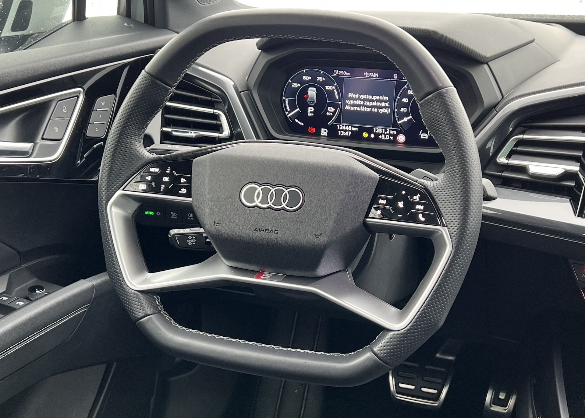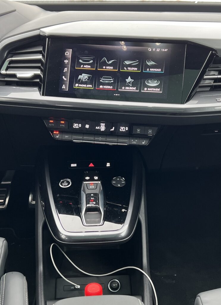 První start a vlastně spíše první zapnutí. Poté volím již zmíněným minimalistickým voličem „D“, pouštím brzdu a přidávám „elektřinu“. První věc, která mě zaskočila, je dojezd, sice je 7 stupňů pod nulou, auto při plném nabití ale ukazovalo jen 300 km, a to rozhodně není výhra. Výrobce udává dojezd dle WLTP 471 km kombinovaně a 610 km ve městě. Říkám si hned, že se na tuto hodnotu určitě nedostanu. Musí se ale nechat, že v létě by to mohlo být jiné kafe. V zimě jsme se se spotřebou totiž pohybovali nejčastěji mezi 22 a 25 kWh/100 km. S maximální využitelnou kapacitou baterie 76,6 kWh logicky v našem případě se moc přes 300 km na jedno nabití nedostaneme. Umím si ale představit, že v létě při rozumném stylu jízdy bychom byli zhruba o 5 kWh/100 km níže, díky čemuž by dojezd stoupl na lehce přes 400 km. Q4 má každopádně na svou váhu 2.135 kg, což není vůbec málo, poměrně komfortní podvozek a to i v kombinaci s 21palcovými koly. To je mimochodem velmi příjemné překvapení. 50 e-tron se pojí vždy s pohonem všech čtyř kol označovaným i tady Quattro, což vždy rád slyším. I tady mi pomohlo dostat se do horších míst, která byla zrovna v době našeho testu hojně zasněžená. Poté jsem si řekl, že přece musím vyzkoušet, jak auto se 300 koňmi a pohonem všech čtyř kol zrychluje. Musel jsem si ale vzít k srdci, že se nebudu koukat na (klesající) dojezd. Auto zrychluje poměrně příjemně bych řekl, 6,2 vteřiny zrychlení z 0 na 100 km/h je zcela adekvátních. Přesto bych si dovolil tvrdit, že by v dnešní době vrcholná verze mohla být ještě o malinko silnější. Obecně ale musím říci, že auto jede moc dobře a i v zatáčkách umí velmi dobře maskovat svou velikost a hmotnost, pomáhá tomu sportovní podvozek verze S-Line. Ano, auto to bude dobré do města – jak vždy říkám, to je hlavní teritorium elektromobilu. Na druhou stranu musím přemýšlet, proč bych potřeboval do města tak velké auto. V Audi určitě chtěli, aby Q4 nabízela co nejvšestrannější použití, což ze z části určitě povedlo. Pokud bych většinu svého času za volantem strávil ve městě a jeho okolí a jedna moje průměrná cesta nečítala stovky kilometrů, pak by určitě Q4 e-tron dávala smysl. A sem tam nějaký ten výletík za hranice dojezdu by v pohodě vyřešila rychlonabíjecí stanice, u níž umí tento e-tron využít až 125 kW nabíjecího výkonu, díky čemuž by dobití z 0 na 80 % mělo zabrat zhruba půl hodiny. Co se pomalejšího, AC nabíjení týče, 11 kW považuji za standard či průměr chcete-li. Z wallboxu tak nabití na 100 % zabere zhruba 7 hodin, doma tak nic víc logicky nepotřebujete. Při nakupování (třeba v Kauflandu nebo Lidlu, kde nabíjecí stanice často stojí) bude ale vhodné zvolit povětšinou dražší a méně často dostupné rychlonabíjení typu DC.