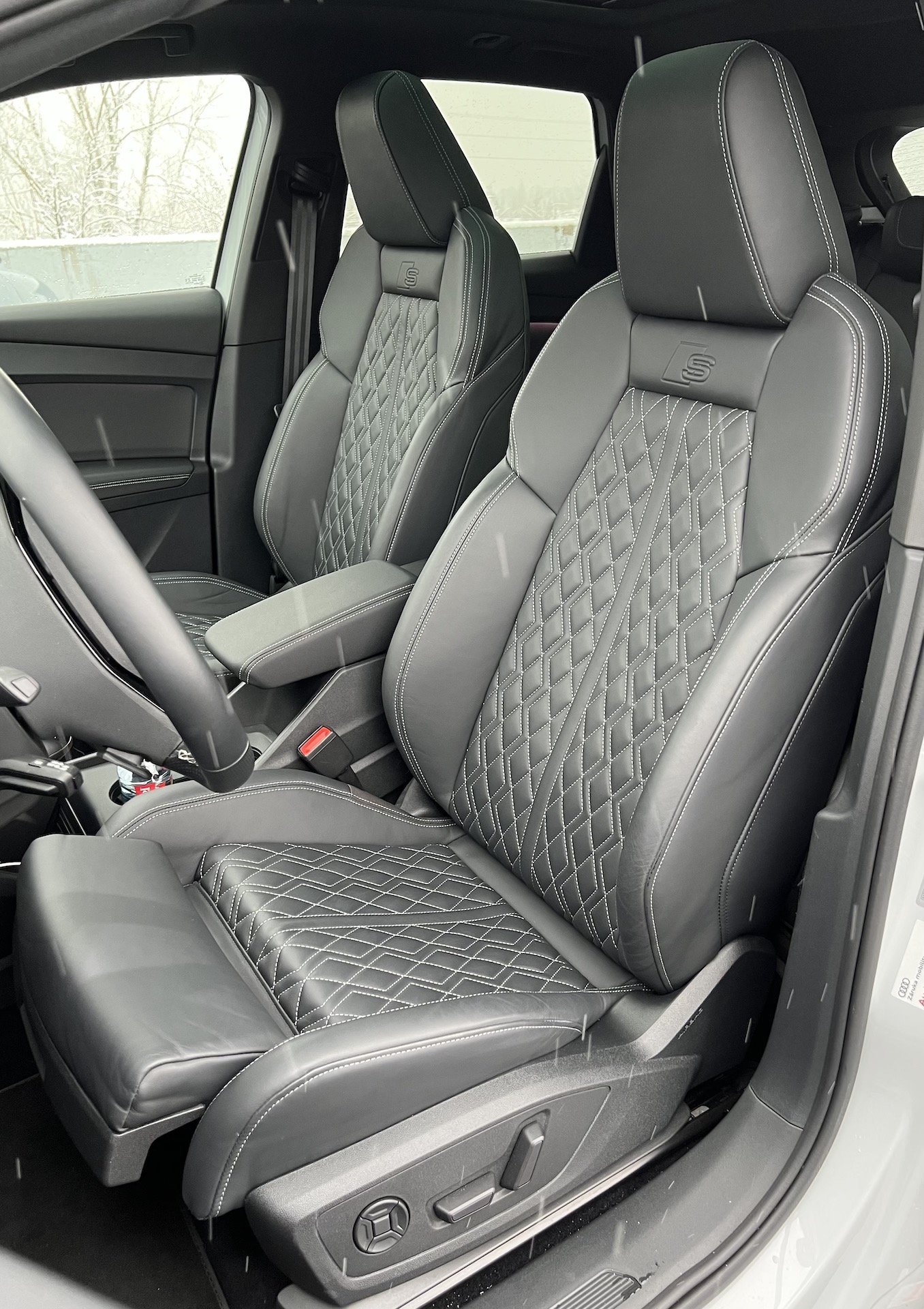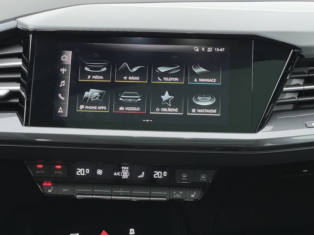 Otevírám dveře u řidiče a přede mnou se rozprostírá interiér, který mi trošku připomíná některé sourozence z řad ostatních značek koncernu VW. I volant, který dnes Audi používá i v dalších modelech, jako bych už někde viděl. Bohužel mi moc nevyhovovalo, jak byl jeho věnec tenký. Za volantem se ale nachází digitální přístrojová deska, která mou náladu okamžitě spraví. V případě Audi u ní nechybí několik možností zobrazení, z nichž tou nejzajímavější je dle mého stále mapa přes celou obrazovku. Co se grafické stránky týče, Audi je u digitálního přístrojového štítu na špičce. Nechybí pak ani ukazatele běžných údajů. U každého z rozvržení mohu ještě zmenšit nebo naopak zvětšit zobrazení (postranních) budíků. Sedám si do sportovního křesla, které je v řeči S-Line interiéru připomíná skořepiny, opěrka hlavy ale není integrovaná. Tento hybridní model se mi moc líbí a jsem tak naprosto spokojen. Naše provedení se pak skládá z koženého čalounění a obšití bílou nití, což dohromady vytváří příjemný dojem sportovnosti a luxusu zároveň. Za příjemně minimalistické bych označil i řešení voliče jízdních režimů pomocí jednoho jediného ovladače. Středový displej nabízí dobrou grafiku a velmi intuitivní