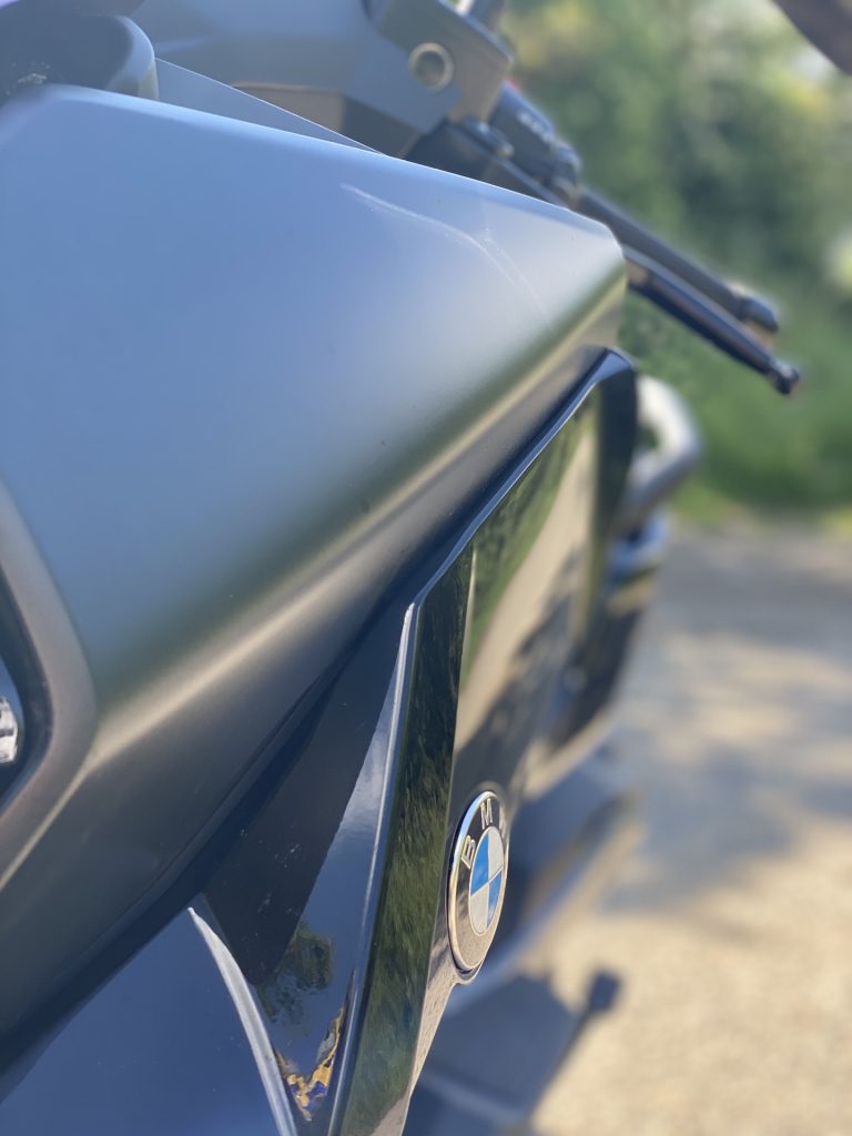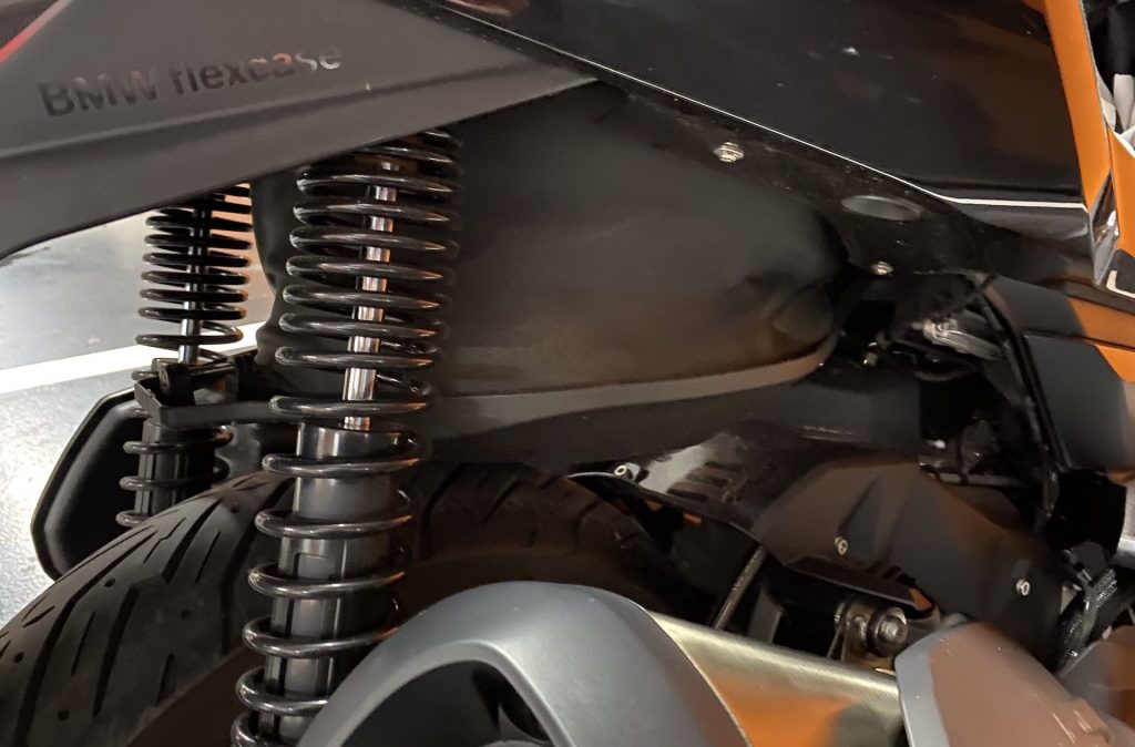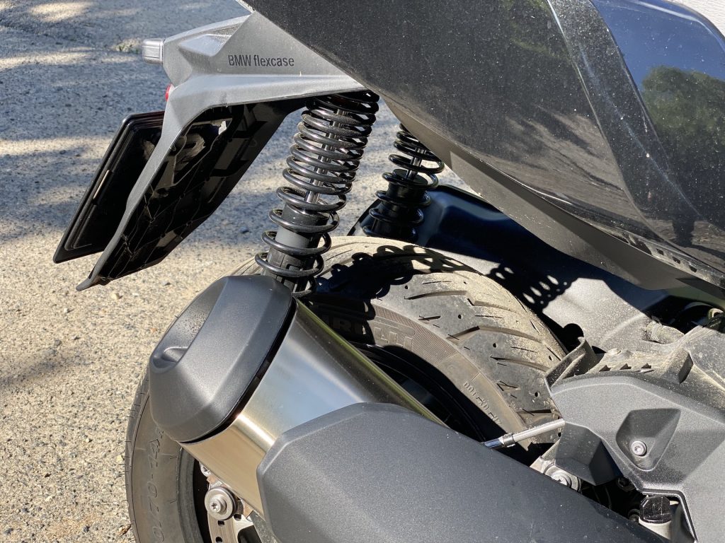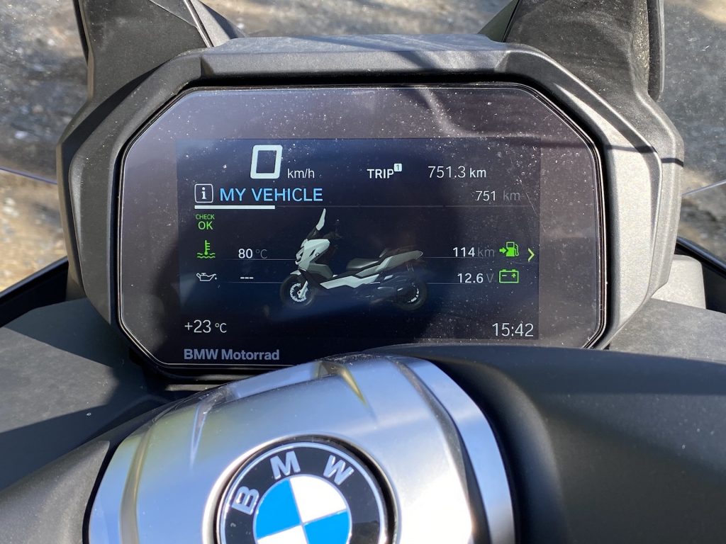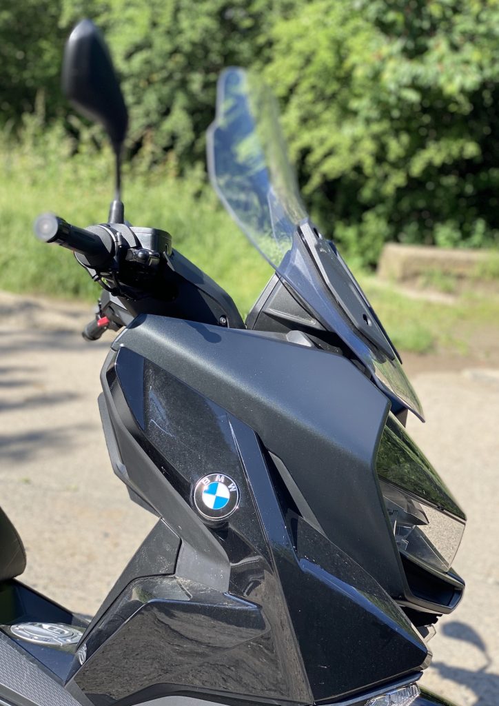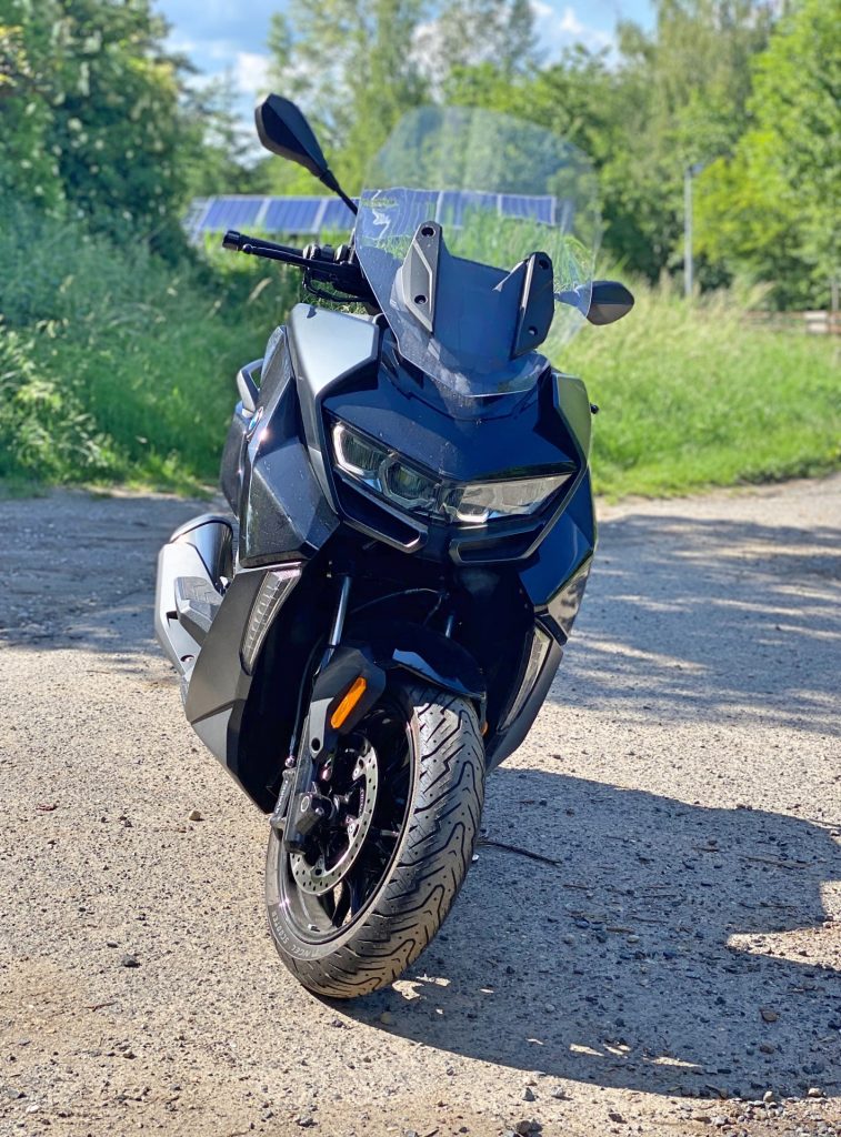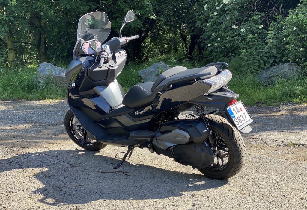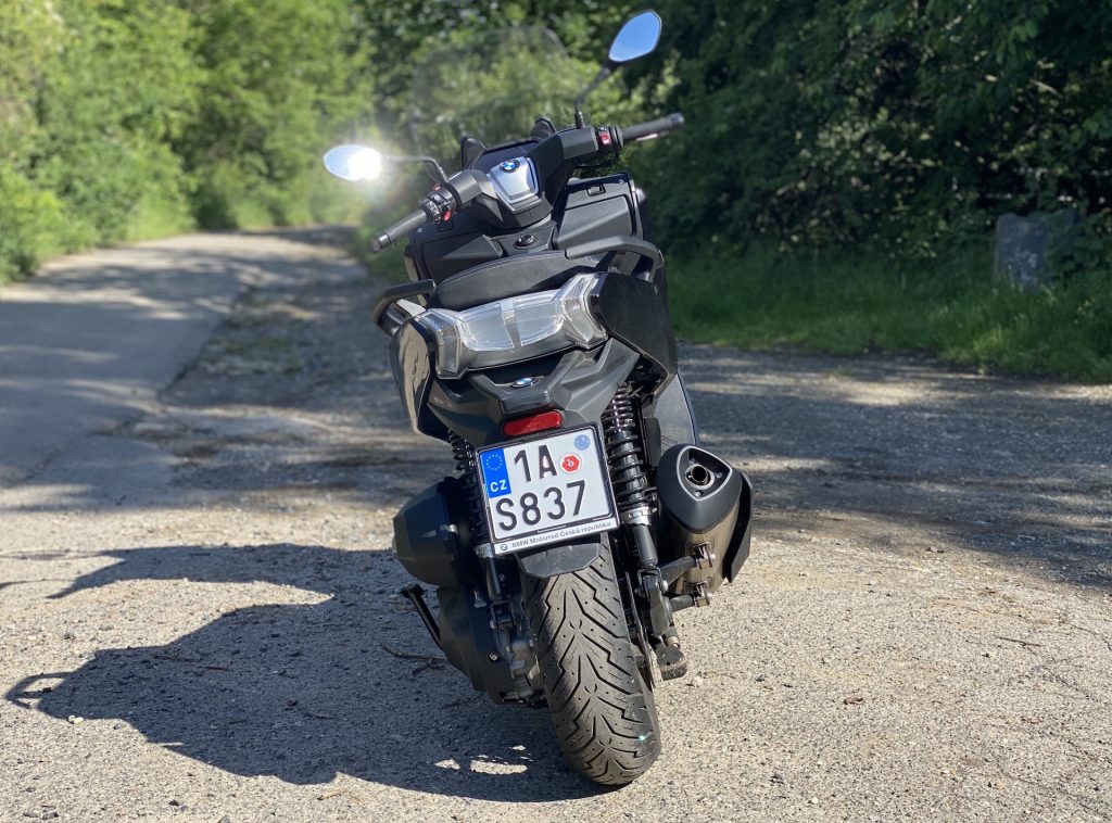 Už když k C 400 přicházím, jsem překvapen jeho optickou velikostí. Je pravda, že už jsem sedlal poměrně hodně strojů, ale co se skútrů týče, i přes určitá očekávání spojená s vyšším objemem motoru jsem byl v první chvíli překvapen. Opravdu jde o velký stroj, u něhož „skútrismus“ připomíná snad jen standardní silueta, díky níž řidič sedí příjemně vzpřímeně. Je skoro samozřejmostí, že vzhled potěší. I když lze považovat naši barvu (šedo-černé lakování) za poněkud fádní (myšleno nevyčnívající z davu), řekl bych, že si tohle BMW jen tak s něčím nespletete. Přední část je až nezvykle mohutná. K pozitivnímu dojmu přispívají i FULL-LED světlomety, mně osobně zaujaly ještě mimo jiné LED blinkry umístěné naspod po okrajích lemu předního kola. Na první dobrou si jich sice nevšimnete, ale to především vzhledem k funkčnosti směřované směrem k ostatním účastníkům provozu. Stačí pár metrů odstoupit a zakoukat se – famózní. Z praktického hlediska pak potěší i relativně rozumně velké plexi, díky němuž se tenhle stroj nebojí ani vyšších rychlostí. O tom ale až za chvilku. K designu už toho není potřeba říkat příliš, neb směrem dozadu přichází část vycházející z koncepce skútru, a to obdobná pro všechny stroje v této kategorii.