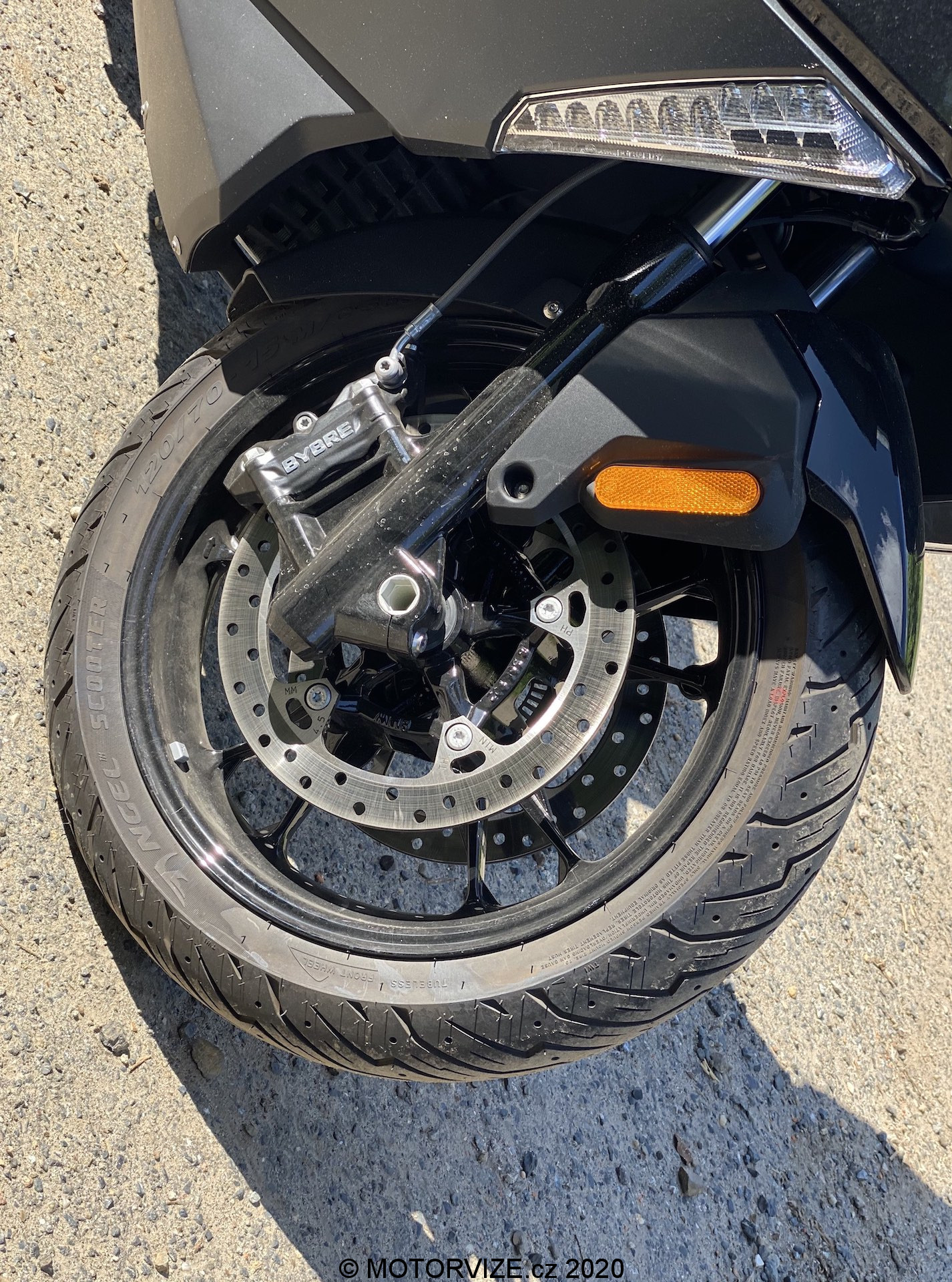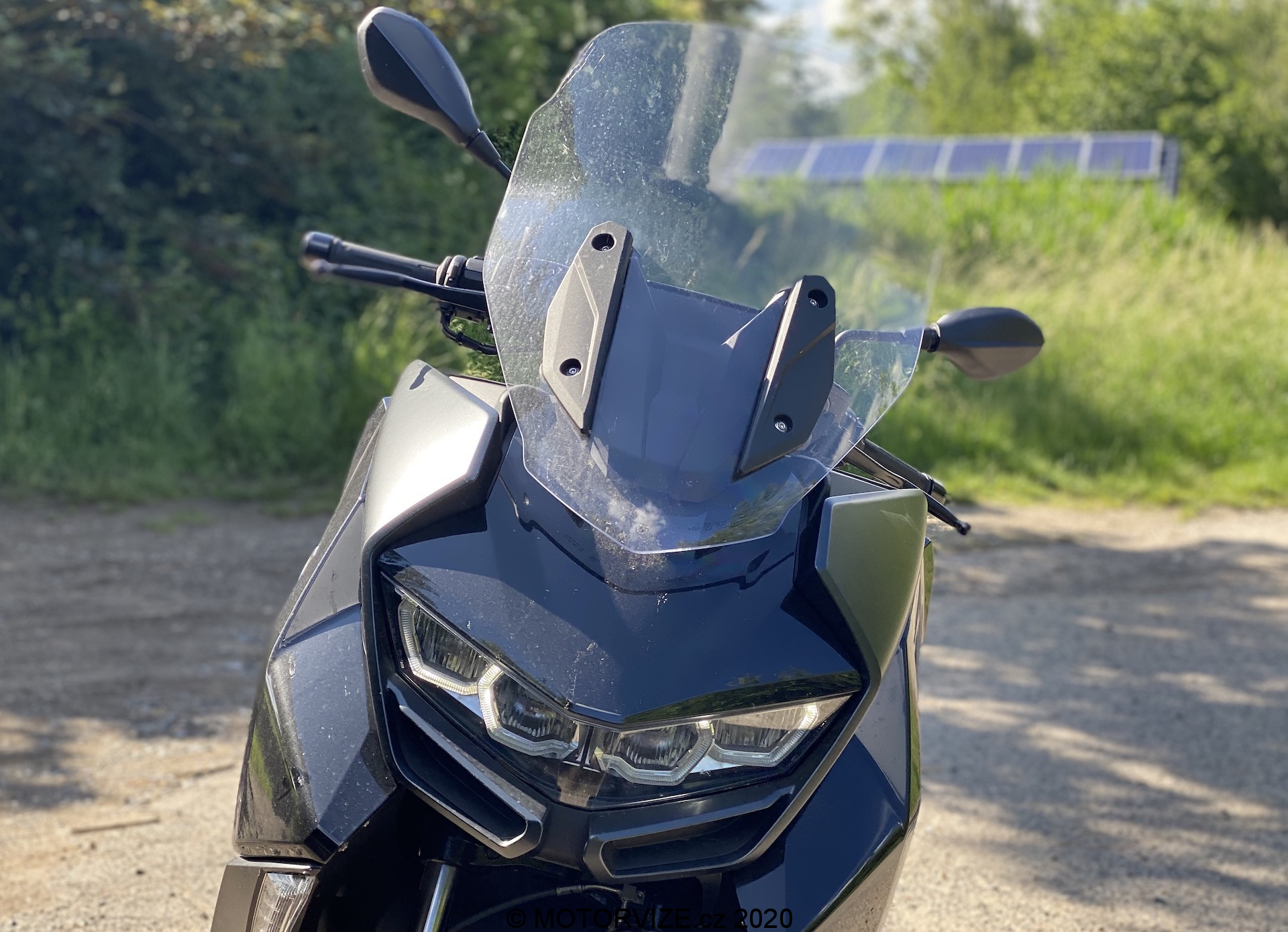 Už když k C 400 přicházím, jsem překvapen jeho optickou velikostí. Je pravda, že už jsem sedlal poměrně hodně strojů, ale co se skútrů týče, i přes určitá očekávání spojená s vyšším objemem motoru jsem byl v první chvíli překvapen. Opravdu jde o velký stroj, u něhož „skútrismus“ připomíná snad jen standardní silueta, díky níž řidič sedí příjemně vzpřímeně. Je skoro samozřejmostí, že vzhled potěší. I když lze považovat naši barvu (šedo-černé lakování) za poněkud fádní (myšleno nevyčnívající z davu), řekl bych, že si tohle BMW jen tak s něčím nespletete. Přední část je až nezvykle mohutná. K pozitivnímu dojmu přispívají i FULL-LED světlomety, mně osobně zaujaly ještě mimo jiné LED blinkry umístěné naspod po okrajích lemu předního kola. Na první dobrou si jich sice nevšimnete, ale to především vzhledem k funkčnosti směřované směrem k ostatním účastníkům provozu. Stačí pár metrů odstoupit a zakoukat se – famózní. Z praktického hlediska pak potěší i relativně rozumně velké plexi, díky němuž se tenhle stroj nebojí ani vyšších rychlostí. O tom ale až za chvilku. K designu už toho není potřeba říkat příliš, neb směrem dozadu přichází část vycházející z koncepce skútru, a to obdobná pro všechny stroje v této kategorii.