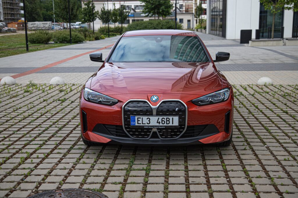 i4 je reálně elektrickou verzí klasického BMW 4 GC (Gran Coupe, chcete-li), ze kterého nám vychází relativně ozkoušený design, jehož odlišnosti mezi spalovací a elektrickou verzí nalezneme pouze v detailech. Přední část od klasické odlišují plné „bobří zuby“, modře podbarvený znak BMW a modré písmo „i“ na stříbrném podkladu. A to je v podstatě celé. Bobří zuby byly vnímány spíš negativně, ale za sebe mohu říct, že jsem si zvyknul a nová BMW se mi líbí, a to mohu říct i o eklektickém modelu. Typické ledvinky tedy narostly do obřích rozměrů, což je zdůrazněno matně chromovaným lemováním. Tenká, přimhouřená přední světla dávají správně agresivní „look“ a samozřejmostí je i minimalistické ale originální a pro BMW typické LED denní svícení. Nárazník je tvarovaný ostře a přední část se tváří přesně tak, jak očekávám – sebevědomě.