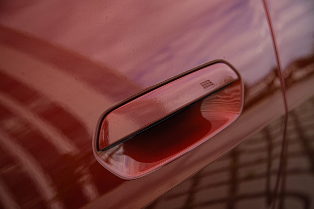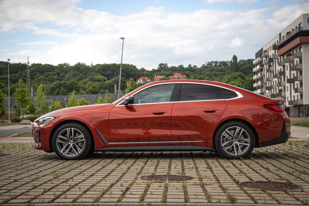 Boční profil se tentokrát také povedl. Na přechozí generaci modelu mi právě tohle vadilo asi nejvíc. Nad zadním kolem mi GC připadalo takové odulé. To je pryč a pojem 4dveřové kupé, což na první dobrou působí jako nesmysl, tady skvěle funguje. Dlouhý čumák, na nějž navazuje sklopený přední A sloupek, plynule přechází směrem k zadní části malým zadním převisem. Díky černým B sloupkům i výrazné chromované lince okolo bočních bezrámových oken vypadá tohle auto opravdu jako kupé. Tento dojem podtrhují i zapuštěné kliky. Testovaná i4 nesla oranžovou metalízu a také měla velmi dobře zvolená kola v antracitovém odstínu. K němu výrobce hezky doladil spodní matně chromovanou lištu dveří a šedivé prahy. Z boku je i4 ještě hezčí, než z předu.