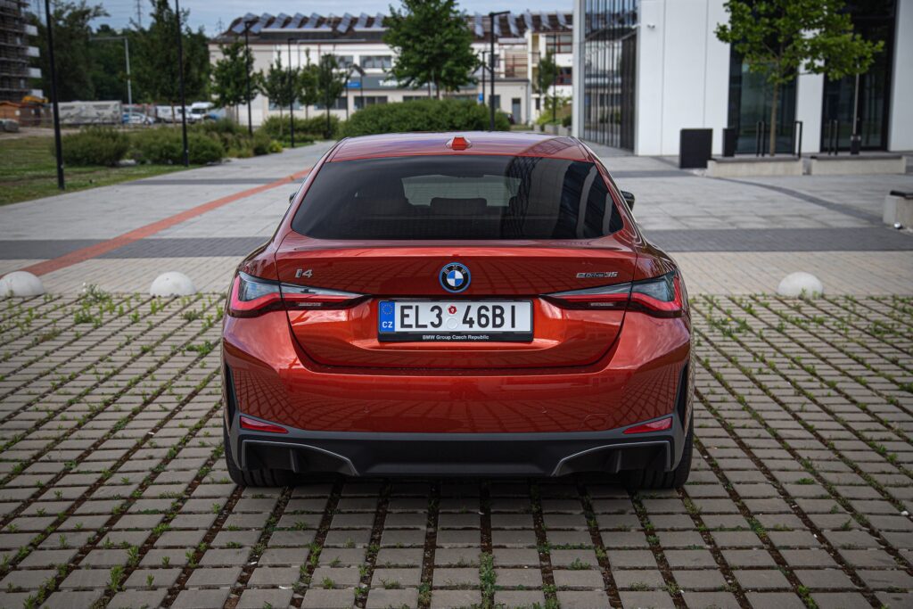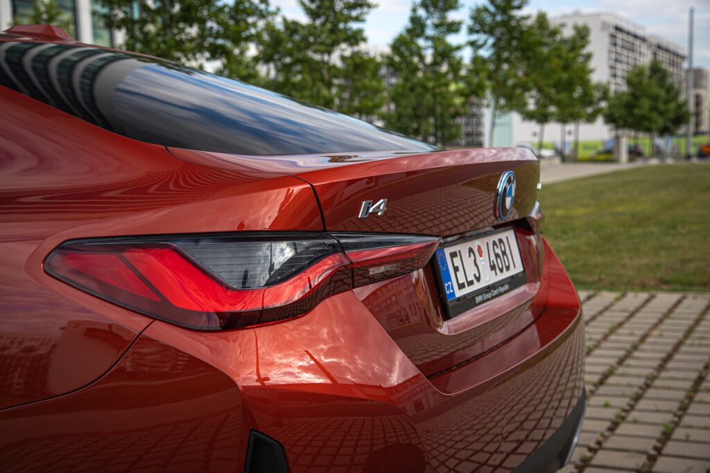 Přesouvám se tedy k zadní části a vše tu dokonale navazuje na to, co bylo zatím řečeno. Nechybí nově tvarovaná, relativně tenká zadní světla s LED technologií a pěknou grafikou, modře podbarvený znak BMW a spodní část nárazníku, kde nyní místo koncovek výfuku najdeme pěkně tvarovaný difuzor. i4 se designově povedla, oranžová metalíza jí vysloveně sluší a osobně mě naživo opravdu mile překvapila. Tohle je vážně designově pěkné a vyvážené auto.