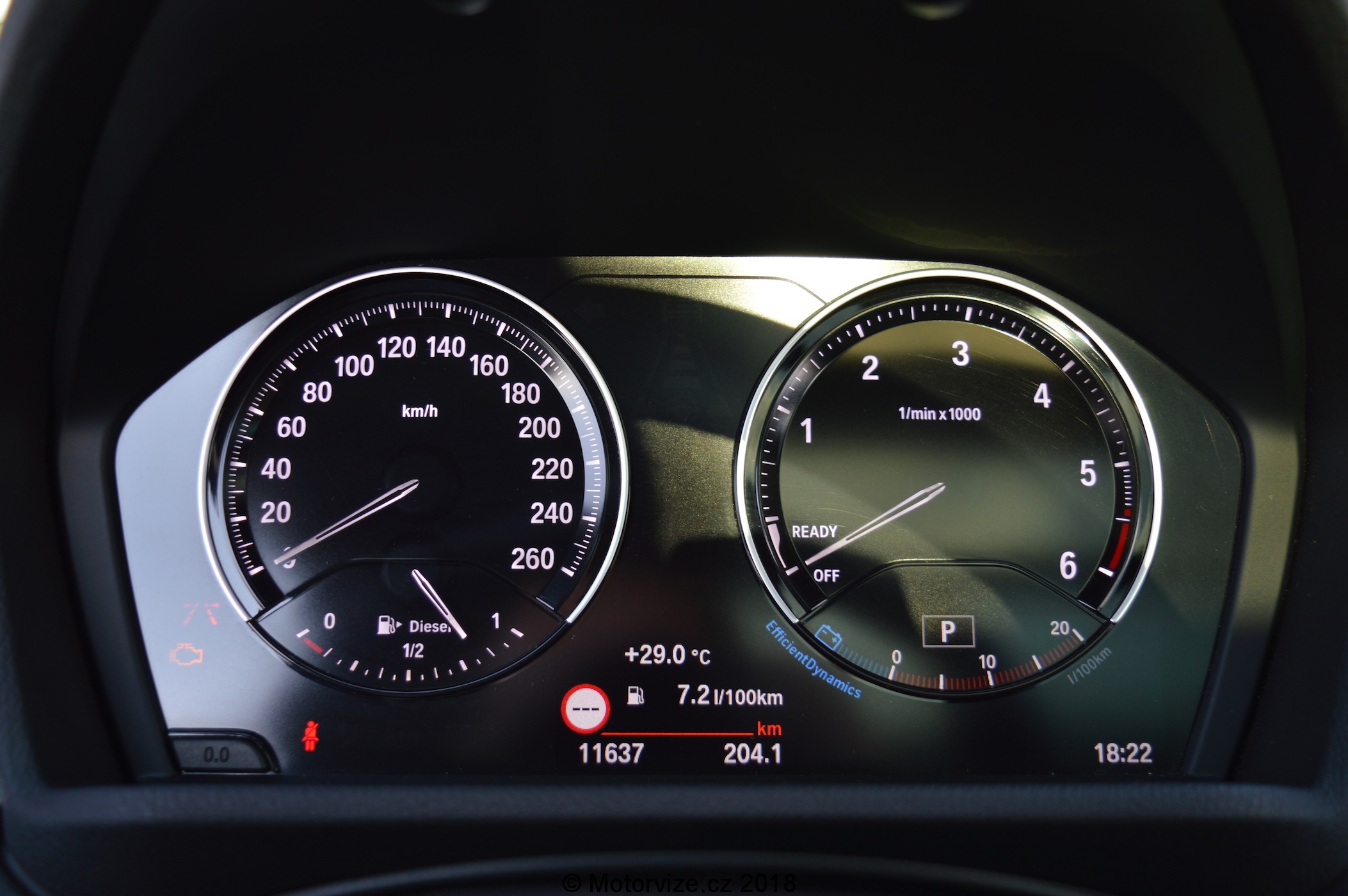 Budíky jsou sice plně digitální, nicméně není tomu úplně ve smyslu jednolitého inteligentního a opravdu velkého displeje. Displej je umístěn pouze v dolní části a splývá se zbytkem plochy, která je černá – plnohodnotný digitální štít s rozšířenými funkcemi a hlavně možnostmi individualizace nedostanete ani za příplatek, musím ale uznat že i toto řešení působí velmi efektně, i když tolik informací zobrazit nedokáže. Mimochodem je tu jedna zcela ohromující drobnost – díky absenci jakýcholiv analogových ukazatelů a ručiček může BMW vynechat „pleksisklo“ jako krytí přístrojové desky. Alespoň na mě to působí hodně efektně – jakoby všechno bylo řidiči hned o něco blíže. Perfektní je středový dotykový displej, který má skvělé rozlišení a reaguje okamžitě. Dovede i rozdělit obrazovku a zobrazit dvě různé aplikace zároveň. Ovládání kombinací touchpadu, otočného voliče a dotykové obrazovky je také bezchybné a i když mě systém například v Lexusu IS přišel dobrý, zde je to vyvedeno ještě o úroveň výše.