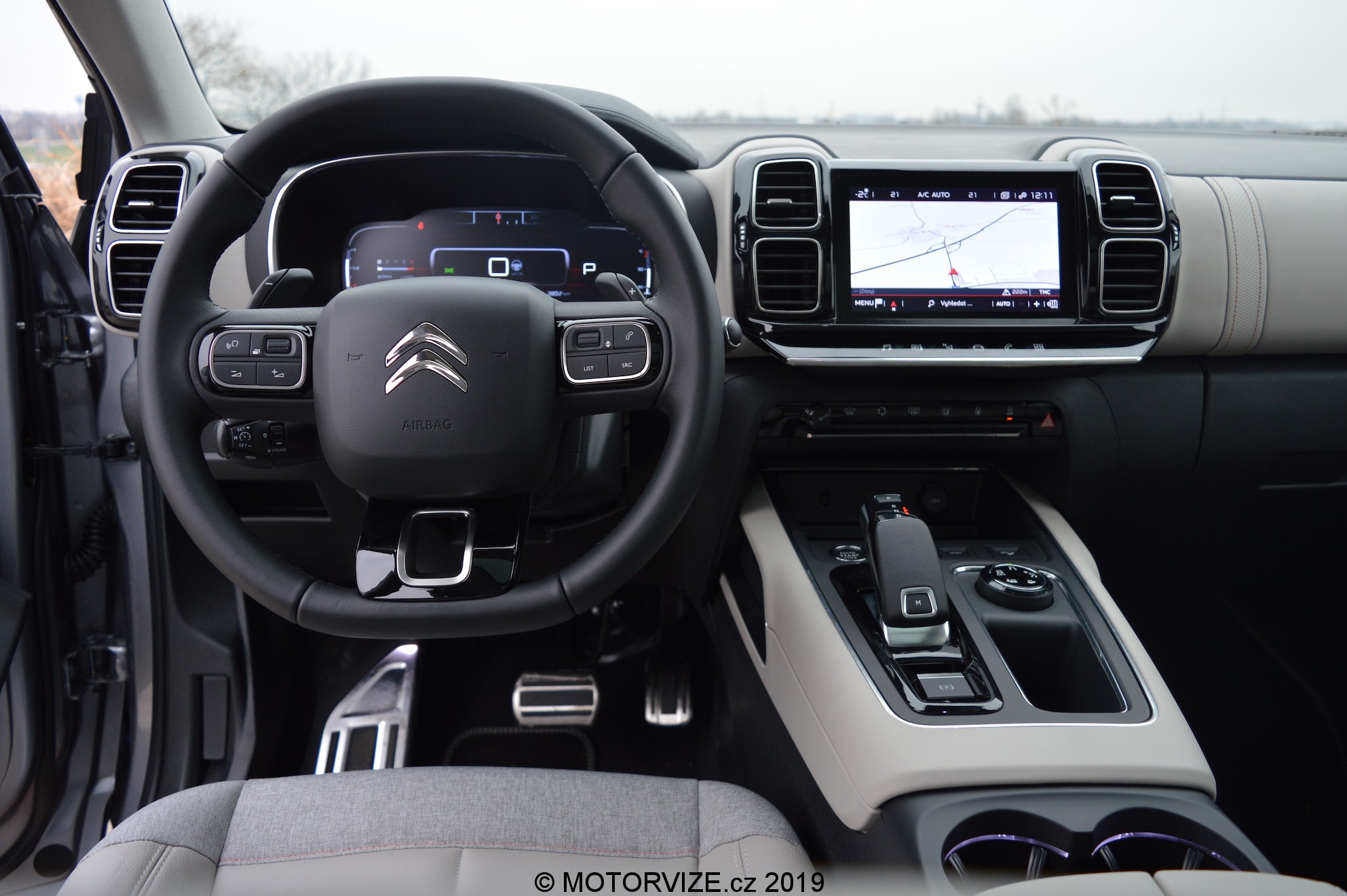 Nebyli bychom to my, kdybychom si pro první svezení nevybrali nejsilnější motorizaci. Je jí už dobře známá 1.6 PureTech o výkonu 180 koní, a to ve spojení s novou osmistupňovou automatickou převodovkou. Je potřeba zmínit, že nebylo ani snahou, aby zrovna tady byla jednotka naladěna vyloženě na sportování. Přesně podle toho se také chová v praxi. Troufnu si tvrdit, že 180 koní je více než dostačující výkon na běžnou jízdu i rychlejší dálniční přesuny. Tady byste ale na první dojem neměli ani pocit, že je pod kapotou máte. Od „sportování“ je tu pak režim SPORT, na opačném pólu stojí ECO, který má nově k dispozici funkci plachtění – při vyšlápnutí plynu vám stejně jako u některých konkurentů vyřadí a jede na volnoběh. V běžném režimu je už podle zmíněného určení auto i motor hodně klidný/klidné a dobře odhlučněné. Pojďme se ale zaměřit ještě na jinou stránku komfortu na palubě. Podvozek. Citroen si jako výrobce nese ještě jednu výjimečnost. Unikátní tlumiče s progresivními hydraulickými dorazy byly představeny už u C4 Cactus, kde jsme je měli možnost zkoušet. Jistou dávku komfortu opravdu přinesly už tam, bylo by škoda, kdyby jimi nebyl vybaven i vrchol modelové řady, který jednoznačně C5 Aircross ztělesňuje. Fungují zde podobně jako u menšího brášky, i když jejich efekt je dle mého ještě o něco dlouhodobější. Nejlepší je pro ně jízda na dálnici, kdy se každá nerovnost rozplyne do takového malého delšího zhoupnutí, což je hodně příjemné. Na kratší a větší díry v případě typických českých okresek a ještě ke všemu v nižších rychlostech ale ani zázračná technika z Francie utlumit nedokáže. I tak přítomnost „revolučních“ tlumičů opravdu vítaná.
