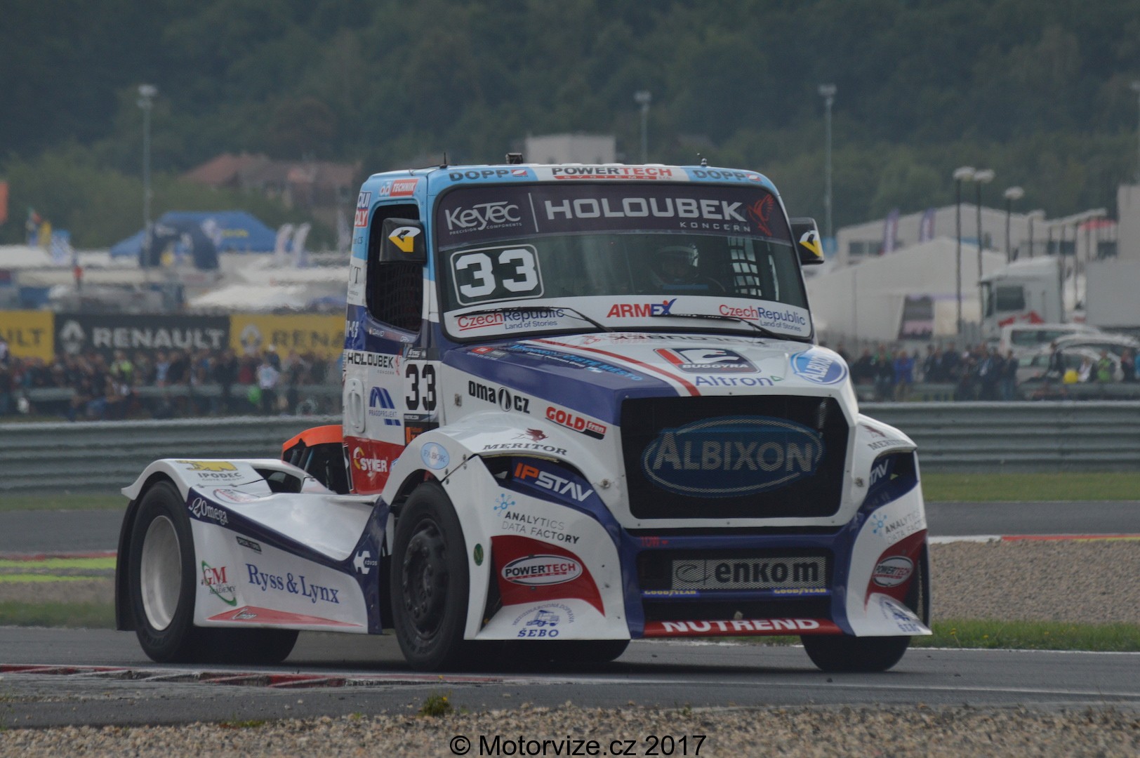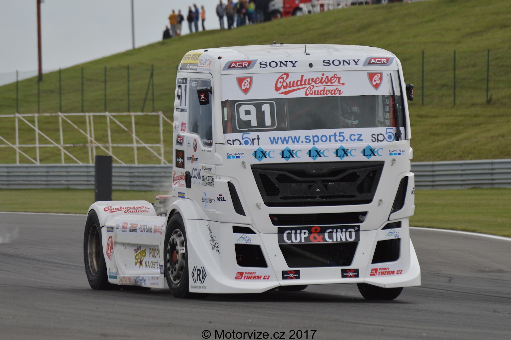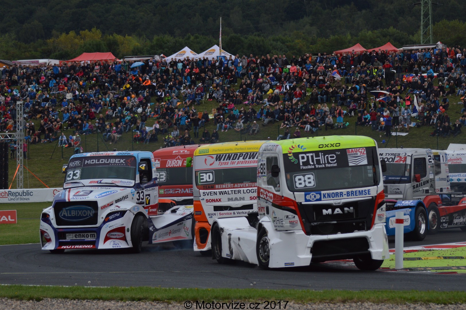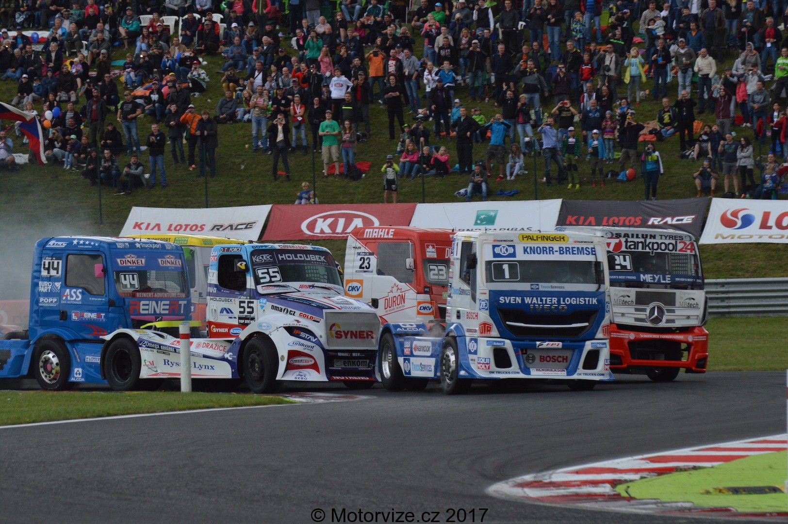 Jako správní nadšenci nevyspáváme a vyjíždíme z Prahy směr Most hned ještě před devátou hodinou ranní. Pojďme si malinko rozvést ten podnadpis. Dopolední program pro běžného smrtelníka není asi vyloženě žádnou peckou. Tréninky a kvalifikace, tj. stručně harmonogram prvního závodního dopoledne na Czech Truck Prix. My svou „Tour de Most“ začínáme zhruba ve čtvrt na 11, kdy parkujeme to obyčejné auto a jdeme se věnovat něčemu naprosto ojedinělému. První na trati spatřuji mladé talenty v rámci šampionátu Kia Lotos Race na shodných vozech Kia Piccanto. No, nemůžu říci, že by mě zrovna tyhle malé (relativně) rychle jedoucí boudičky nějak lákali. O to méně vás budou závodní Piccanta zajímat, že v tomhle šampionátu zatím nemáme svého zástupce. Pak se program diváků a redaktorů/fotografů lehce začíná rozcházet, my jdeme do tiskového střediska na rychlé školení, procházíme všechny důležité informace a pak až se vydáváme k trati. Hned po Renault Clio cupu a kvalifikaci těchto vozů přichází konečně čas na samotnou dominantu celého víkendu, na Trucky. Nebojte, ještě nemluvím o závodě, nýbrž pouze o jejich kvalifikaci. I když nejde o to hlavní lákadlo pro diváky, tak pořád je i teď na co koukat. V první části startuje celé startovní pole, do druhé se pak dostává pouze nejlepších deset. Pro české diváky může být potěšením, že již tradičně do této TOP skupiny se v sobotu dostaly dvě tradiční české želízka v ohni – Adam Lacko a David Vršecký. Naopak další sympaťák a český oblíbenec, Frankie Vojtíšek se na trať podruhé nevydal.