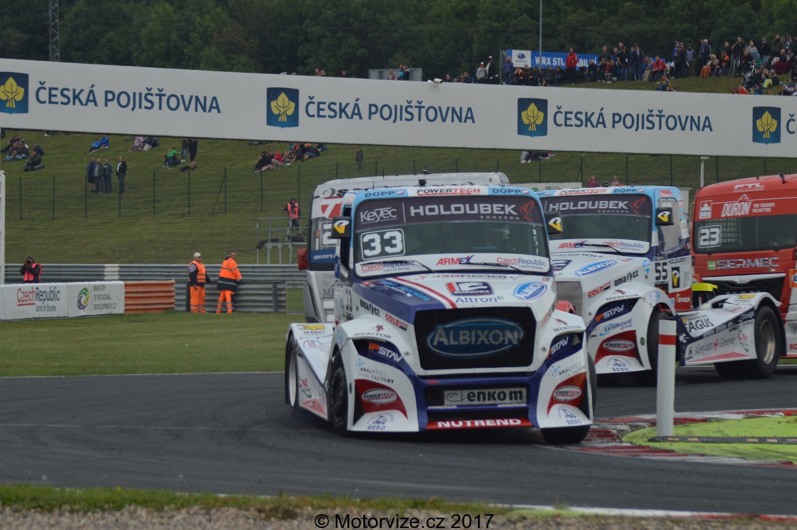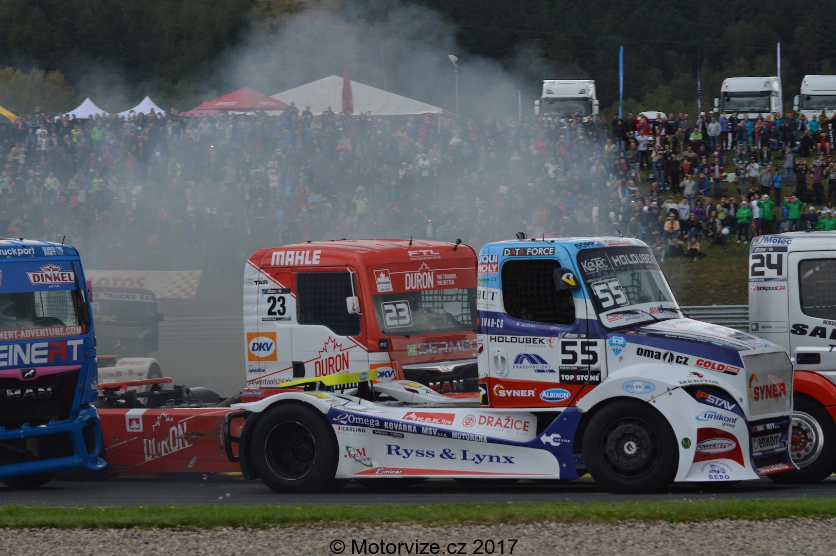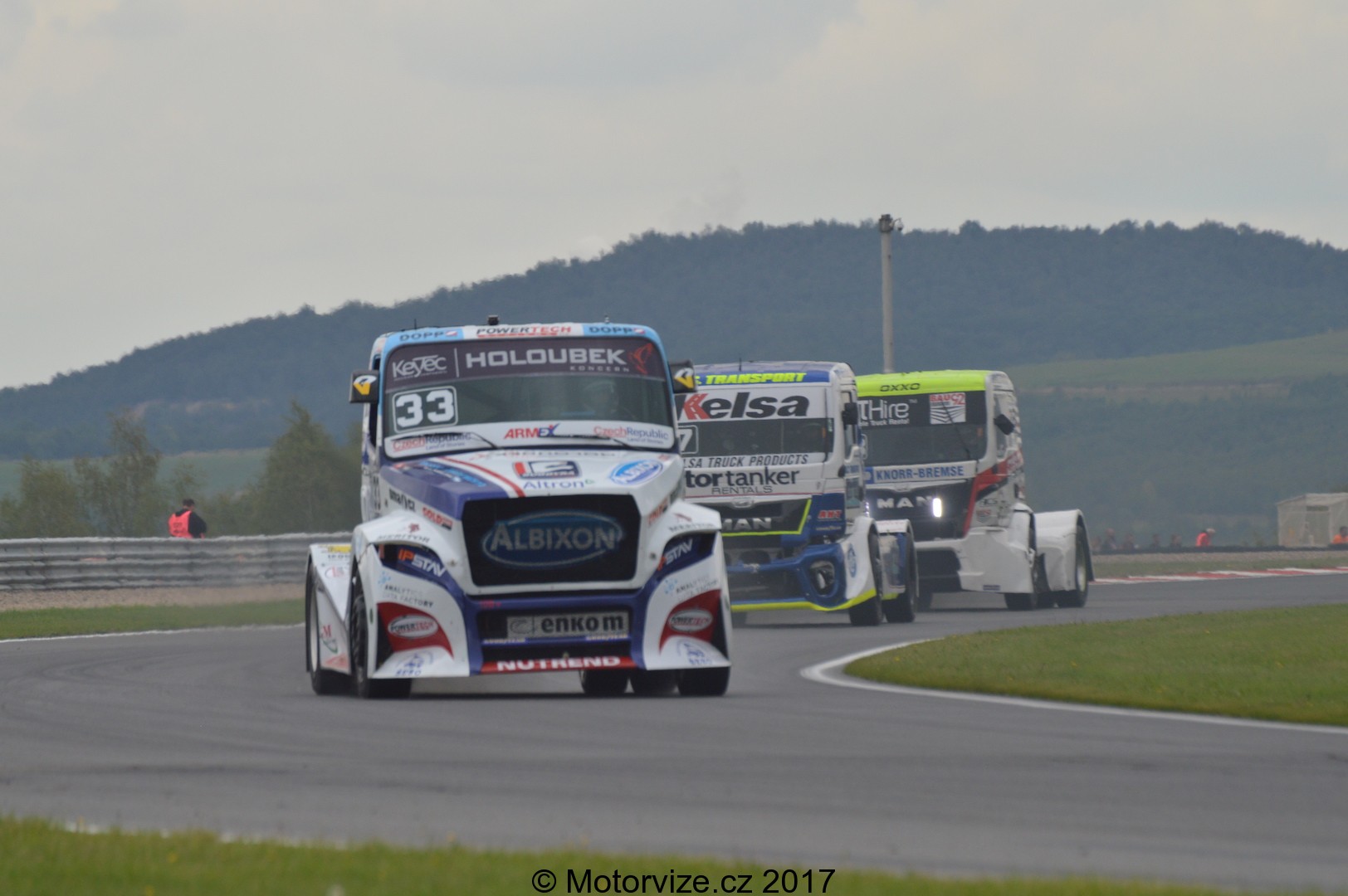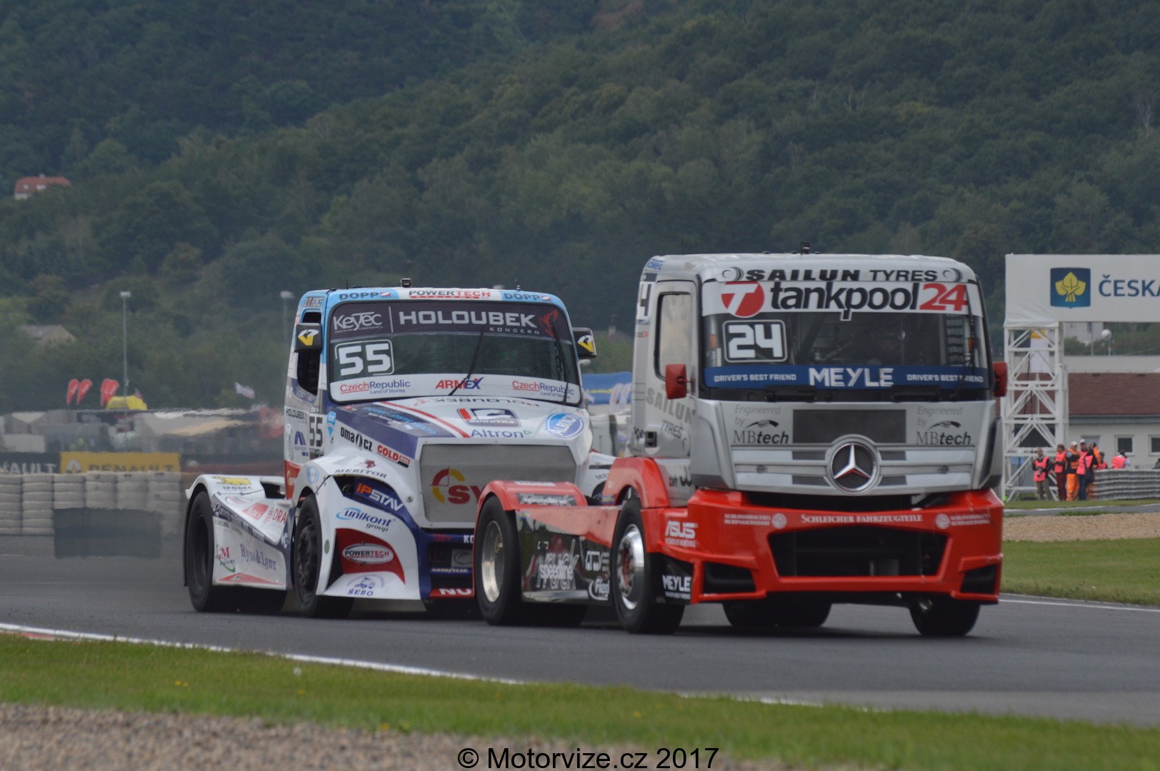 Vybavujete si mostecký okruh? Pokud jste nikdy nebyli na závodech tahačů právě tady, tak mi určitě dáte za pravdu, že si neumíte představit, jak se tihle obři napasují do první zatáčky. Těch prvních pár vteřin je rozhodně vždycky to nejzajímavější. Když už jsme mluvili o těch kvalifikacích, asi jsme pozapomněli na výsledky, které jsou pro nás o to důležitější, že Adam Lacko mohl startovat ze třetí příčky a David Vršecký ze druhé. Frankie Vojtíšek pak doplnil česká želízka v ohni z 12. Pozice. Další zvláštností, pokud jste ještě na trucích nebyli, je tzv. letmý start. Asi také vzhledem k jejich velikost a (ne)bezpečnosti se prostě závodníci nerovnají po zaváděcím kole znovu na startovní rošt, ale jedou všichni vedle sebe konstantní rychlostí a plný plyn mohou sešlápnout až na startovní čáře. Pak přichází teprve ten správný humbuk. K mému štěstí jsem viděl onboard záběr z jednoho z předních závodníků při startu do prvního závodu. Upřímně jsem nikdy nečekal, že by vůbec auta k sobě mohli být někdy tak blízko, natož ještě kamiony. Za mě opravdu velký klobouk dolů za všechny závodníky. Pojďme už ale konečně na závod, na ten první alespoň. Boj to byl rozhodně zajímavý. Adam Lacko, který mimochodem stále s přehledem vede letošní Evropský šampionát, nechal projevit svou dravost hned na startu. Všechno to vypadalo hodně nadějně. Pokud znáte mostecký autodrom, tak víte, že posledních zhruba 10 let se závodníci jako první musí popasovat s dvojící zatáček uspořádaných do tzv. šikany. To asi není nic neobvyklého, už na začátku tohoto odstavce jsem se rozepsal o podívané, jakou trucky v této sekci nabízí. Není asi moc jezdců, kteří by ji znali tak skvěle jako Adam, David či Frankie. I proto se naši drali ihned po startu dopředu. Adamovi na roudnické Buggyře se to na chvilku i podařilo, pak byl ale zablokován a na druhé místo se dral až v dalších kolech. Nakonec se mu to podařilo, stejně tak si o jednu pozici polepšil i týmový kolega David Vršecký. Pokud vám není znám formát druhého závodu, tak vás opět asi překvapím. První osmička se zrcadlově otáčí pro startovní příčky. I proto Adam startoval sedmý, David čtvrtý. V cíli z toho bylo čtvrté pro Adama, páté pak připadlo Davidovi. Mimochodem za celý závodní víkend musím smeknout i před dlouholetou startující, stálicí Stephanie Halm, která zvládla dvakrát obsadit podium a dvakrát čtvrté místo! Bravo!