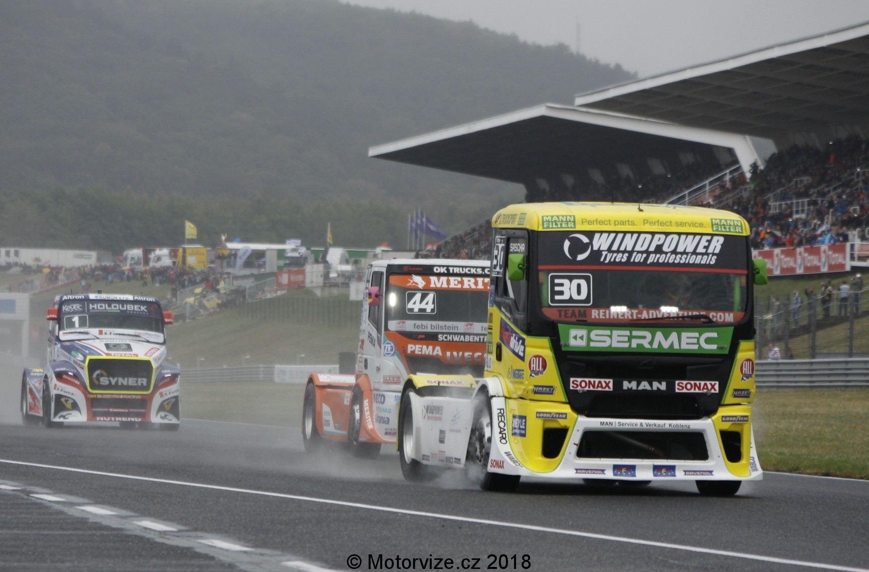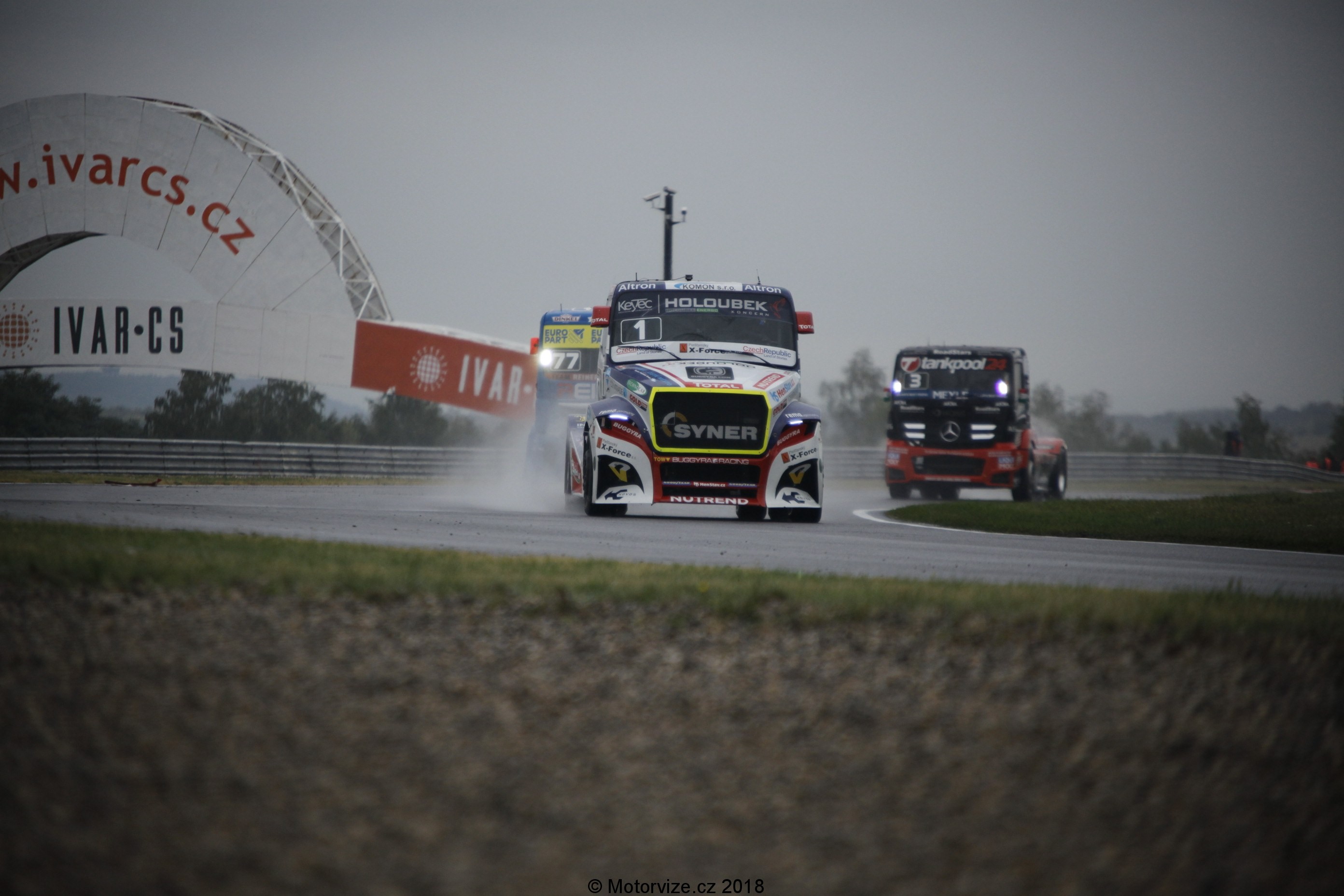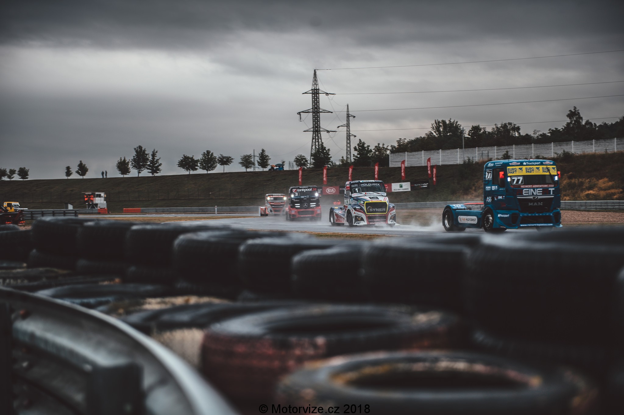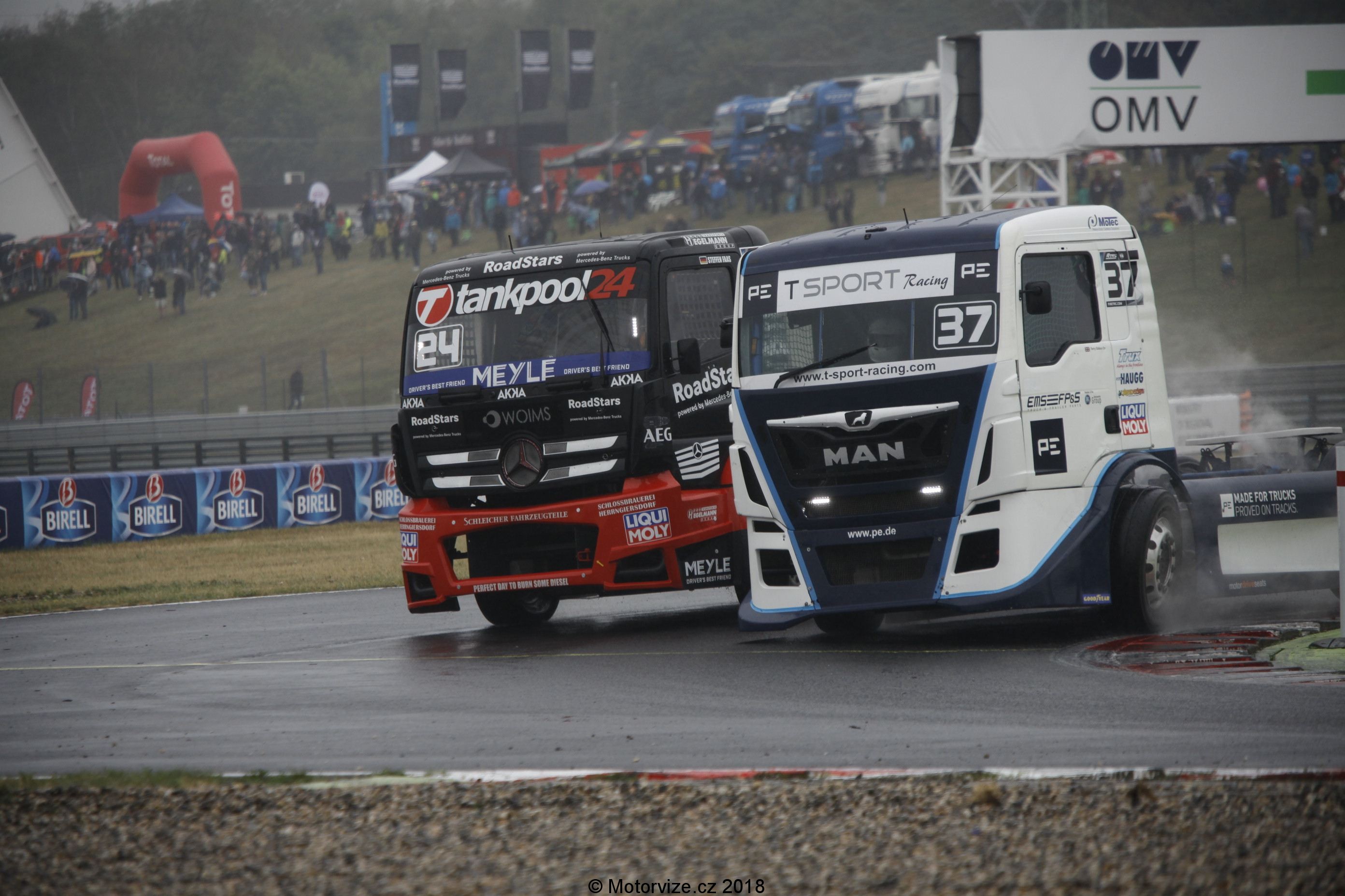 Jak zněla předpověď počasí a jak Murphyho zákony platí, opravdu se na nás novinářské štěstí neusmálo. Teda vlastně možná i trochu jo. Bylo sice celý den zataženo, místy pršelo, ale minimálně jednomu z nás to nevadilo – je jím Adam Lacko. Zajel sice v superpole kvalifikaci až osmý čas, vinou prohřešků jeho soupeřů ale startoval už ze čtvrté příčky. Vzhledem ke své velikosti jedou závodní Trucky závod v dešti pouze o 11 kolech, i proto neměl Adam moc času. A výsledek? Fandilo se do posledního dechu a vyšlo to. S přehledem bere první místo a stahuje náskok na prozatím letos zcela famózního Jochena Hahna. Promiňte, že jsem teď upustil od ostatních závodů či klání, která byla v plánu na dráhu mosteckého autodromu pro tento den. To, co přišlo v Trucích je prostě tak dominantní, že si dovoluji ostatní body programu prozatím zastínit. Čtyři závody v rámci ETRC (Mistroství Evropy tahačů) na pouhý jeden víkend sice zní poněkud náročně a hlavně divácky atraktivně, daní je ale poslední závod na hranici večera. Když však v sobotu odjíždíme z areálu až po šesté hodině večerní, vlastně se ani trochu nezlobím. Domu to mám sice ještě něco přes hodinu, ale rozhodně to za to stálo. Pravidlo obráceného startovního pořadí pro druhý závod tahačů není žádnou novinkou. Jen pro zopakování tedy jde o postavení prvních osmi na startovním roštu pro v pořadí druhý závod v každém dni, první osmička z předchozího klání se tak zrcadlově obrací pro další start. Jednoduché pro diváky, těžké ale pro závodníky, a to hlavně pro Adama Lacka. Netrvá však dlouho a… No co vám budu povídat – Antonio Albacete nechtěl pustit svou pozici a dostal se do kontaktu s favoritem, Jochenem Hahnem. Představte si, že jste na trati. Pár kol se vozíte na druhém místě a snažíte se zuby nehty držet nebo dokonce dotáhnout a předjet prvního. Pak ale přijde poslední zatáčka, vy zjistíte, že jste Adam Lacko a máte toho v Mostě odjeto pomalu nejvíce ze všech. Kdo je první v cíli? Přeci český závodník a velikán! Naprosto nádherným manévrem se Adam po vnějšku a hodně na hraně pravidel dostal před René Reinerta. Naštěstí už je to i přes jeden sražený patník oficiální – komisaři jej nepotrestali (i vzhledem k nulovému prostoru od protivníka) a my konečně můžeme s klidným svědomím říci: „BRAVO!“