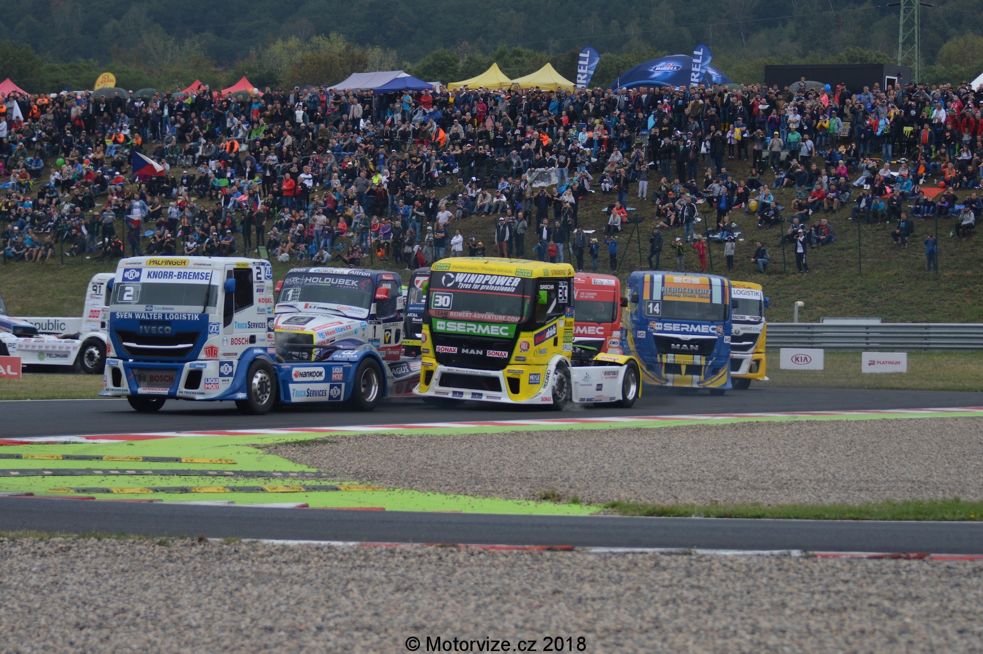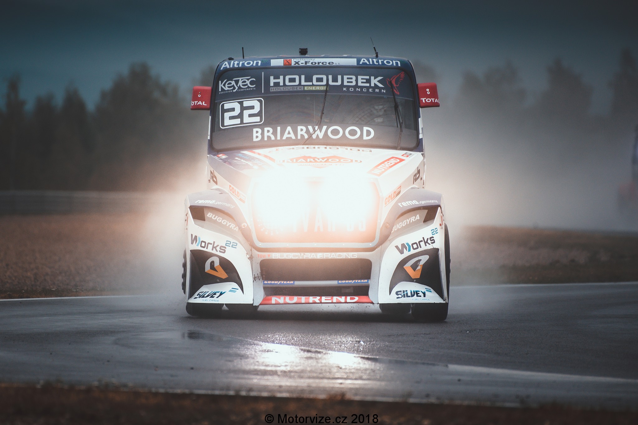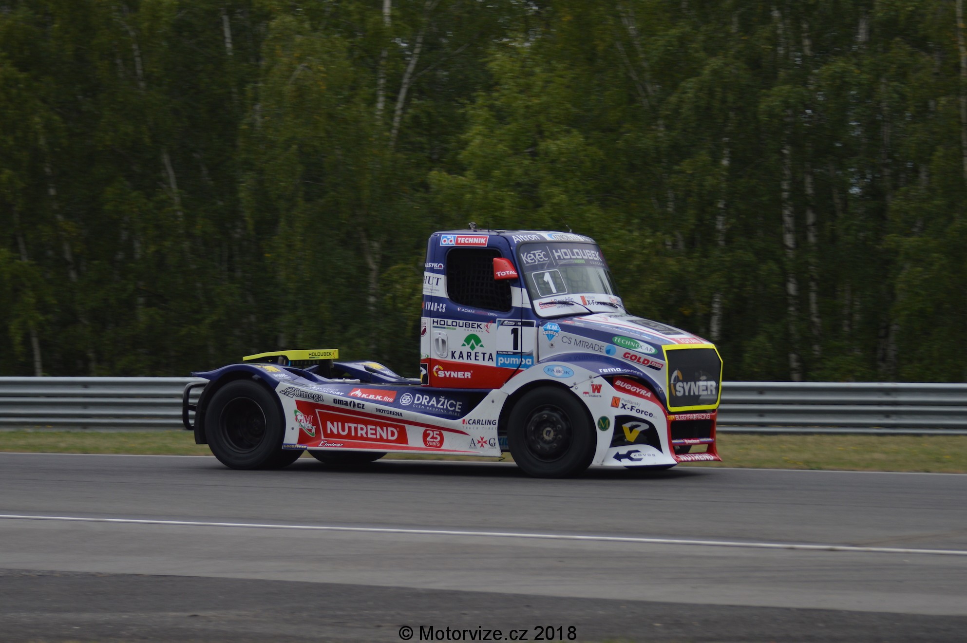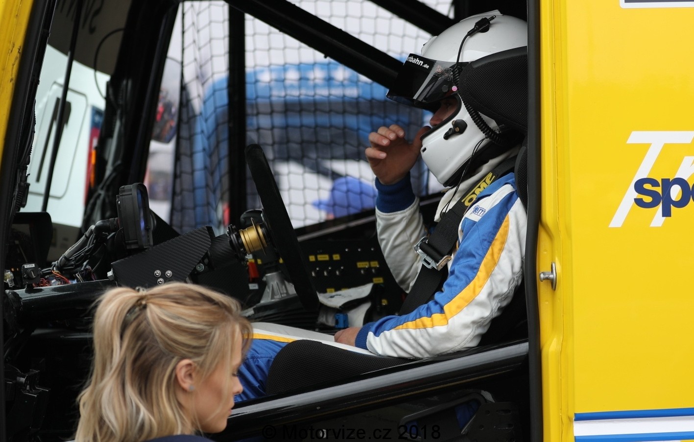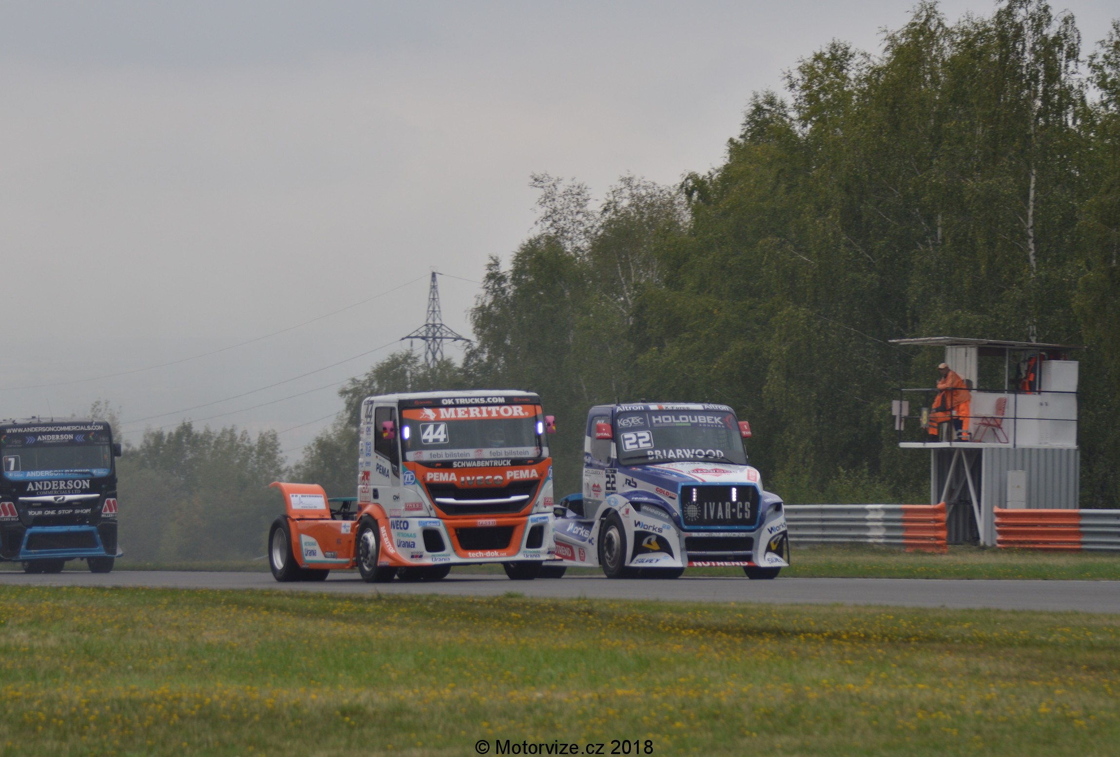 Jak zněla předpověď počasí a jak Murphyho zákony platí, opravdu se na nás novinářské štěstí neusmálo. Teda vlastně možná i trochu jo. Bylo sice celý den zataženo, místy pršelo, ale minimálně jednomu z nás to nevadilo – je jím Adam Lacko. Zajel sice v superpole kvalifikaci až osmý čas, vinou prohřešků jeho soupeřů ale startoval už ze čtvrté příčky. Vzhledem ke své velikosti jedou závodní Trucky závod v dešti pouze o 11 kolech, i proto neměl Adam moc času. A výsledek? Fandilo se do posledního dechu a vyšlo to. S přehledem bere první místo a stahuje náskok na prozatím letos zcela famózního Jochena Hahna. Promiňte, že jsem teď upustil od ostatních závodů či klání, která byla v plánu na dráhu mosteckého autodromu pro tento den. To, co přišlo v Trucích je prostě tak dominantní, že si dovoluji ostatní body programu prozatím zastínit. Čtyři závody v rámci ETRC (Mistroství Evropy tahačů) na pouhý jeden víkend sice zní poněkud náročně a hlavně divácky atraktivně, daní je ale poslední závod na hranici večera. Když však v sobotu odjíždíme z areálu až po šesté hodině večerní, vlastně se ani trochu nezlobím. Domu to mám sice ještě něco přes hodinu, ale rozhodně to za to stálo. Pravidlo obráceného startovního pořadí pro druhý závod tahačů není žádnou novinkou. Jen pro zopakování tedy jde o postavení prvních osmi na startovním roštu pro v pořadí druhý závod v každém dni, první osmička z předchozího klání se tak zrcadlově obrací pro další start. Jednoduché pro diváky, těžké ale pro závodníky, a to hlavně pro Adama Lacka. Netrvá však dlouho a… No co vám budu povídat – Antonio Albacete nechtěl pustit svou pozici a dostal se do kontaktu s favoritem, Jochenem Hahnem. Představte si, že jste na trati. Pár kol se vozíte na druhém místě a snažíte se zuby nehty držet nebo dokonce dotáhnout a předjet prvního. Pak ale přijde poslední zatáčka, vy zjistíte, že jste Adam Lacko a máte toho v Mostě odjeto pomalu nejvíce ze všech. Kdo je první v cíli? Přeci český závodník a velikán! Naprosto nádherným manévrem se Adam po vnějšku a hodně na hraně pravidel dostal před René Reinerta. Naštěstí už je to i přes jeden sražený patník oficiální – komisaři jej nepotrestali (i vzhledem k nulovému prostoru od protivníka) a my konečně můžeme s klidným svědomím říci: „BRAVO!“