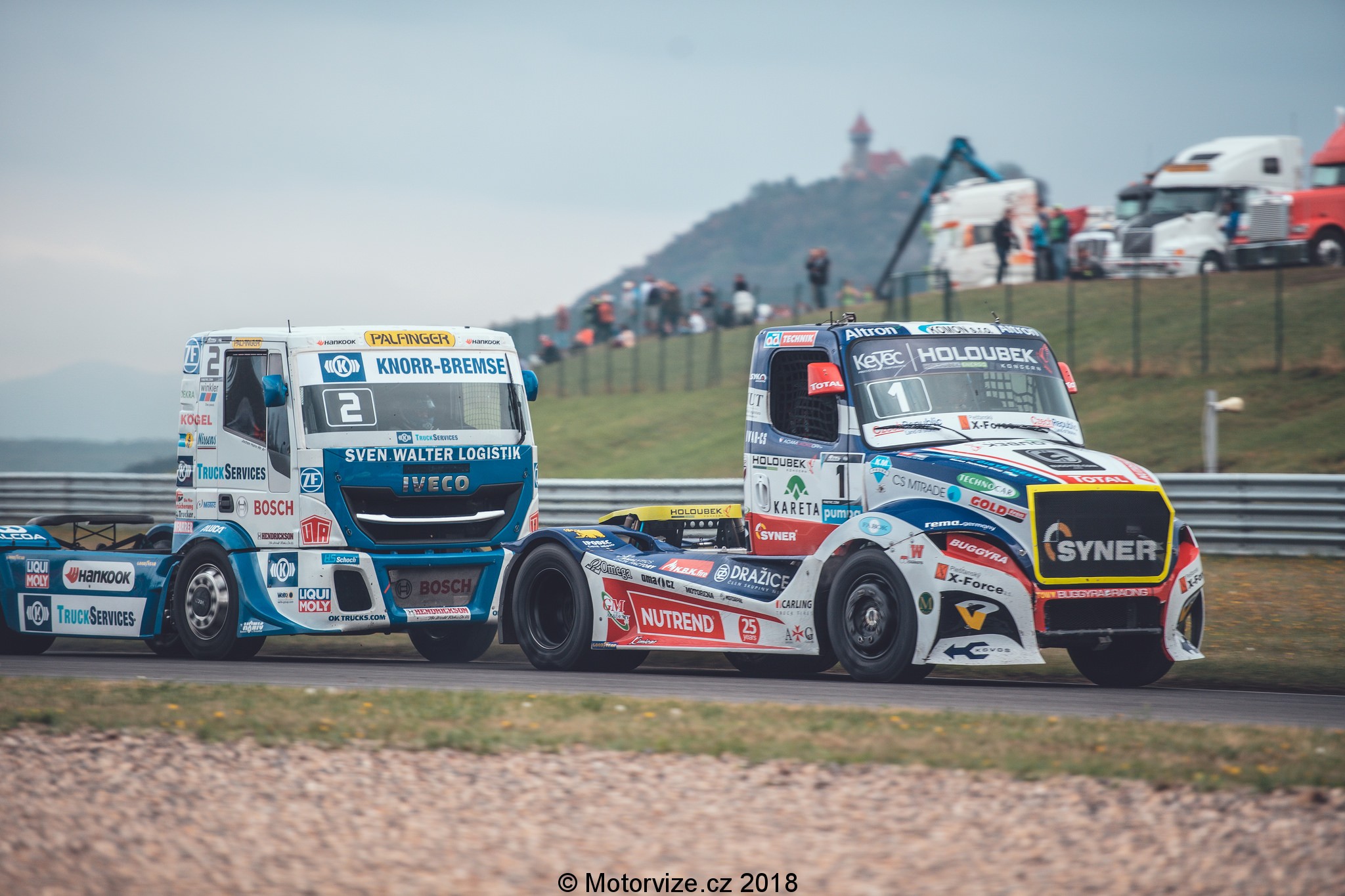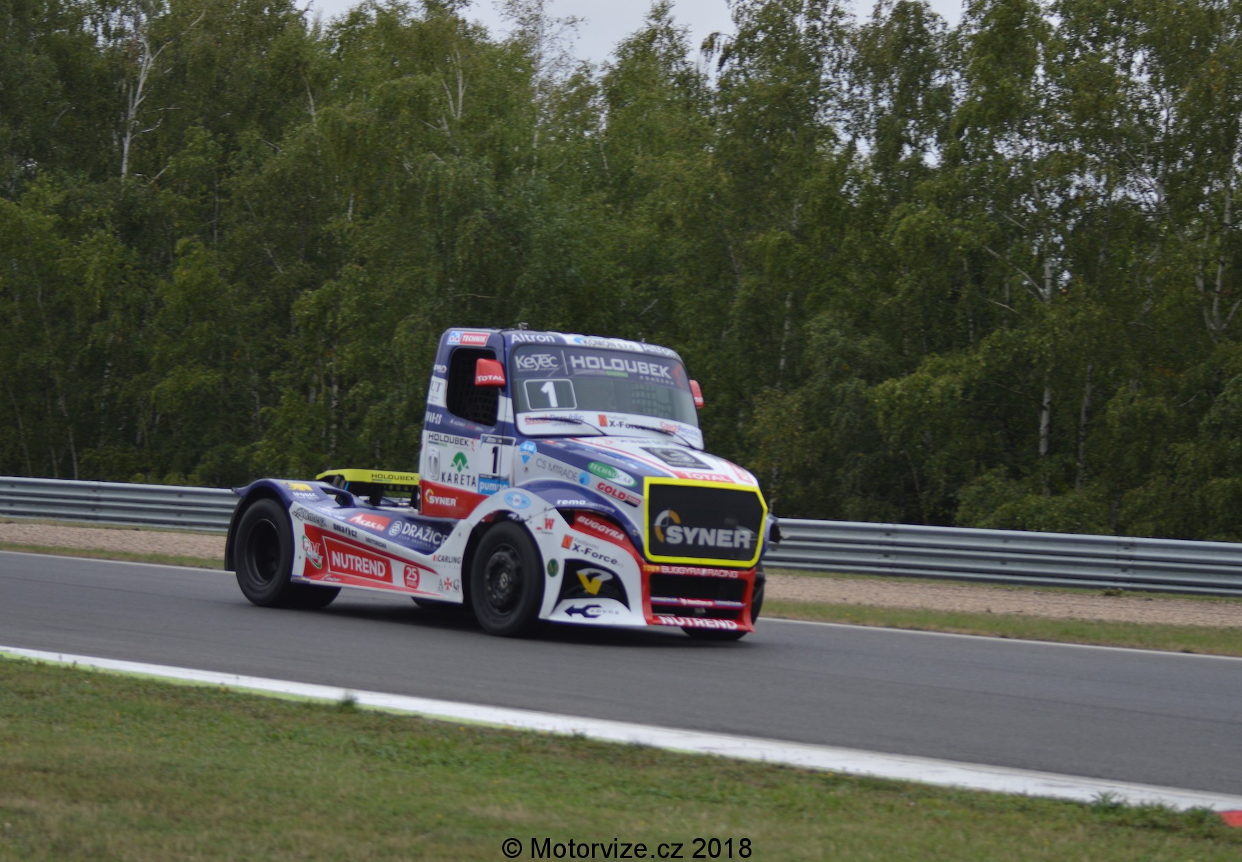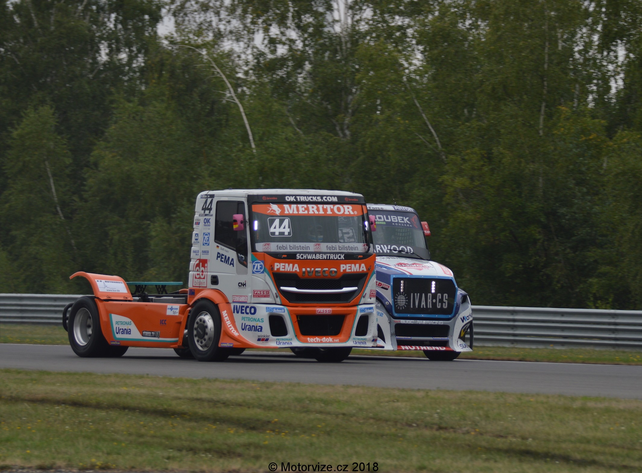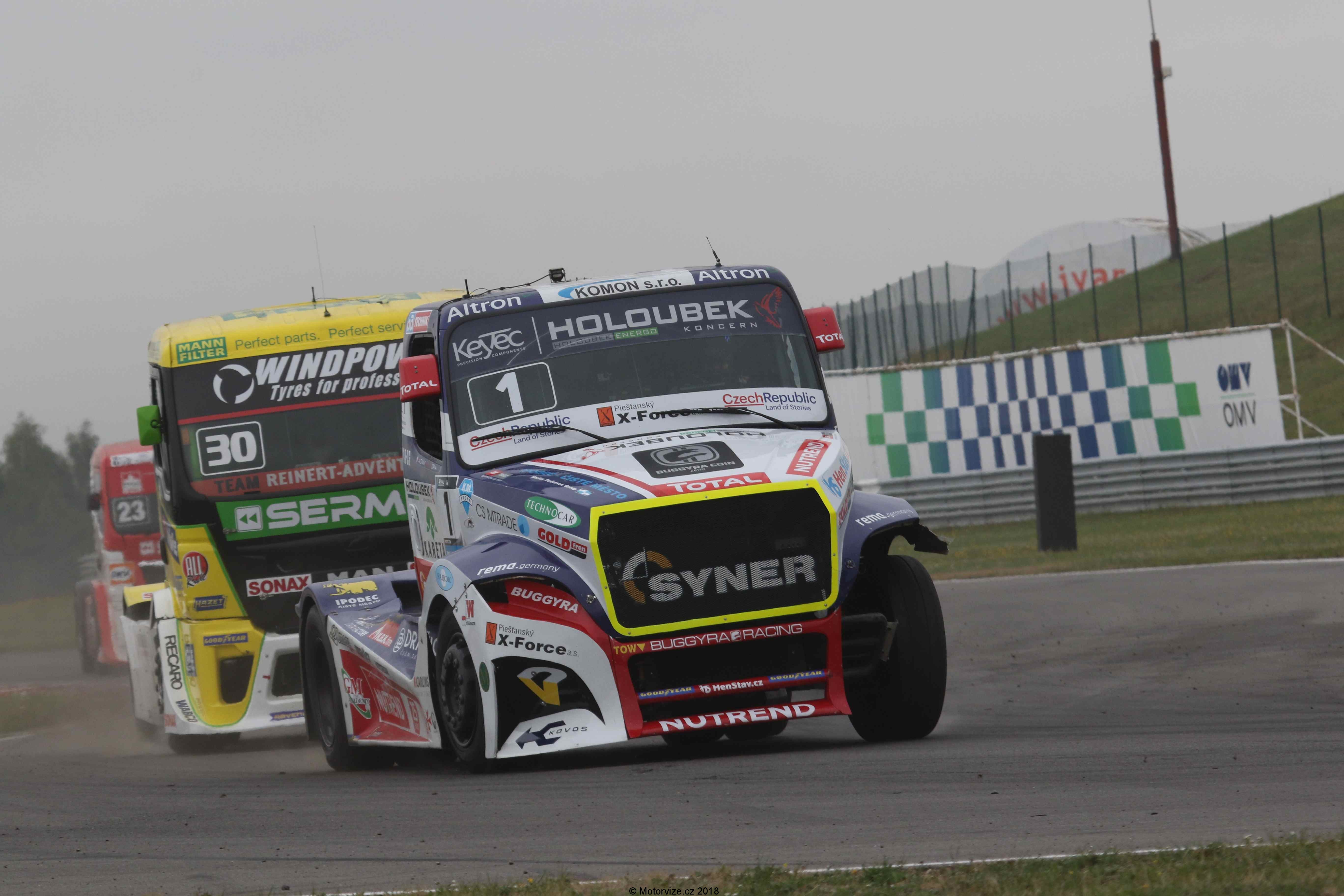Jak zněla předpověď počasí a jak Murphyho zákony platí, opravdu se na nás novinářské štěstí neusmálo. Teda vlastně možná i trochu jo. Bylo sice celý den zataženo, místy pršelo, ale minimálně jednomu z nás to nevadilo – je jím Adam Lacko. Zajel sice v superpole kvalifikaci až osmý čas, vinou prohřešků jeho soupeřů ale startoval už ze čtvrté příčky. Vzhledem ke své velikosti jedou závodní Trucky závod v dešti pouze o 11 kolech, i proto neměl Adam moc času. A výsledek? Fandilo se do posledního dechu a vyšlo to. S přehledem bere první místo a stahuje náskok na prozatím letos zcela famózního Jochena Hahna. Promiňte, že jsem teď upustil od ostatních závodů či klání, která byla v plánu na dráhu mosteckého autodromu pro tento den. To, co přišlo v Trucích je prostě tak dominantní, že si dovoluji ostatní body programu prozatím zastínit. Čtyři závody v rámci ETRC (Mistroství Evropy tahačů) na pouhý jeden víkend sice zní poněkud náročně a hlavně divácky atraktivně, daní je ale poslední závod na hranici večera. Když však v sobotu odjíždíme z areálu až po šesté hodině večerní, vlastně se ani trochu nezlobím. Domu to mám sice ještě něco přes hodinu, ale rozhodně to za to stálo. Pravidlo obráceného startovního pořadí pro druhý závod tahačů není žádnou novinkou. Jen pro zopakování tedy jde o postavení prvních osmi na startovním roštu pro v pořadí druhý závod v každém dni, první osmička z předchozího klání se tak zrcadlově obrací pro další start. Jednoduché pro diváky, těžké ale pro závodníky, a to hlavně pro Adama Lacka. Netrvá však dlouho a… No co vám budu povídat – Antonio Albacete nechtěl pustit svou pozici a dostal se do kontaktu s favoritem, Jochenem Hahnem. Představte si, že jste na trati. Pár kol se vozíte na druhém místě a snažíte se zuby nehty držet nebo dokonce dotáhnout a předjet prvního. Pak ale přijde poslední zatáčka, vy zjistíte, že jste Adam Lacko a máte toho v Mostě odjeto pomalu nejvíce ze všech. Kdo je první v cíli? Přeci český závodník a velikán! Naprosto nádherným manévrem se Adam po vnějšku a hodně na hraně pravidel dostal před René Reinerta. Naštěstí už je to i přes jeden sražený patník oficiální – komisaři jej nepotrestali (i vzhledem k nulovému prostoru od protivníka) a my konečně můžeme s klidným svědomím říci: „BRAVO!“