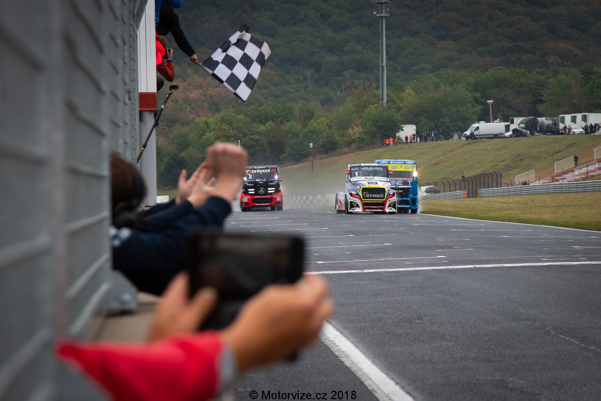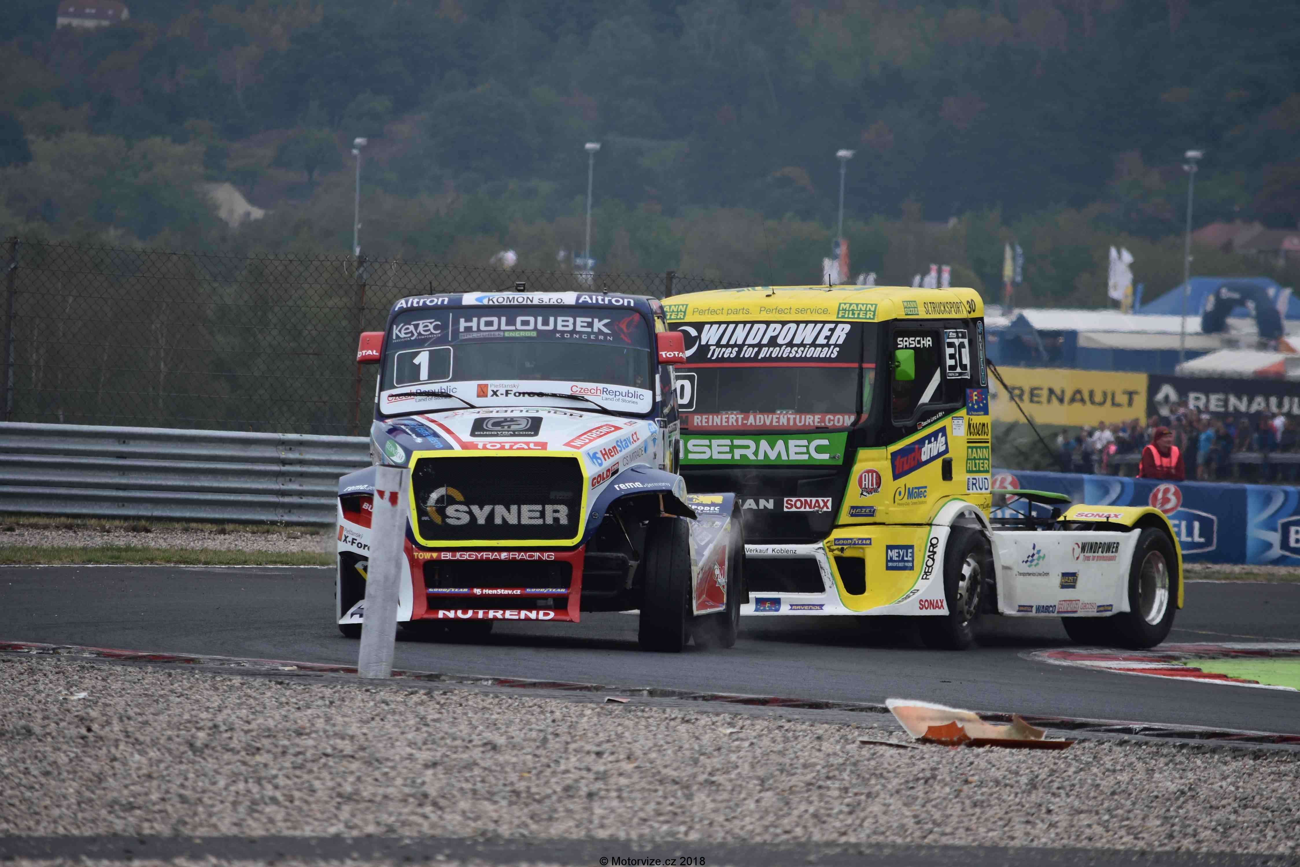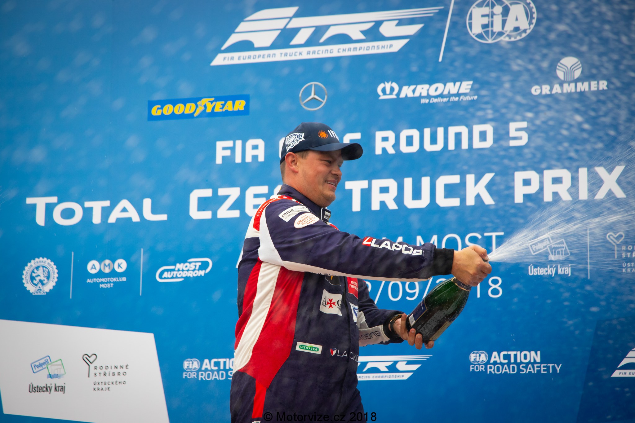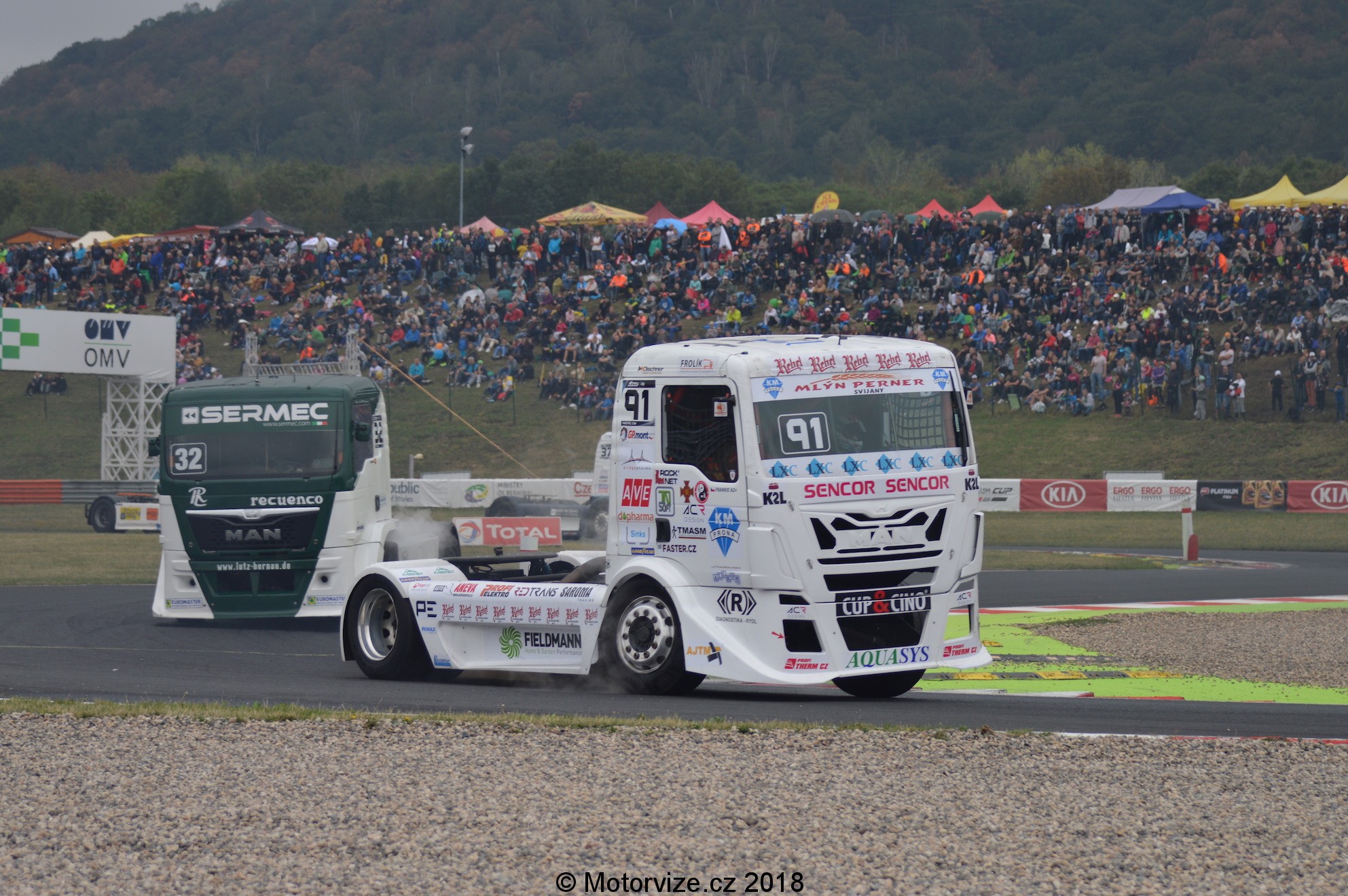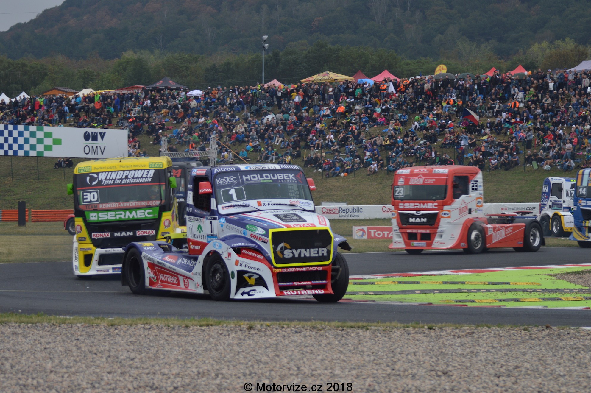 Jak zněla předpověď počasí a jak Murphyho zákony platí, opravdu se na nás novinářské štěstí neusmálo. Teda vlastně možná i trochu jo. Bylo sice celý den zataženo, místy pršelo, ale minimálně jednomu z nás to nevadilo – je jím Adam Lacko. Zajel sice v superpole kvalifikaci až osmý čas, vinou prohřešků jeho soupeřů ale startoval už ze čtvrté příčky. Vzhledem ke své velikosti jedou závodní Trucky závod v dešti pouze o 11 kolech, i proto neměl Adam moc času. A výsledek? Fandilo se do posledního dechu a vyšlo to. S přehledem bere první místo a stahuje náskok na prozatím letos zcela famózního Jochena Hahna. Promiňte, že jsem teď upustil od ostatních závodů či klání, která byla v plánu na dráhu mosteckého autodromu pro tento den. To, co přišlo v Trucích je prostě tak dominantní, že si dovoluji ostatní body programu prozatím zastínit. Čtyři závody v rámci ETRC (Mistroství Evropy tahačů) na pouhý jeden víkend sice zní poněkud náročně a hlavně divácky atraktivně, daní je ale poslední závod na hranici večera. Když však v sobotu odjíždíme z areálu až po šesté hodině večerní, vlastně se ani trochu nezlobím. Domu to mám sice ještě něco přes hodinu, ale rozhodně to za to stálo. Pravidlo obráceného startovního pořadí pro druhý závod tahačů není žádnou novinkou. Jen pro zopakování tedy jde o postavení prvních osmi na startovním roštu pro v pořadí druhý závod v každém dni, první osmička z předchozího klání se tak zrcadlově obrací pro další start. Jednoduché pro diváky, těžké ale pro závodníky, a to hlavně pro Adama Lacka. Netrvá však dlouho a… No co vám budu povídat – Antonio Albacete nechtěl pustit svou pozici a dostal se do kontaktu s favoritem, Jochenem Hahnem. Představte si, že jste na trati. Pár kol se vozíte na druhém místě a snažíte se zuby nehty držet nebo dokonce dotáhnout a předjet prvního. Pak ale přijde poslední zatáčka, vy zjistíte, že jste Adam Lacko a máte toho v Mostě odjeto pomalu nejvíce ze všech. Kdo je první v cíli? Přeci český závodník a velikán! Naprosto nádherným manévrem se Adam po vnějšku a hodně na hraně pravidel dostal před René Reinerta. Naštěstí už je to i přes jeden sražený patník oficiální – komisaři jej nepotrestali (i vzhledem k nulovému prostoru od protivníka) a my konečně můžeme s klidným svědomím říci: „BRAVO!“