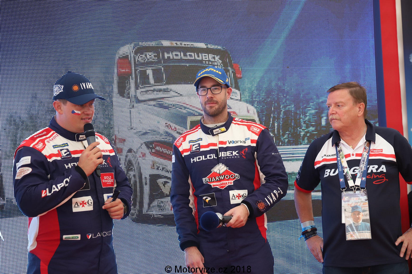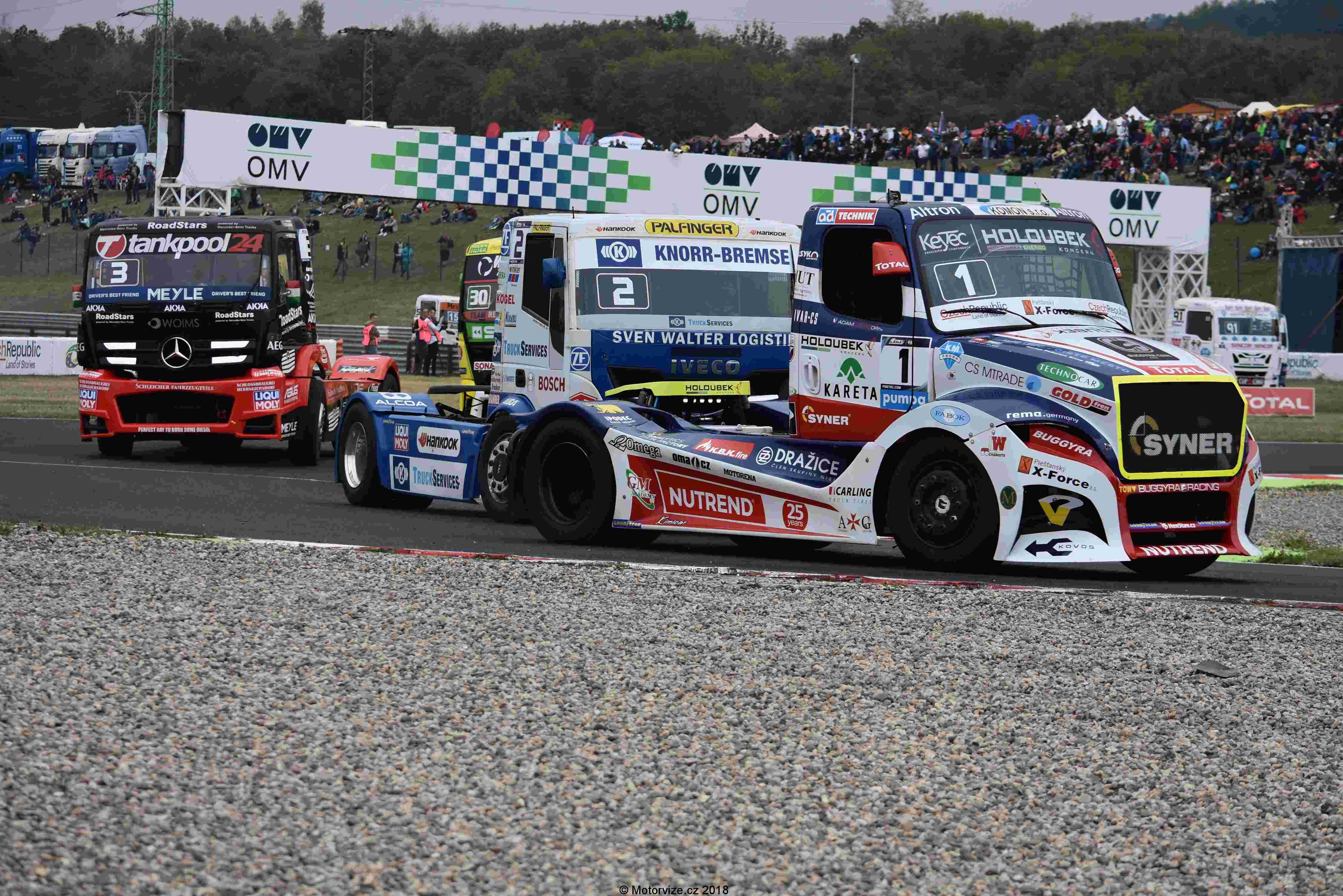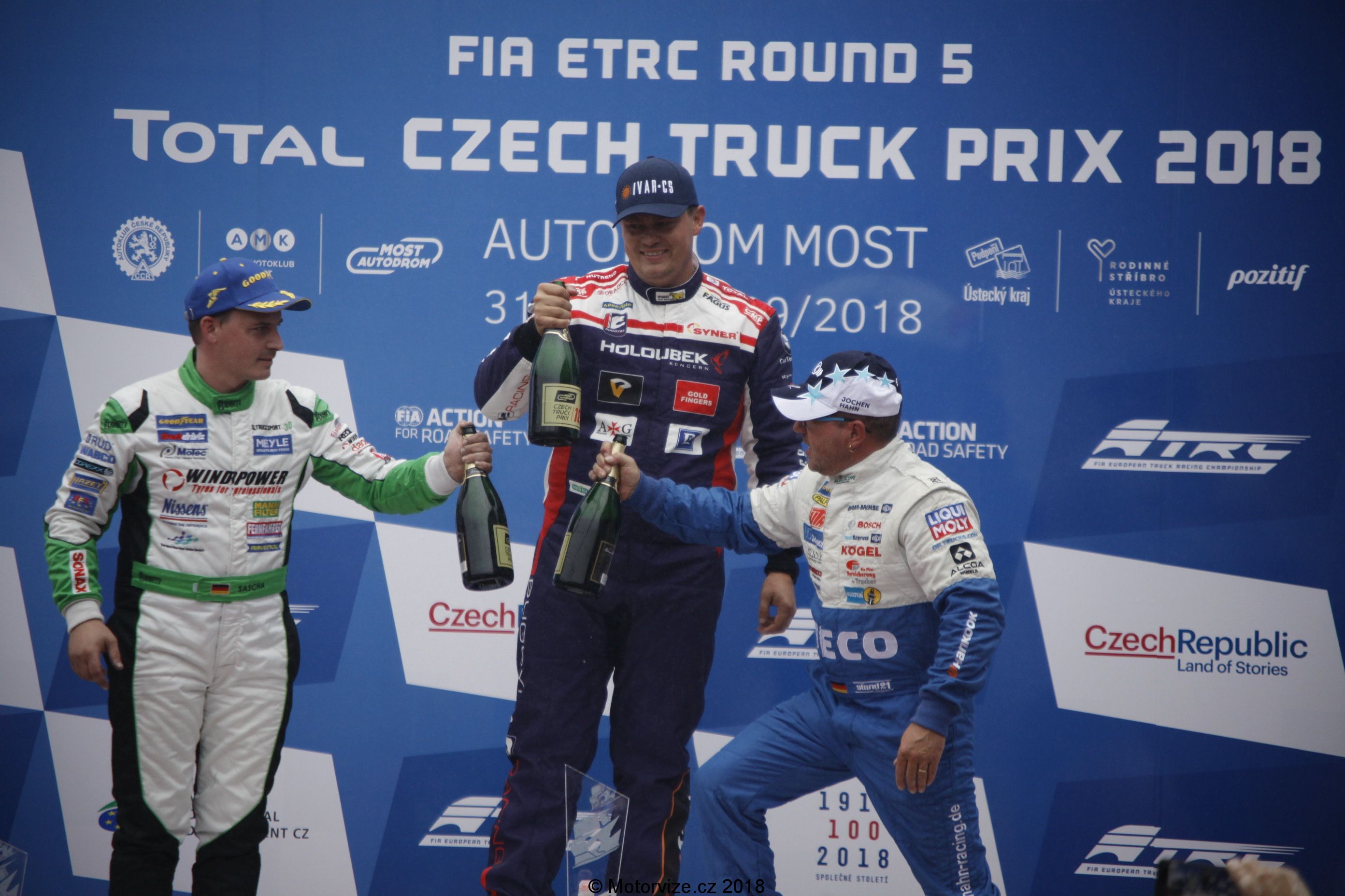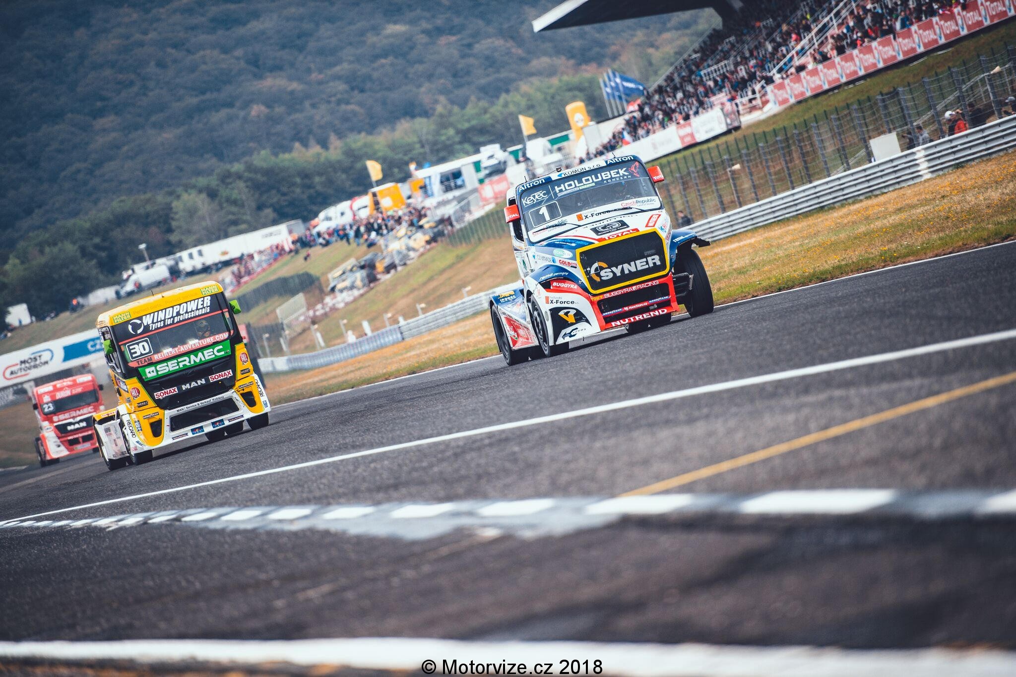 Jak zněla předpověď počasí a jak Murphyho zákony platí, opravdu se na nás novinářské štěstí neusmálo. Teda vlastně možná i trochu jo. Bylo sice celý den zataženo, místy pršelo, ale minimálně jednomu z nás to nevadilo – je jím Adam Lacko. Zajel sice v superpole kvalifikaci až osmý čas, vinou prohřešků jeho soupeřů ale startoval už ze čtvrté příčky. Vzhledem ke své velikosti jedou závodní Trucky závod v dešti pouze o 11 kolech, i proto neměl Adam moc času. A výsledek? Fandilo se do posledního dechu a vyšlo to. S přehledem bere první místo a stahuje náskok na prozatím letos zcela famózního Jochena Hahna. Promiňte, že jsem teď upustil od ostatních závodů či klání, která byla v plánu na dráhu mosteckého autodromu pro tento den. To, co přišlo v Trucích je prostě tak dominantní, že si dovoluji ostatní body programu prozatím zastínit. Čtyři závody v rámci ETRC (Mistroství Evropy tahačů) na pouhý jeden víkend sice zní poněkud náročně a hlavně divácky atraktivně, daní je ale poslední závod na hranici večera. Když však v sobotu odjíždíme z areálu až po šesté hodině večerní, vlastně se ani trochu nezlobím. Domu to mám sice ještě něco přes hodinu, ale rozhodně to za to stálo. Pravidlo obráceného startovního pořadí pro druhý závod tahačů není žádnou novinkou. Jen pro zopakování tedy jde o postavení prvních osmi na startovním roštu pro v pořadí druhý závod v každém dni, první osmička z předchozího klání se tak zrcadlově obrací pro další start. Jednoduché pro diváky, těžké ale pro závodníky, a to hlavně pro Adama Lacka. Netrvá však dlouho a… No co vám budu povídat – Antonio Albacete nechtěl pustit svou pozici a dostal se do kontaktu s favoritem, Jochenem Hahnem. Představte si, že jste na trati. Pár kol se vozíte na druhém místě a snažíte se zuby nehty držet nebo dokonce dotáhnout a předjet prvního. Pak ale přijde poslední zatáčka, vy zjistíte, že jste Adam Lacko a máte toho v Mostě odjeto pomalu nejvíce ze všech. Kdo je první v cíli? Přeci český závodník a velikán! Naprosto nádherným manévrem se Adam po vnějšku a hodně na hraně pravidel dostal před René Reinerta. Naštěstí už je to i přes jeden sražený patník oficiální – komisaři jej nepotrestali (i vzhledem k nulovému prostoru od protivníka) a my konečně můžeme s klidným svědomím říci: „BRAVO!“