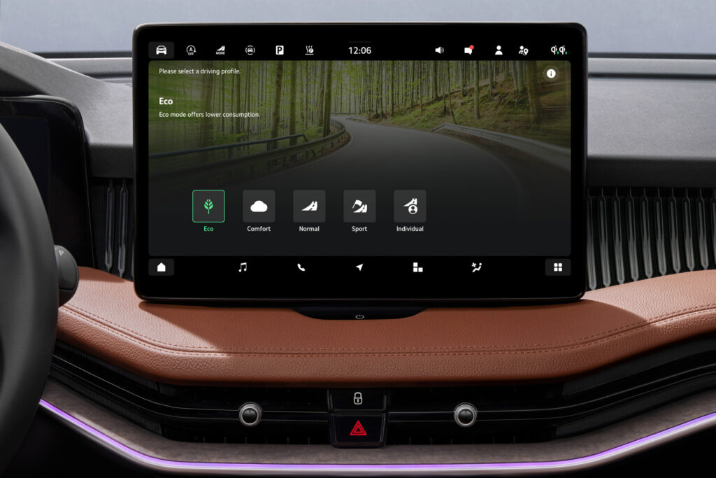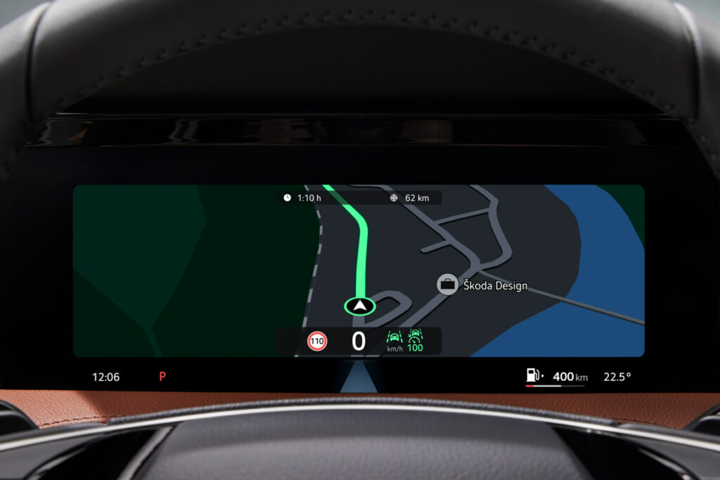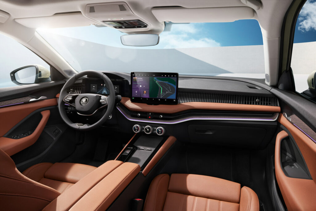 Interiéru dominuje volně stojící obrazovka infotainmentu, která je u modelu Superb takto umístěna poprvé, a nová středová konzola s velmi čistým designem. Jumbo Box má nyní celkový objem 5,5 l. Ovládání dotykové obrazovky infotainmentu s úhlopříčkou 10″ nebo 13″ palců je snadné a pohodlné díky opěrce ruky. Standardní infotainment s centrálním dotykovým displejem o úhlopříčce 10″ nabízí příjem rádia DAB+ a ovládání gesty nebo hlasem. Infotainment s obrazovkou o úhlopříčce 13″ nabízí funkce navigace nebo online rádia. 10″ virtuální kokpit je součástí standardní výbavy.