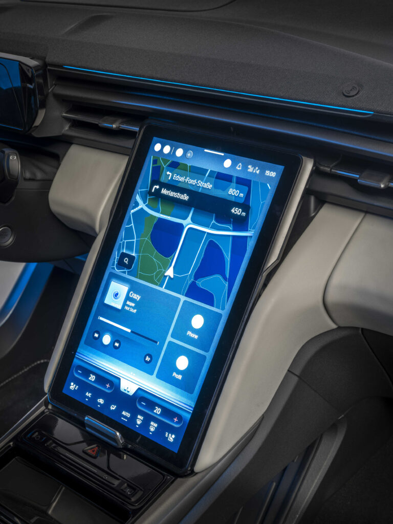 Největším wau efektem, kromě vzhledu, je určitě rozměrná pohyblivá dotyková obrazovka SYNC Move. Jedná se o online infotainment s akustikou přizpůsobenou interiéru. Displej nabízí také bezdrátovou integraci aplikací a pokročilé asistenční technologie. Bezdrátové propojení Apple CarPlay a Android Auto jsou již samozřejmostí. Kromě USB připojení se v kabině také nachází přihrádka pro dva velké telefony. Plochy navíc disponují bezdrátovým nabíjením.