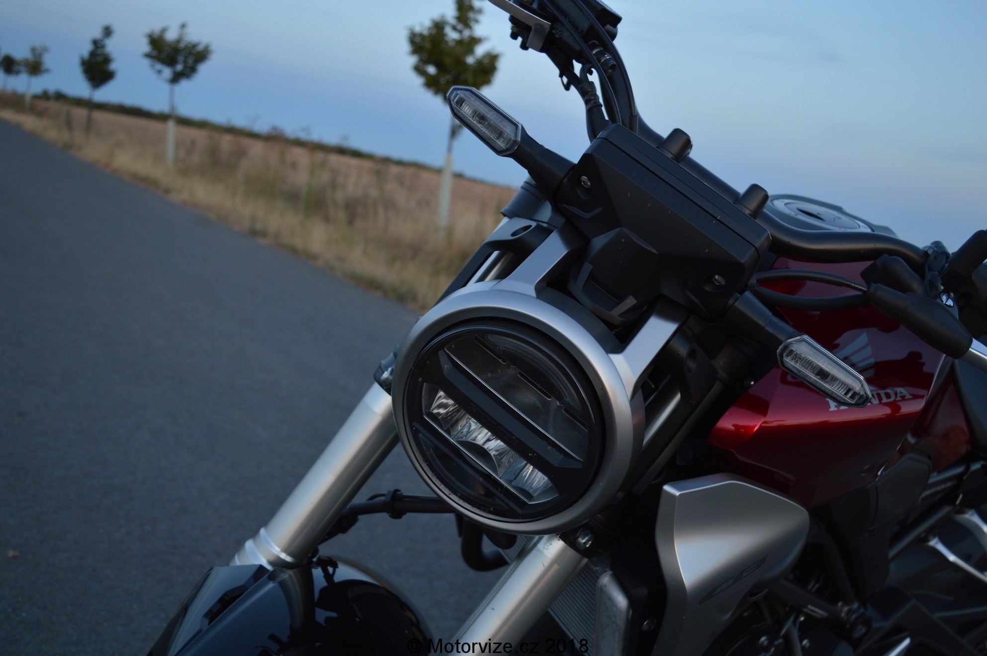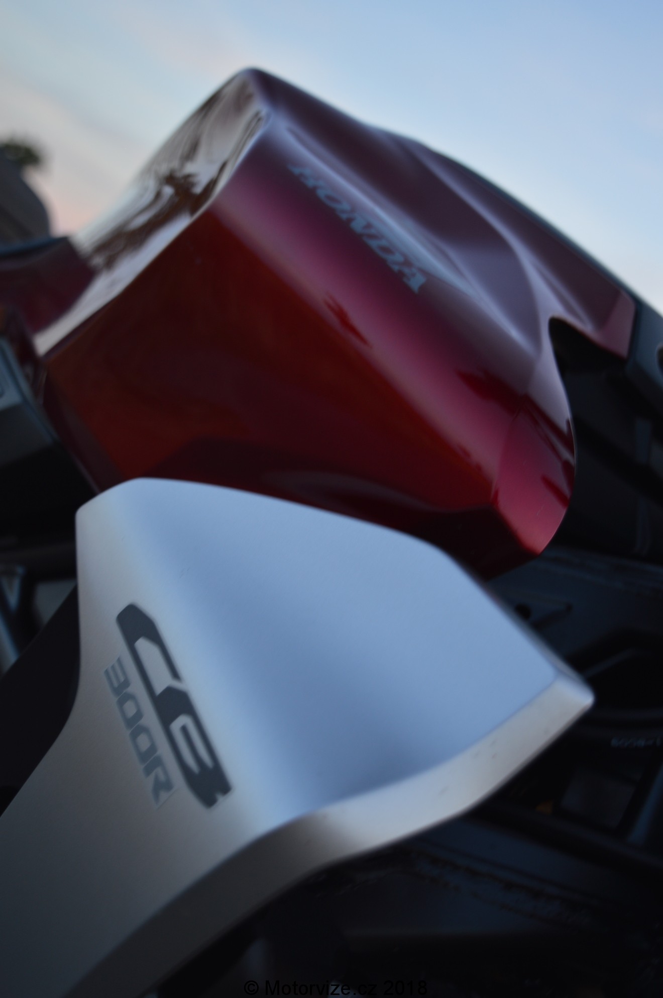 Když k motorce přicházím, prvotní slova by asi zněla zhruba takto: „Hmm… Nad očekávání dospělá motorka.“ Narovinu totiž, pokud podepisujete předávací protokol na cokoliv s obsahem 300 ccm, nečekáte asi nic vyloženě velkého. Možná si i říkáte, že půjde spíše o hračku. Tou koneckonců tak trochu tohle „cébéčko“ je, vůbec tak ale nevypadá. Pokud bych si snad měl ještě vzpomenout na svou první „dvácu“, nedokázal bych s ní po této stránce dnes testovaný exemplář vůbec srovnat. Na první pohled zároveň působí i vcelku moderně. Líbí se mi také povedená barevná kombinace nebo řešení svítilen pouze LED světly. Zajímavé je pak řešení blinkrů, ne že bych se tentokrát divil využití LED technologie, novinkou je však funkce „pozičního“ světla. LEDka v blinkrech má totiž dvojí svítivost i funkcionalitu. Dokud nezapnete směrové světlo, svítí se sníženým svitem oranžově podobně, jako je tomu u americký vozů. Posouzení, zda-li jde o pozitivum či nikoliv, už nechám zcela na vás. Nebýt předávajícího, asi by mě u „naháče“ ani nenapadlo, že design má představovat i retro styl. Po chvilce jsem mu ale musel dát za pravdu. Navíc musím uznat, že tohle retro je opravdu „šik“.