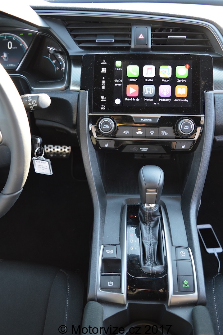 Musím se přiznat, že downsizing není úplně mým šálkem kávy. Mám raději větší motory, které jsou již nějak prověřené. I když jsem odpůrce jednolitrů jako takových, v Civicovi s jeho automatem mi docela i padne! Je to obdivuhodné, když můžeme zmínit, že se jedná o první přeplňovaný motor v Civicovi (opomineme-li předchozí Type-R). A jak jistě víte, premiéra nemusí být hnedka ta nejpovedenější. Možná by bylo dobré přidat přídomek „do města jako dělaný“ a na dálnici nebrat. Ve městě si užijete plnohodnotný zážitek a možná ani nepoznáte, že se jedná „jen“ o jednolitr. Auto se chová klidně a nevytáčí se do vysokých otáček, můžeme říci, že variátor se chová naprosto klidně jako používanější dvouspojka. Když pak dostane člověk chuť dostat ze sebe eso v rukávu, podrží ho skvělý podvozek. Variátor začne možná až zbytečně motor točit, ten je pak až zbytečně hlučný, a to i na dálnici, kde překročení 130ky jako by se mu líbilo. V průběhu testu jsme se snažili jet tzv. na spotřebu a s vozem jsme se dostali na 7,1l/100km. Při svižnější jízdě se budete pohybovat spíše okolo 8 l/100km. Takže nejde o žádný velký rozdíl a pokud tedy měníte nálady jako letošní počasí, tak můžete jezdit v průměru za 7,5. To není v zásadě ani málo ani hodně. Je to při nejmenším hodně daleko od udávané spotřeby, ale na benzín o výkonu okolo 100kw to rozhodně špatná hodnota není.