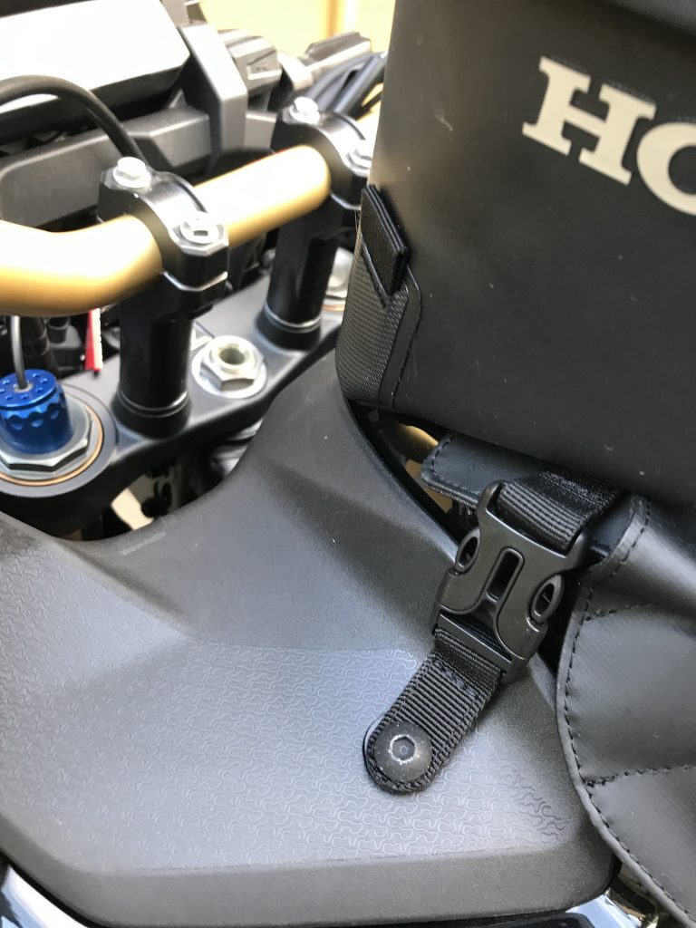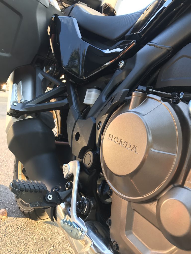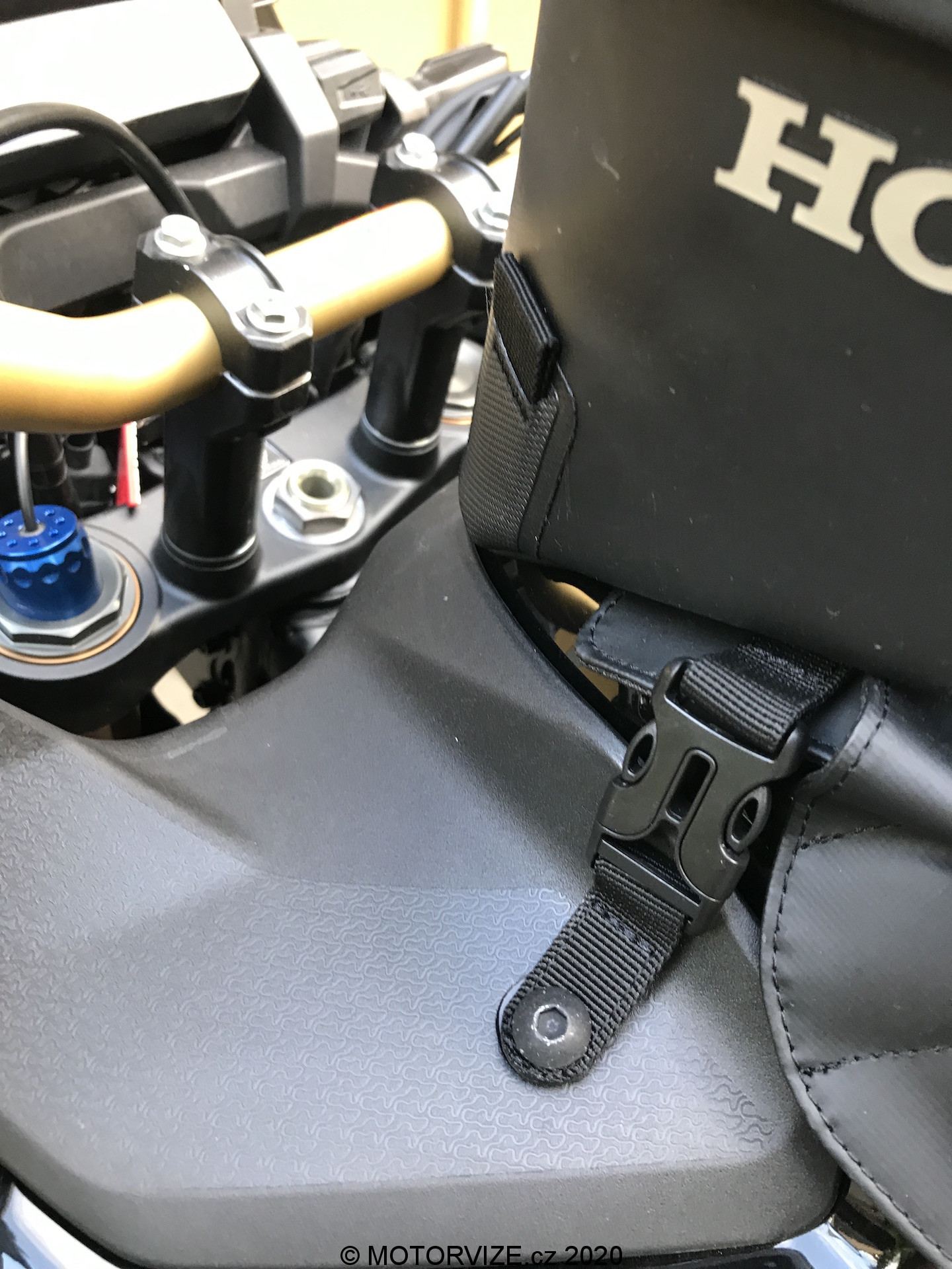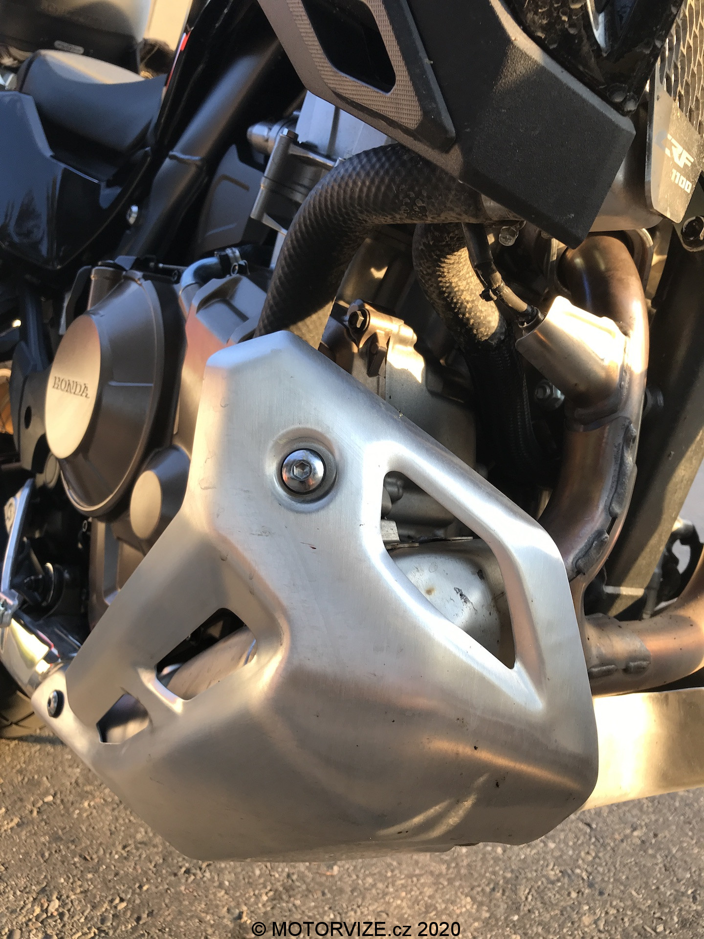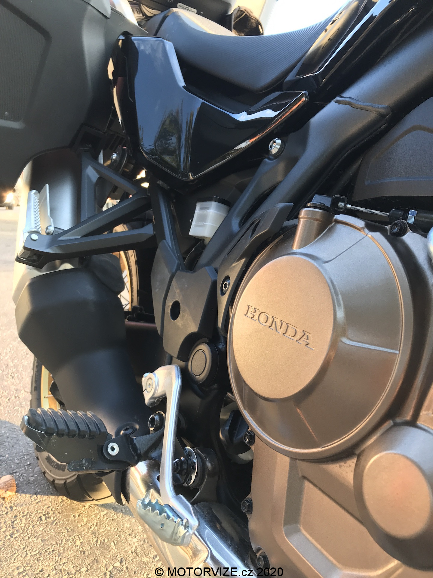 Další den jsem si jel vyzkoušet, jak se motorka chová mimo asfalt. Očekávání jsem měl hodně vysoko. Polňačky, šotolina a trochu bahna a kamení by mělo být přesně to, kde je Afrika doma. A motorka rozhodně nezklamala. Naopak, očekávání překonala. Všechno fungovalo tak, jak má a je jasné, že ten, kdo připravoval standardní nastavení motorky, věděl, co dělá. V podstatě jsem si hrál jen s kontrolou trakce, plynem a spojkou. Víc nebylo potřeba. Odpružení skvěle žehlí nerovnosti a motorka je pořád krásně ovladatelná a to i ve dvou lidech. Když už musíte do stupaček, máte se do čeho opřít. Stupačky jsou masivní a pevné, k celkově dobrému dojmu přispívá i dobře tvarovaná nádrž. Zde jen malá poznámka. Pro jezdce je tvar super, ale pro baťůžek už je docela daleko a při brždění tak budete mít občas na zádech otlačenou helmu.