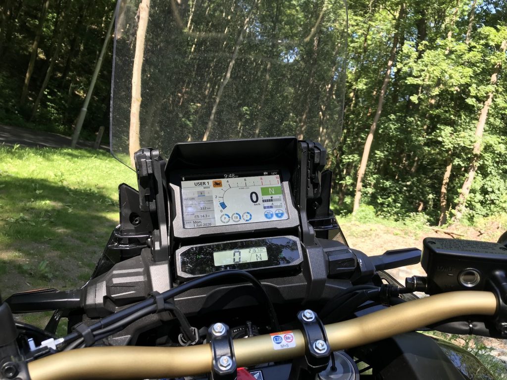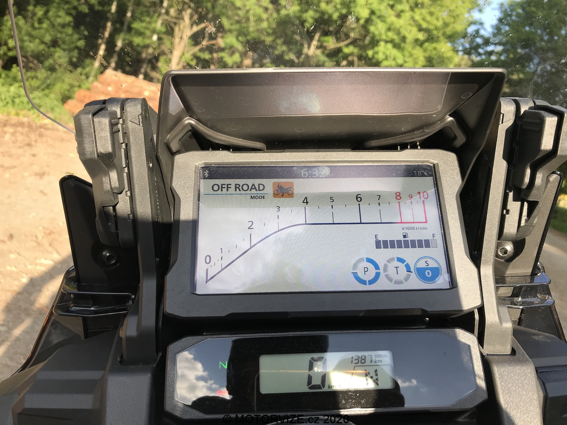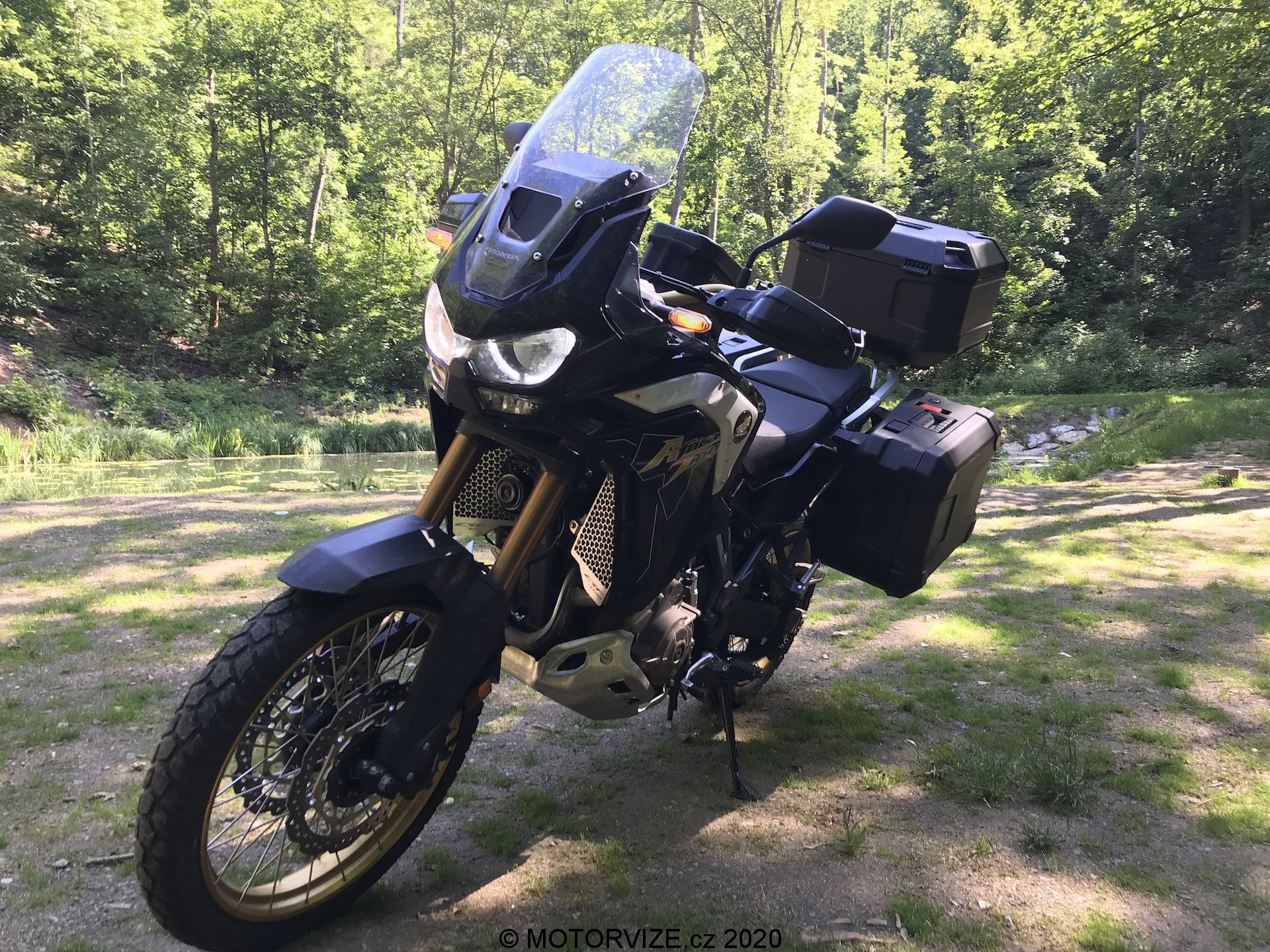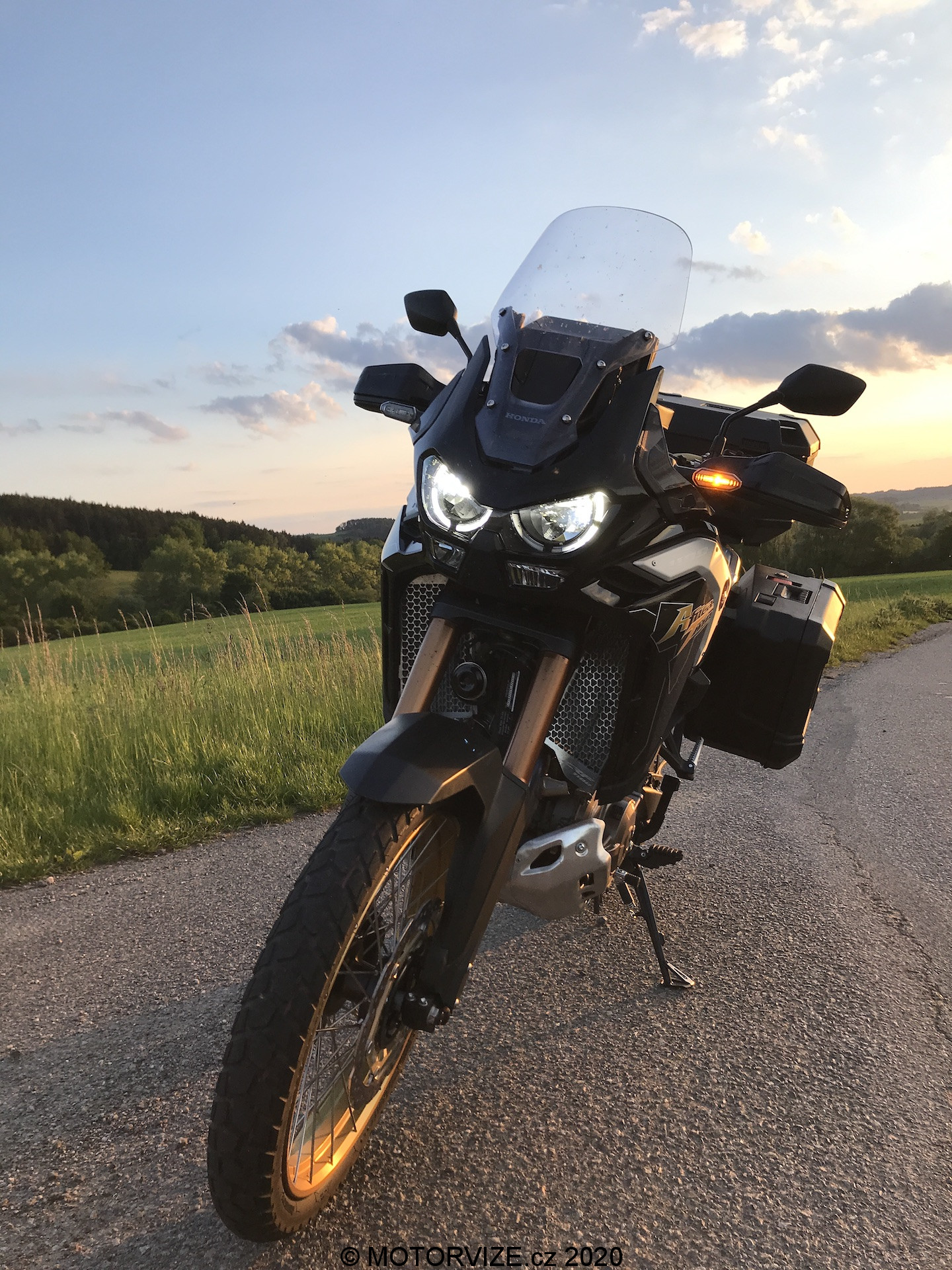 První den se opravdu vydařil. S Afrikou jsem se přesunul na Moravu po skvělých okreskách i po dálnici. Dálnici asi nemá cenu komentovat. Nemám ji rád a jezdit po D1 je spíš za trest a ani to, že na některých úsecích můžu rovnou přepnout na offroad režim radosti moc nepřidá. K dálnici tak můžu říct jen pár poznatků. Motorka jede, má výkon a rychlost, že byste mohli klidně vyrazit i na německý povedenější ekvivalent. Má skvěle provedený štítek a deflektory větru, takže to s vámi moc nemlátí, ani když předjíždíte kolonu náklaďáků. Ve městě nebo na okresce jsem jezdil s otevřeným hledím, jen se sluneční clonou do rychlosti skoro 100 km/h a vůbec mi to nevadilo. Na dlouhé cesty pak určitě oceníte i výborný tempomat a vyhřívané hefty. Na okreskách je to ale úplně jiná zábava. To co mě opravdu dostalo není výkon, ani špičkový design, ale skvělá ovladatelnost. Motorka je naprosto precizně vyvážená a má výborně posazené těžiště. Díky tomu se neskutečně lehce ovládá a do zatáček se klopí úplně sama, výborně drží stopu a neustále máte pocit 100% kontroly. S váhou 240 kg to není žádný drobeček, ale připadám si, jak kdybych seděl na nějakém pětikilu. Motorka jede neuvěřitelně lehce a i na univerzálních bezdušových gumách drží v zatáčkách jako přibitá. Na první zastávce u benzínky, kde jsem nakonec tankovat ani nemusel, protože má motorka nádrž na 24,8 l a dojezd skoro 500 kilometrů, si ještě lehce poladím nastavení. Možností, jak si můžete motorku nastavit, je spoustu. Prostě je to Afrika pro 21. století a elektronika dokáže dělat zázraky. Vše se zobrazuje na dvojici displejů. Adventure sport je vybaven elektronicky nastavitelné vidlici Showa Electronically Equipped Ride Adjustment (Showa EER), standardem je také ABS, anti-wheelie, elektronický podvozek, rychlořazení nebo třeba automatické vypínání blinkrů, nastavení výkonu a motorové brzdy. Veškeré elektronice velí šestiosý snímač, který ji krmí potřebnými daty. Displej má několik módů, kdy volíte buď z těch přednastavených nebo si zobrazení specifikujete podle sebe. Já jsem používal standardní zobrazení Tour a Off-road, ale pokud jste fandové do elektronických hraček, můžete strávit hodiny hledáním toho ideálního pro vás samotné. Celkově je ovládání celkem intuitivní a po pár pokusech není problém se v menu orientovat. Zajímavou inovací je tlačítko hvězdička, na které si můžete definovat funkci dle vlastní volby. Já tam dal kontrolu trakce a fungovalo to super. Nakonec jsem nejvíce využíval vobu user 1 hlavně na silnici. Trochu jsem si přitvrdil podozek a stáhnul brždění motorem. Při maximálním brzdném účinku mi motorka přišla ucukaná, ale to se dalo snadno upravit.