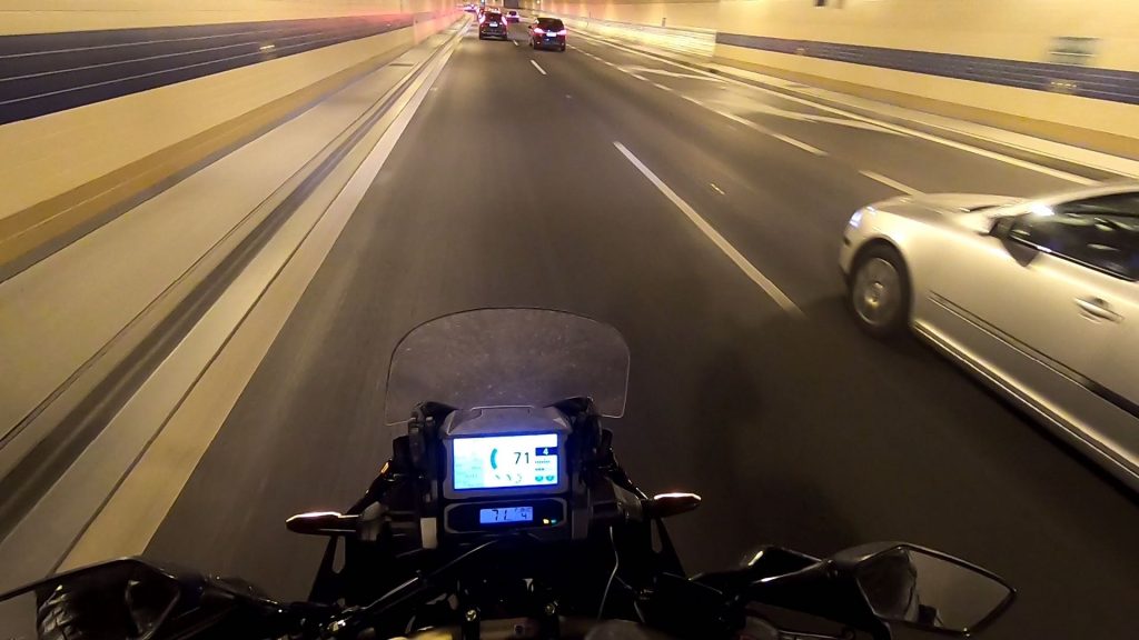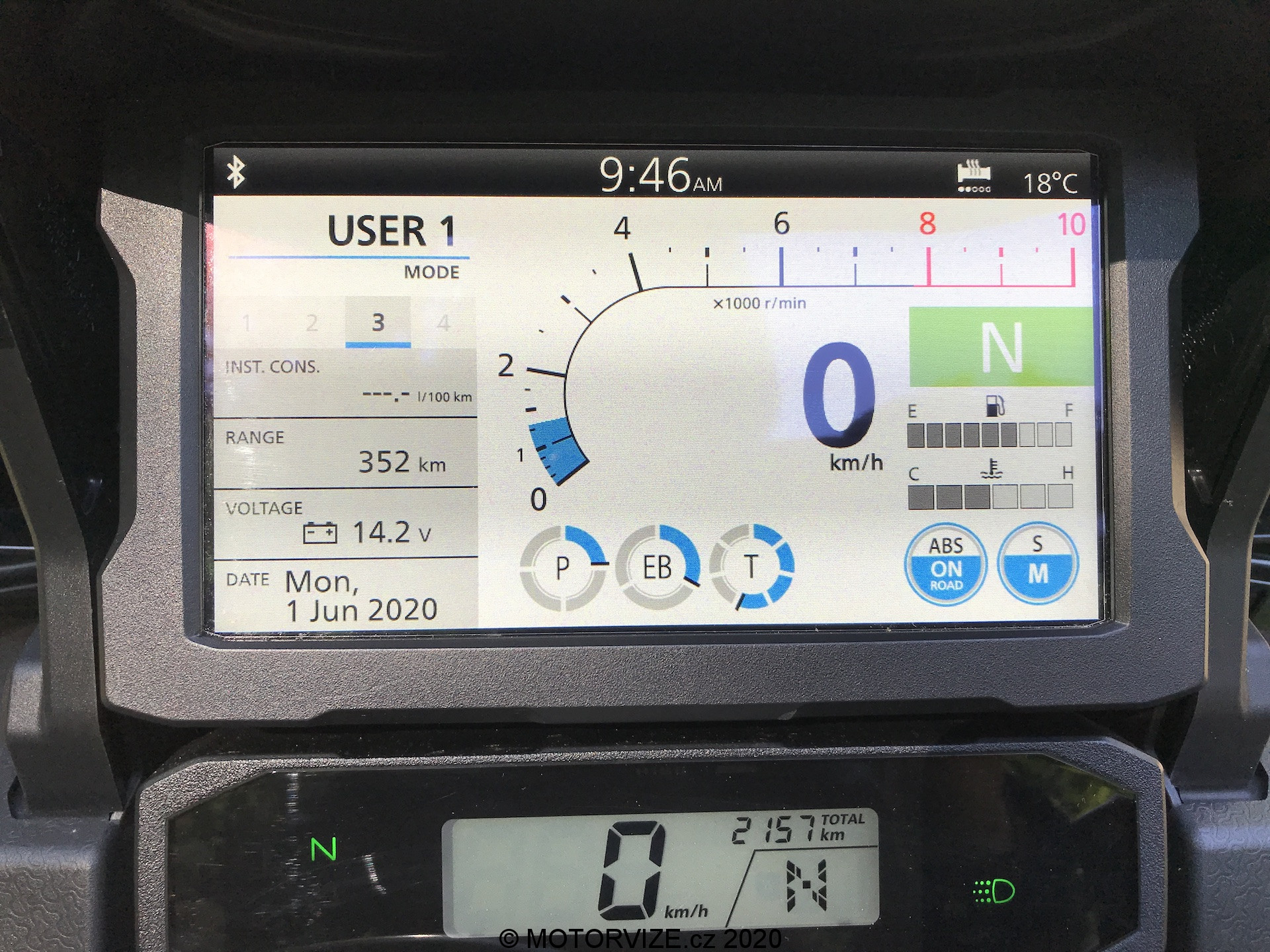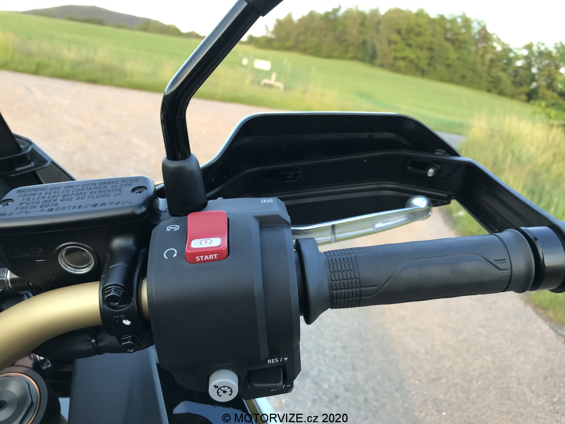 Startování probíhá klasicky – zapínám klíček a startujeme zmáčknutím sdruženého spínače na pravém řídítku. Před tím, než zaburácí motor, naběhne nový barevný displej. Ty má motorka vlastně dva. Hlavní je 6,5palcový TFT dotykový displej, na kterém si ladíte nastavení motorky k obrazu svému a pokud jste majitelé nakousnutého jablka, můžete si na něm duplikovat obraz z telefonu. Pokud použijete Apple CarPlay, základní jízdní data jako aktuální rychlost, zařazený kvalt a najeté kilometry můžete sledovat na doplňkovém LCD displeji. Za sebe musím říct, že kombinace modré a šedé barvy je výborně přehledná. Telefon si také můžete dobíjet ze zabudovaného USB. Motorka sice nemá na mobil přímo schránku, ale praktický malý tankbag je víc než dobrá náhrada. Mimochodem, tankbag je na magnet. Nádrž není žádný plast, ale poctivý kus plechu. Jako bonus se nad displejem nachází menší štítek, takže je dobře čitelný i za prudkého slunce a jak jsem měl tu čest otestovat, při jízdě v dešti na něj nepadají kapky. Co potěší, na ovládání displeje nepotřebujete žádné speciální rukavice s extra Nano dotykovou plochou (nebo co to je), reaguje v pohodě na klasickou koženou rukavicí.