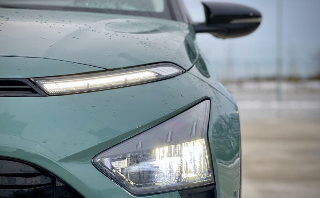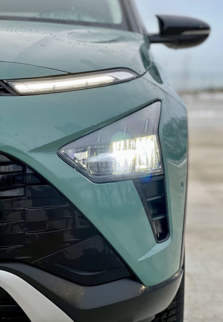 Interiéru vévodí tabletová obrazovka, opět s pěkným rozlišením a i několika mechanickými tlačítky. Další tlačítka pro ovládání vozu pak najdeme i na volantu, který je velmi pěkně vyveden. V této třídě si nepříliš typicky můžeme připlatit i za Bose audio, které zážitek z auta posune opět o něco dále. Samozřejmostí je zrcadlení telefonu pomocí Apple CarPlay/Android Auto, které je dostupné od střední výbavy Smart. Kombinace celého interiérového mixu opět působí velmi dospěle – ať už jsou to digitální budíky, hlavní infotainmentový displej nebo povedené provedení středové konzole – nepůsobí vyloženě luxusním dojmem, na druhou stranu ale není vyrobena jen čistě užitkově, uvnitř najdeme i několik designových prvků v čele mřížkou výdechu klimatizace, vyvedenou po celé délce palubní desky až k budíkům řidiče. To pěkně navazuje na exteriér vozu a členitou přední masku chladiče, jehož výraz je někde mezi extravagantním Tucsonem a menší Konou. Z té si také Bayon odnesl pověstný trik se světly – horní řada denního svícení je úzká a pod ní najdeme velké “lampy”, oproti Koně ale umístěné vertikálně.