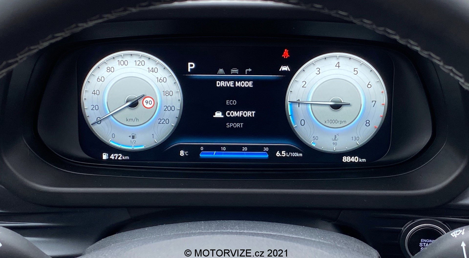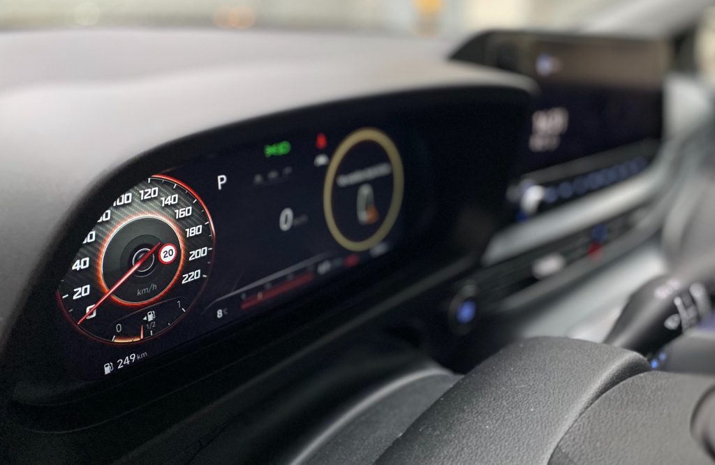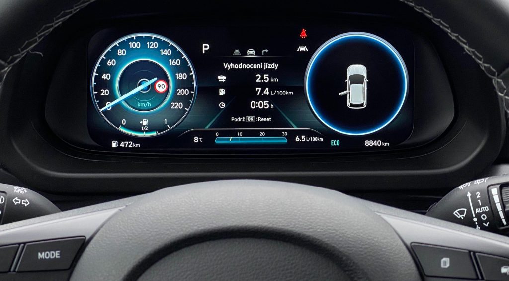 Nasedám do auta, startuji a vyrážím na cestu. Již po chvíli si všímám, že se auto řídí opravdu příjemně. Na městskou jízdu je i20 opravdu ideální. V tuhle chvíli ale mluvím především o ovladatelnosti, která by z logiky věci u malého auta dobrá být měla. To nejzajímavější, o čem se sluší v případě tohoto testovacího kousku mluvit, je jeho mild-hybridní pohon. Hyundai pro potřeby i20 kombinuje dnes už poměrně ozkoušený jednolitrový tříválec 1.0 T-GDI se sedmistupňovou automatickou převodovkou DCT a malým elektromotorem. Zatímco z počátku byly mild-hybridy vnímány jen jako drobné vylepšení start-stopu, dnes začínají v závislosti na konkrétní technice vybraného výrobce dávat větší smysl. Účinky systému MHEV v i20 lze spatřovat jednak v samotném start-stopu, kdy i plachtění na volnoběh se zde děje bez motoru. Stejně tak malý elektromotor pomáhá i při maximálním stlačení akcelerátoru, kdy dodává pár koní výkonu. Shodou okolností je nejvýkonnější varianta i20 dostupná právě výhradně jako mild-hybrid. Stejný jednolitr bez podpory elektromotoru dosahuje výkonu o 14 kW resp. 20 koní nižšího. Osobně mi ani nevadí dvouspojka, jejíž velký zastánce standardně nejsem. Sluší se ale podotknout, že do stejného vozu nabízí Hyundai jako alternativu manuál označovaný iMT. To je převratná novinka, neboť ještě donedávna mild-hybrid nebylo možné kombinovat s ničím jiným než s automatem. Na svezení s IMT se tak docela těším, a to i proto, že bychom se s cenovou relací posunuli do „reálných končin“, ale o tom ještě chvilku pomlčme. Vás určitě zajímá, jak je na tom i20 se spotřebou. I tady platí, že zásadně záleží na jízdním stylu. Možná by vás překvapilo, kdybych řekl, že i ve městě se s ním dá jezdit pod 5 l/100 km. I tak ale může palubní počítač ukazovat hodnoty nad 8 l/100 km. Troufám si ale tvrdit, že zástavba mild-hybridu opravdu dává smysl. Samozřejmě vám příliš nepomůže na dálnici, kde při konstantní rychlosti není moc co rekuperovat, a tak ani co využívat k dopomoci spalovacímu motoru. Když už jsem zmínil to využití kinetické energie z brzdění, musím zmínit, jak překvapivě silná rekuperace standardně u i20 je a regulovat, kdy auto rekuperuje a kdy plachtí na volnoběh, stojí občas trochu více úsilí, než by člověk čekal. To vše způsobuje mimo jiné eko jízdní režim, který se aktivuje automaticky vždy po nastartování. Není se ale vlastně ani úplně čemu divit. Troufnul bych si pak ještě závěrem povídání o jízdních vlastnostech tvrdit, že je i20 poměrně dospělým autem a pěkně demonstruje, kam se auta v posledních letech posunula.