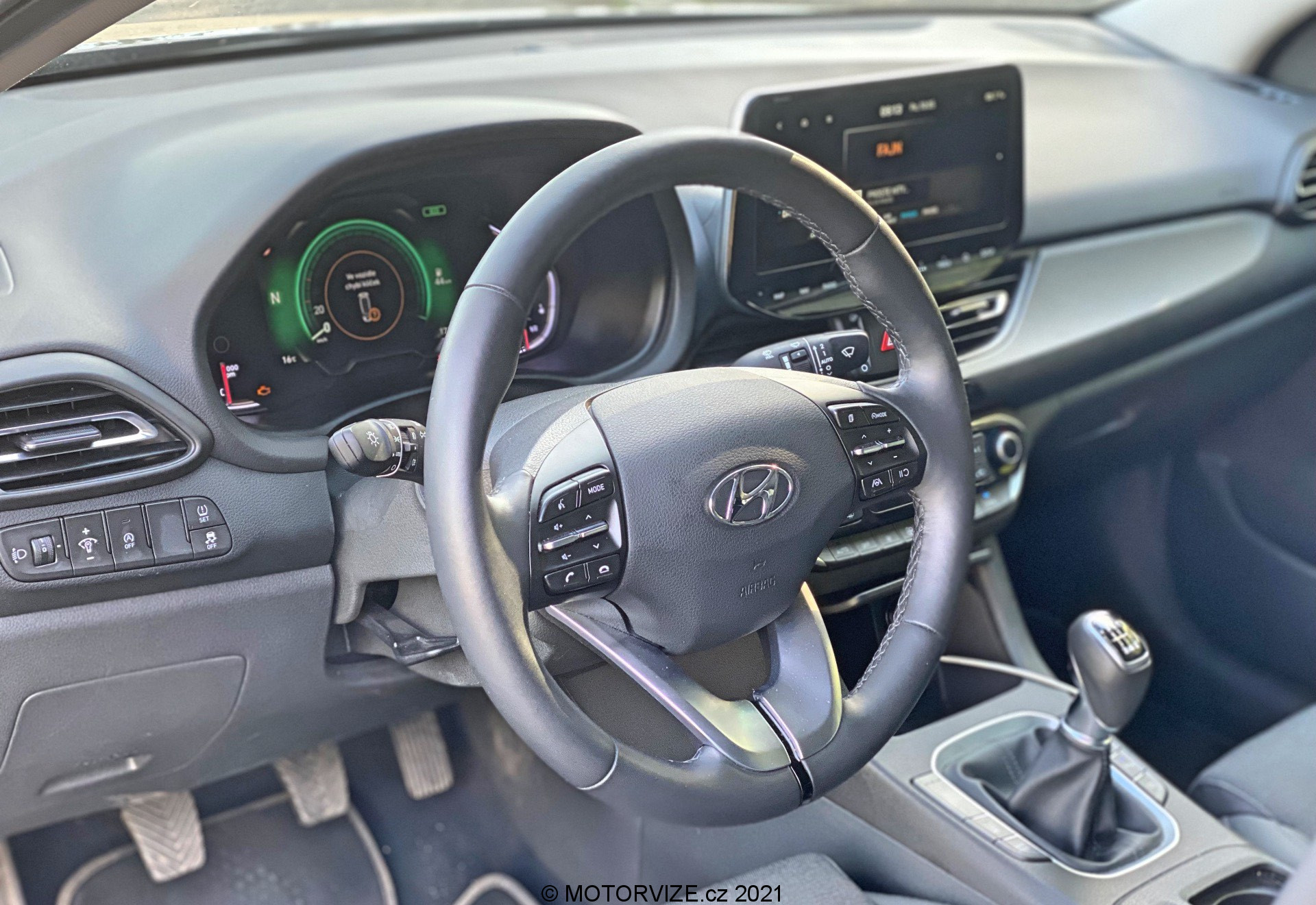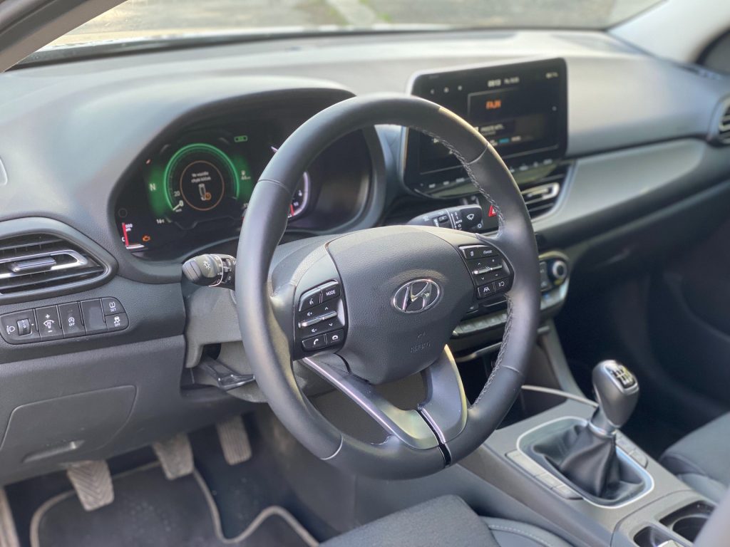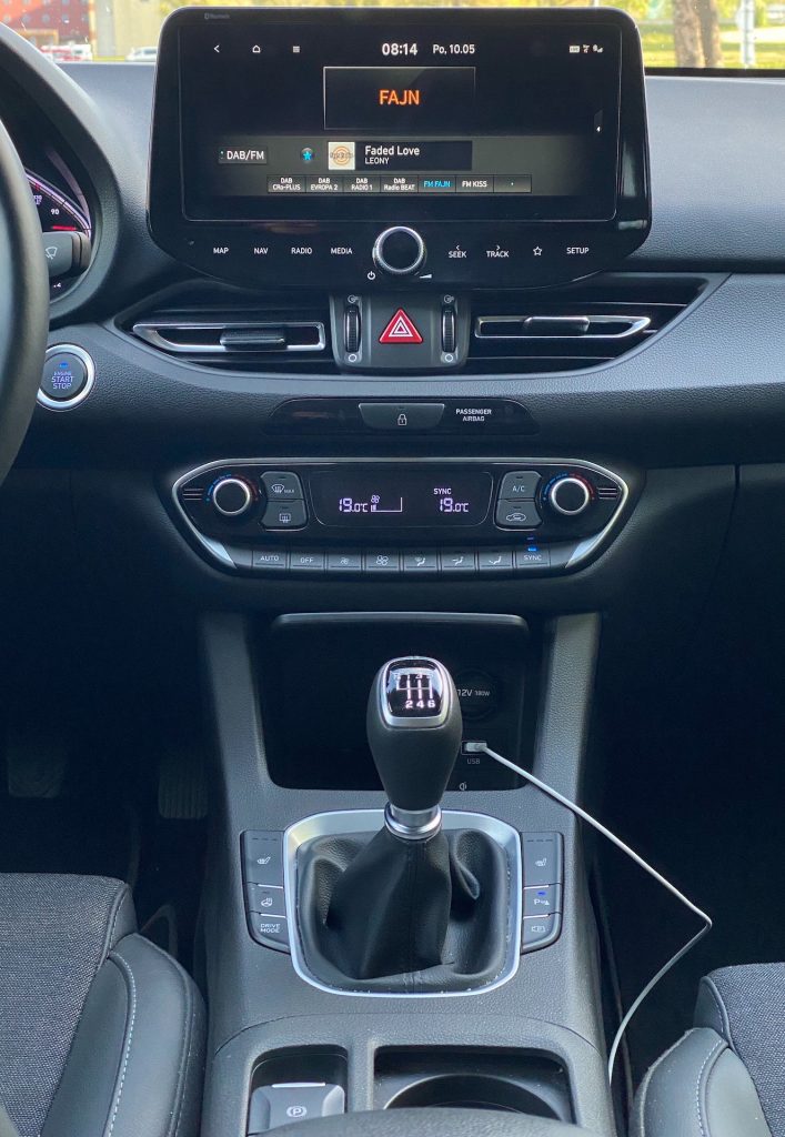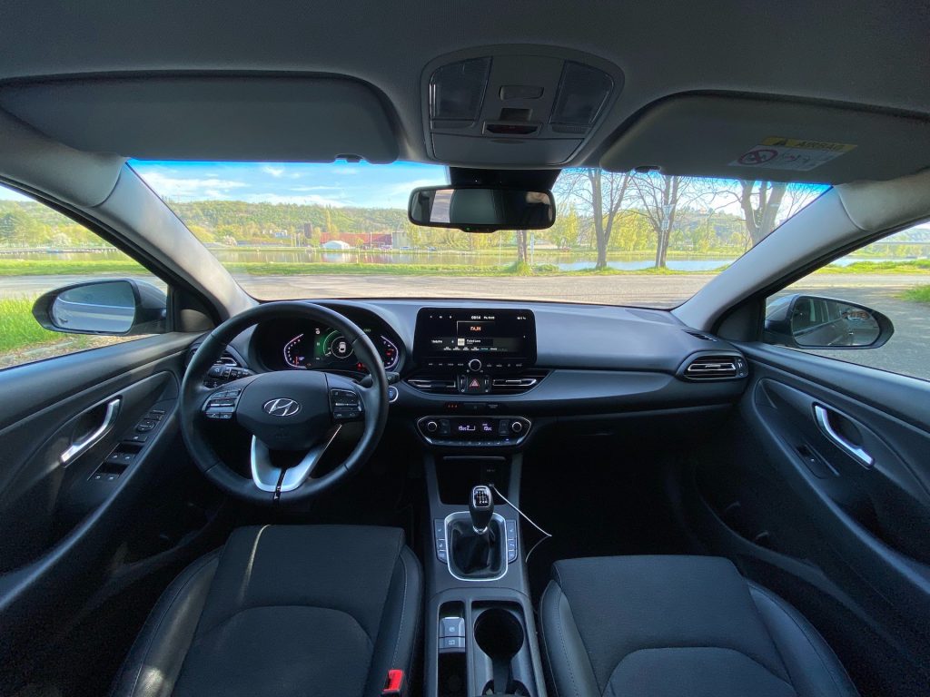 Interiérově je auto na velmi slušné úrovni – v první řadě co se týče vzhledu, a v druhé, co se týče jeho funkčnosti. Posed je také velmi příjemný, neb bočnice jsou velikostně akorát a zbytečně vás do sedačky nezmáčknou. Klasická kombinace látky a koženky nikdy neurazí, jen možná v létě na holou kůži nebude nejpříjemnější. Multifunkční volant je na první pohled celkem robustní, ale díky vykrojení na ruce se příjemně drží. Velmi mi vyhovovala tlačítka ve tvaru malých páček, které se za jízdy lehce ovládaly, a tak nebyly nutné zásahy přímo na displeji. Velký displej použitý v rámci polodigitální přístrojové desky mění barvu s jízdními režimy a ukazuje vše, co řidič momentálně potřebuje. Otáčkoměr, rychlost, značky a dojezd. Nic víc není potřeba a to Hyundai respektuje. Displej pak doplňuje několik analogových ukazatelů po pravé a levé straně. Ačkoliv mi toto řešení vůbec nevadí, musím uznat, že plně digitální přístrojové desky (bez ohledu na funkčnost) u konkurence vypadají poněkud moderněji a luxusněji. Uprostřed středového panelu pak najdeme manuální šestistupňovou převodovkou a za ní odkládací prostor, který je v některých případech možná moc malý na velikost dnešních telefonů. Velmi se mi líbilo klasické ovládání dvouzónové klimatizace s použitím otočných ovladačů na nastavení teploty a s přehlednými tlačítky, to už se u moc aut nevidí. Z palubní desky pak vprostřed vystupuje klasický (plovoucí) displej, přes který se dá ovládat téměř všechno a u kterého musím pochválit především odezvu. Tato odezva byla velmi rychlá i při jeho čištění a přípravě na focení, kdy se mi místo písniček z CarPlay začal ozývat šum deště. Na uklidnění jsou přednastavené zvuky přírody skvělou funkcí, ještě jsem ji v žádném autě neviděla. Jinak systém palubní zábavy u Hyundai působí jednoduchým dojmem, a to vlastně ani není špatně, i když mě v současnou chvíli nenapadá nic konkrétního, co bych měla v pozitivním ale ani negativním duchu připomenout.