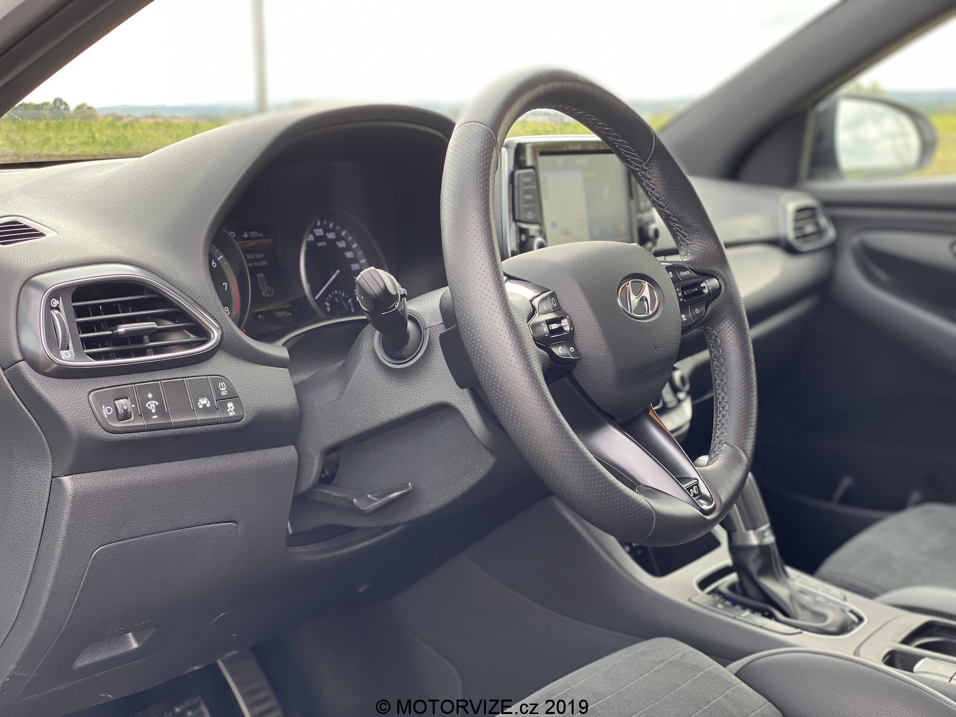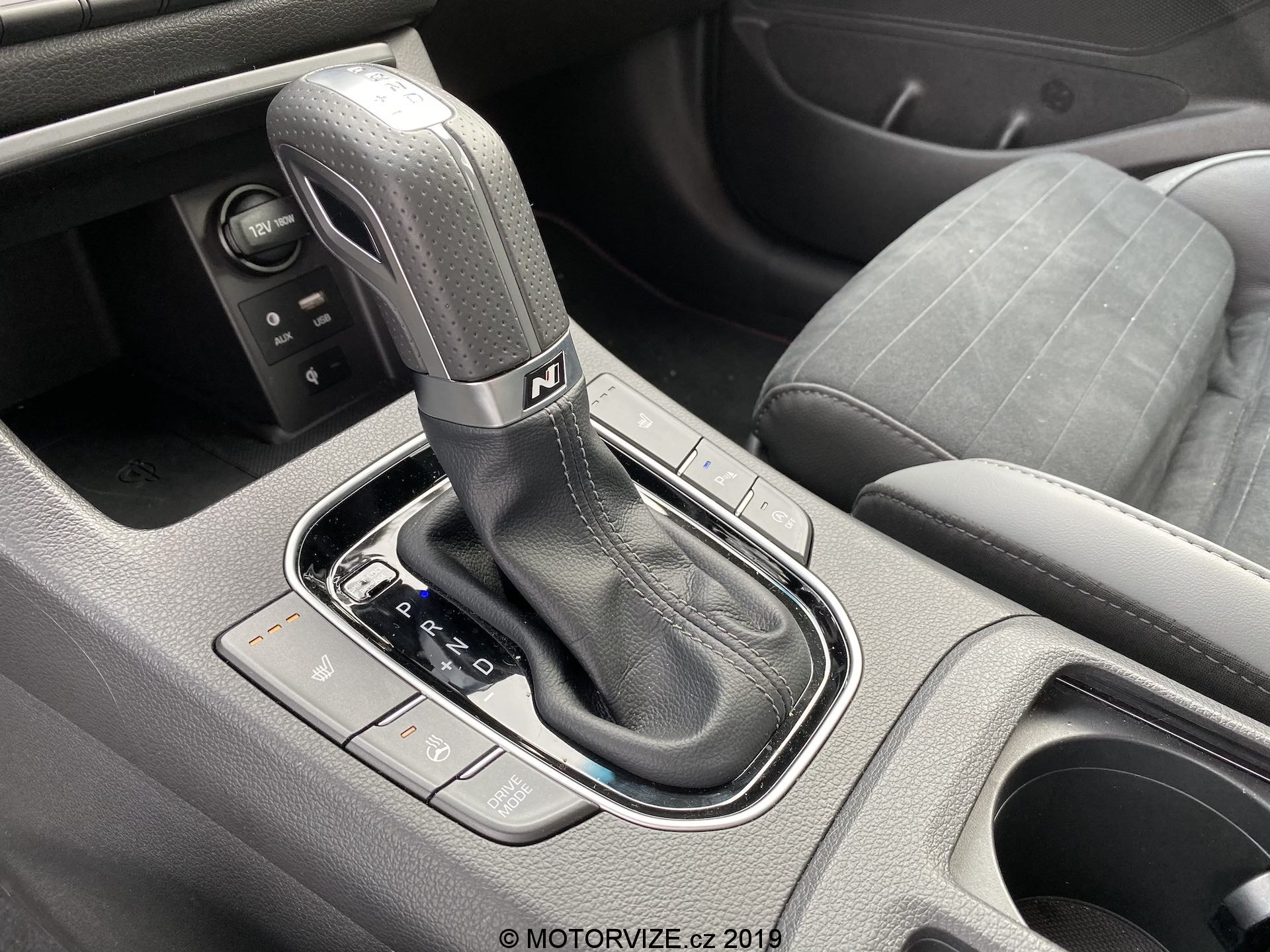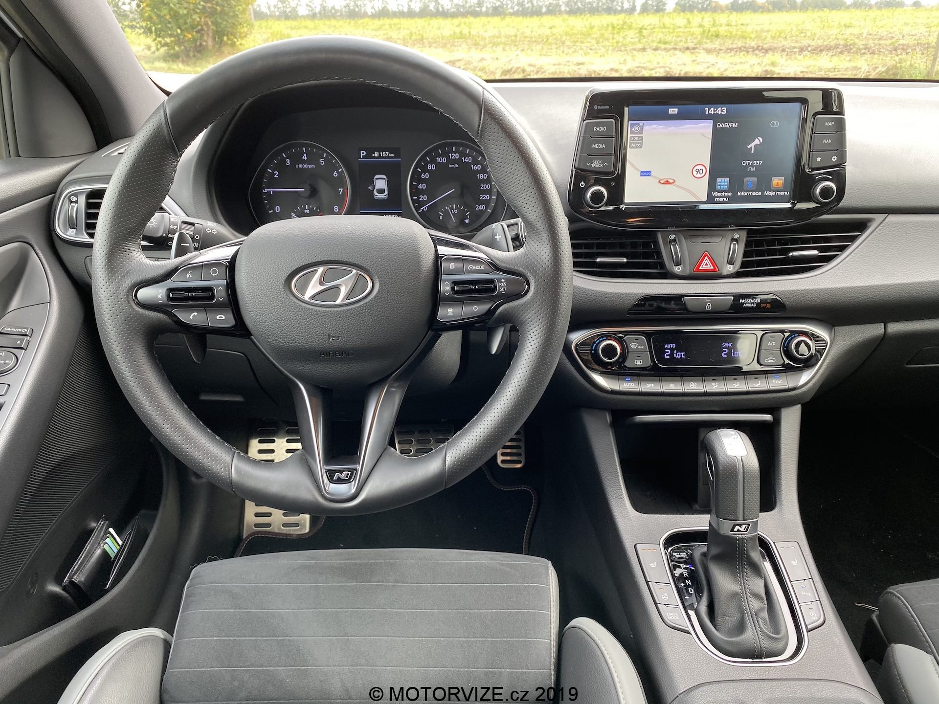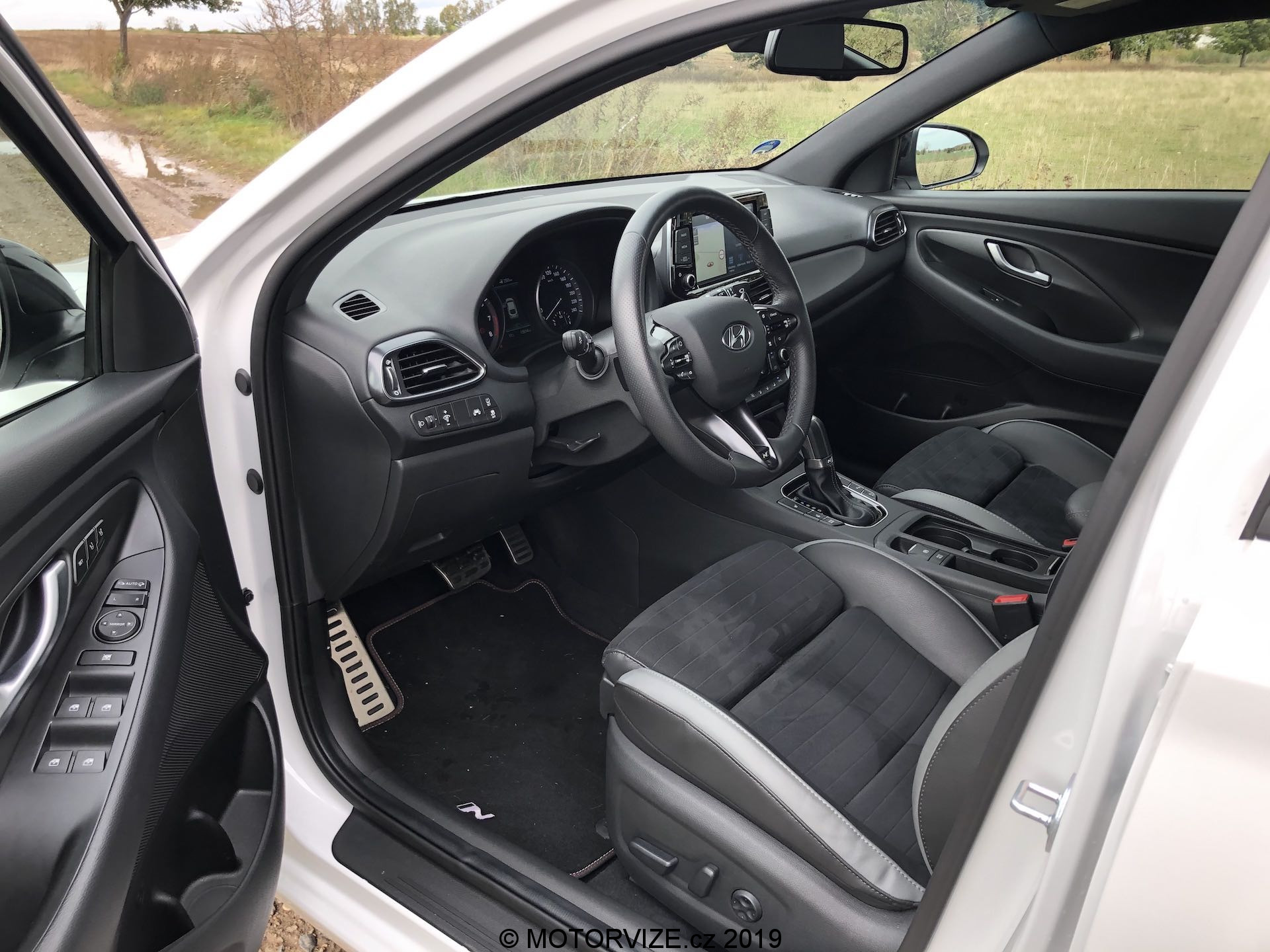 Vnitřní prostor se až tak moc neliší, jsou tu spíše menší rozdíly. Všimneme si jich na volantu, středové konzoli a spíše detailů. Na volantu chybí dvě krásná tlačítka na volbu jízdní režimů a přibyla „pádla“ pod volantem dostupná v případě volby automatické převodovky, jak je tomu u námi testovaného kusu. Budíky (přístrojová deska) pocházejí z normální verze i30, u nich už je opravdu vidět, že i30 už čeká na modernizaci, neb v přímém pohledu na konkurenční digitální štíty už analogové ručičky a poměrně malý displej palubního počítače vypadají poměrně zastarale. Středová konzole je včetně infotainmentu stejná až na dvě věci – volič jízdních režimů automatu a úložný prostor pod ovládáním klimatizace, opět jen detaily. Volič vypadá opravdu zvláštně, nechám na každém, ať si jej nazve, jak chce. Sedačky jsou ale kupodivu ještě o trošku tvrdší než v klasickém enku, což popravdě nechápu a nedává mi to smysl. Myslím si, že v N-Line by ty sezení mělo být spíše komfortnější, což narovinu není. Jestli je něco, co mi kolegové stále připomínají při usednutí do Hyundaie, tak jde o vyšší posez, než by byl ve sportovně střiženém voze očekáván. Já jsem s touto charakteristikou u mého eNka „v pohodě,“ sedadla v N-Line mají ale pocitově svou nejnižší polohu o něco výše, a tak se nechtěnému doteku pravé nohy o volant prostě a jednoduše neubráníte. Abychom ale sedadla jen nehanili, pochválit můžeme prodloužitelný sedák, díky němuž je rozsah nastavení o něco vyšší a dokonce lepší než u většiny konkurentů.