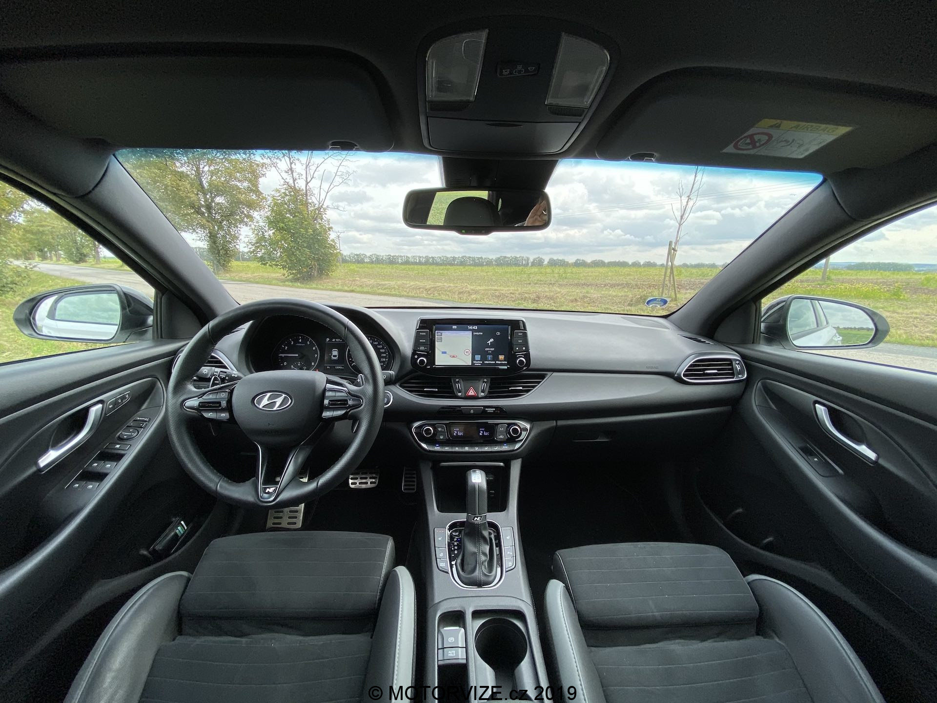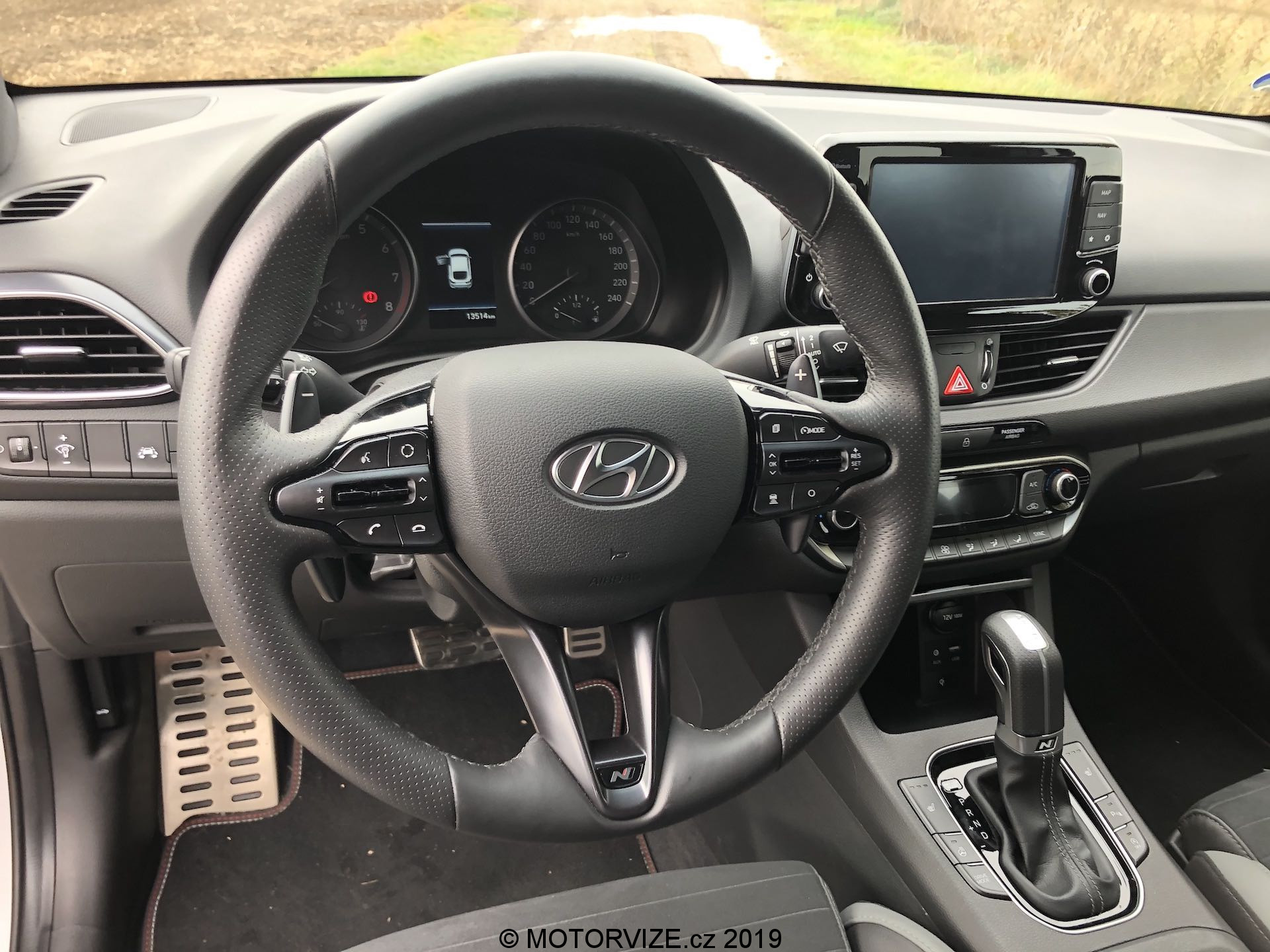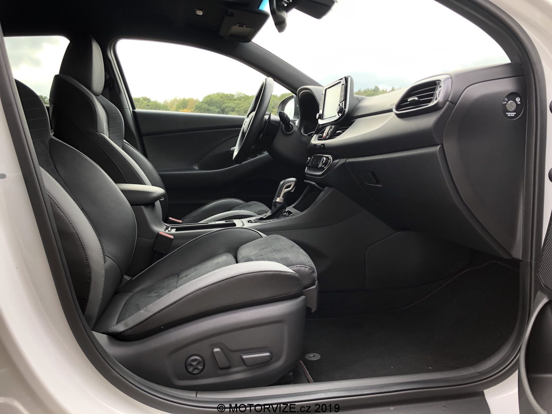 Vnitřní prostor se až tak moc neliší, jsou tu spíše menší rozdíly. Všimneme si jich na volantu, středové konzoli a spíše detailů. Na volantu chybí dvě krásná tlačítka na volbu jízdní režimů a přibyla „pádla“ pod volantem dostupná v případě volby automatické převodovky, jak je tomu u námi testovaného kusu. Budíky (přístrojová deska) pocházejí z normální verze i30, u nich už je opravdu vidět, že i30 už čeká na modernizaci, neb v přímém pohledu na konkurenční digitální štíty už analogové ručičky a poměrně malý displej palubního počítače vypadají poměrně zastarale. Středová konzole je včetně infotainmentu stejná až na dvě věci – volič jízdních režimů automatu a úložný prostor pod ovládáním klimatizace, opět jen detaily. Volič vypadá opravdu zvláštně, nechám na každém, ať si jej nazve, jak chce. Sedačky jsou ale kupodivu ještě o trošku tvrdší než v klasickém enku, což popravdě nechápu a nedává mi to smysl. Myslím si, že v N-Line by ty sezení mělo být spíše komfortnější, což narovinu není. Jestli je něco, co mi kolegové stále připomínají při usednutí do Hyundaie, tak jde o vyšší posez, než by byl ve sportovně střiženém voze očekáván. Já jsem s touto charakteristikou u mého eNka „v pohodě,“ sedadla v N-Line mají ale pocitově svou nejnižší polohu o něco výše, a tak se nechtěnému doteku pravé nohy o volant prostě a jednoduše neubráníte. Abychom ale sedadla jen nehanili, pochválit můžeme prodloužitelný sedák, díky němuž je rozsah nastavení o něco vyšší a dokonce lepší než u většiny konkurentů.