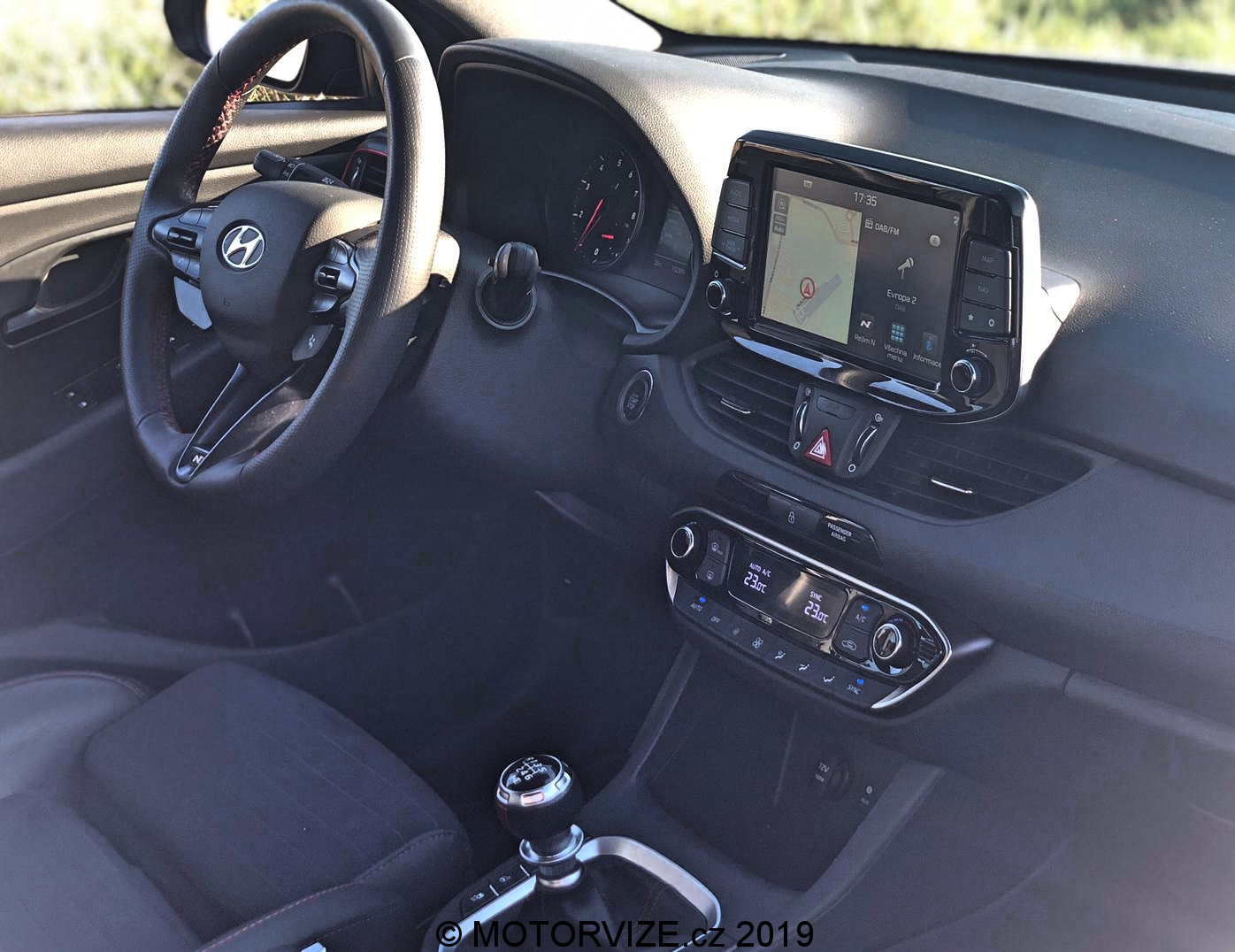 Konečně nastupuju do interiéru a přichází první nepříjemné překvapení. S mojí téměř dvou metrovou postavou je na první pohled jasné, že si tu prostoru příliš neužiju. Fastback je o tři centimetry nižší než hatchback a mnoho z vás to nemusí trápit, ale i takový kousek bych opravdu přivítal a umožnil by mi mnohem lepší řidičskou pozici. Sedačka je totiž i v nejnižší poloze na můj vkus vysoko. Pozici jsem si nakonec vytvořil a nebyla úplně zlá. V případě, že by se sedačka dala dát o pět centimetrů níž, bylo by to téměř dokonalé. Sedím na svém místě, rozhlížím se okolo a zažívám první pocity mírného zklamání. Interiér vozu má svoje slabé stránky, kterými jsou především tvrdé materiály, jež naleznete naprosto všude kromě vrchní části palubní desky a obložení dveří. Vše, co vidíte, je z mého pohledu opravdu levně působící, a to včetně černé plastové kliky dveří, madla, ovladačů oken. To jsou přece prvky, které budeme mít denně v ruce. Na druhou stranu uznávám, že díky kompletně černo-černému provedení všeho co oko vidí, není problém tak razantní. Jen na dotek je znát určitá úspora. Nemám představu, jak moc by cenou zahýbaly pokovené kliky dveří a měkčená madla, ale budiž, jsou tu i pěkné prvky. Nikde nic nevrže, nepraská, vše lícuje. První opravdu kvalitní částí uvnitř jsou velmi příjemné sedačky s dobrým bočním vedením. Čalounění Alcantarou pomáhá držet tělo na místě, a to bude jistě potřeba. Druhou a podstatnou záležitostí v interiéru, která bude hojně využívaná, je volant. Tady nemám výhrady. Skvěle padne do ruky, má příjemnou sílu věnce a hlavně – je kulatý. Nabízí také ovládání většiny systémů ve voze. Uprostřed palubní desky trčí, jak je zvykem, displej infotainmentu a podrobnějšího nastavení jízdních režimů. Je dotykový, obsahuje i analogová tlačítka pro časté funkce, nabízí rychlou odezvu. Jednoduše funguje dobře a lepší by mohla být snad jen jeho grafika. To ale nebrání bezproblémovému používání.