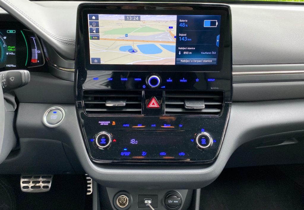 Po nastartování na mě vyskočí dojezd 300 km. Plná baterka a dojezd přes 300 km – tyhle hodnoty mi vzhledem k předchozím zkušenostem s elektromobily přijdou při nejmenším hodně zajímavé. Po tichém rozjezdu se zařazuji do městského provozu. Nic neslyším. Ticho a já mám čas užít si své první kilometry. Auto kilometr za kilometrem ukazuje nižší dojezd, ale s každým brzděním (a rekuperací) se dojezd zas blíží slibované číslici 300. Ano, užívám si to. Reproduktory k jízdě příjemně hrají (příplatkové audio infiniti hraje velmi dobře) a vzhledem k takřka nulové zvukové kulise elektromotoru můj zážitek nic neruší. Co se týče jízdních vlastností, jsem stejně spokojený jako s jeho hybridním bratrem. Podvozek je příjemně měkký, tlumí nerovnosti a je čitelný. Auto si i při vysoké rychlosti udržuje komfortní tichou atmosféru a já si na této palubě nemohu na nic stěžovat. V tuto chvíli, kdy jsem zmínil dálniční rychlost, bych měl potvrdit, že se ve vyšších rychlostech elektromobil vybíjí opravdu rychle. Zde ta slibovaná 300 rychle padá. Na druhou stranu jsem už zažil i horší výsledky v této disciplíně (u konkurence). Za hranici „efektivity“ si dovoluji považovat rychlost okolo 110 km/h, kdy je možné atakovat dojezd na úrovni 220 – 250 km. Rád bych se ještě vrátil k té otázce u piva, kdy jsme byli ještě odborníci na klasickou koncepci aut. Nyní se často diskutuje yna téma elektromobility a já se musím přiznat, že jsem mile potěšen, kam se tato mobilní alternativa posunula. Samozřejmě dojezd 300 stále není tak vysoký, abychom jej mohli používat jako první rodinné auto, ale na druhou stranu si už dokážu představit jeho reálné využití s takovým omezením, které jsem ochotný vzhledem k jeho výhodám akceptovat. Další proměnná, která se posunula směrem vpřed, je infrastruktura v podobě dobíjecích stanic. Kde jste ještě během posledních pár let jen marně hledali dobíjecí stanici, jich najednou objevíte hned několik a od různých poskytovatelů. Tohle se mi už prostě začíná líbit. Když opomenu, že bych v ideálním případě potřeboval hned tři dobíjecí čipy a nabíjení už není tak výhodné, jak bývylo, opravdu jsem schopný u toho piva naznačit, že má smysl pořídit si do městského provozu elektromobil. Bydlím sice mimo město, a proto bych nad pořízením váhal, příměstské aglomerace jsou i tak vhodné, neboť dojezdová vzdálenost do města snižuje efektivitu elektromobilu jen ve velmi malé míře. Ačkoliv je možné Ioniqa přes noc takřka do plna (+- 11 hodin z 0 na 100 % z klasické domácí zásuvky), ústavičné dobíjení mě upřímně tolik neláká. Za to rychlonabíjení DC (stejnosměrný proud) je už podstatně příjemnější. Ačkoliv je vcelku oříškem využít maximální dostupný výkon nabíjení (udávaný 50 kW, námi nejčastěji měřený okolo 35 kW), z 0 na 80 % mám povětšinou nabito za 35 – 40 minut, a to především v porovnání se staršími elektromobily špatné vůbec není.