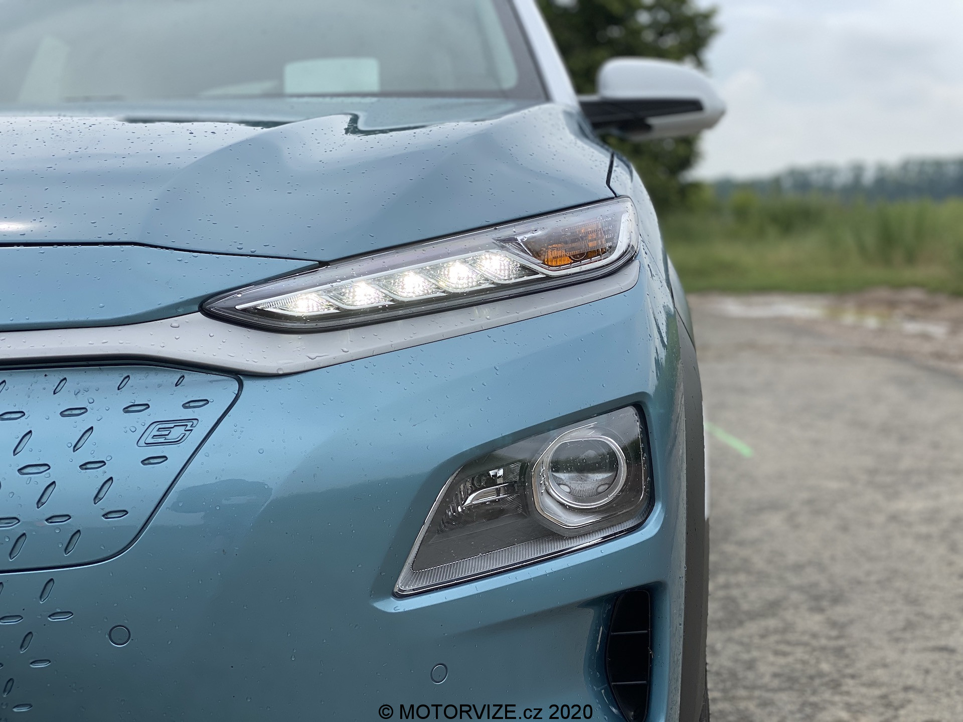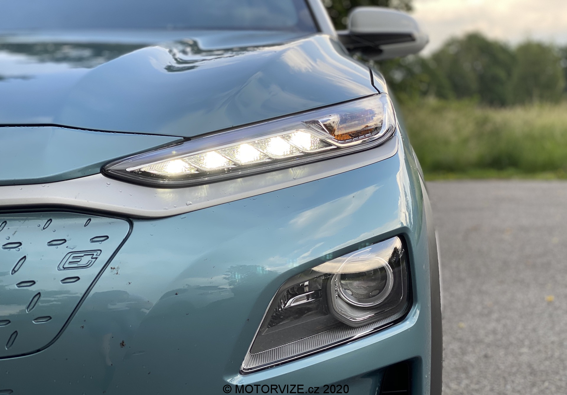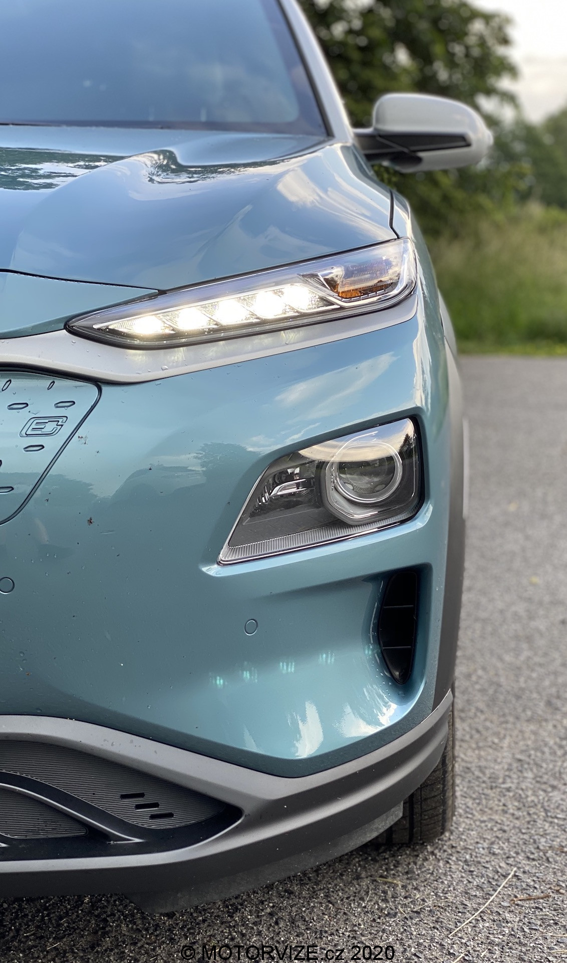 O Koně jsem toho upřímně vyjma její účasti na zmíněném rally pravidelnosti mnoho nevěděl a díky tomu přišly všechny možné vjemy tak říkajíc na „první dobrou“. Kona je typický městský Crossover se vším, co k danému označení patří. Stojím tedy před vozem, jenž by mohl být slušným hatchbackem, nebýt toho vyššího podvozku. Osobně stále kromě pocitu nerozumím smyslu a oblíbenosti crossoverů, ale to teď ponechme stranou. Pojďme na to klasicky – krok za krokem. Přední část vozu díky velké zakryté ploše dává najevo svou příslušnost k alternativnímu pohonu. Nemá žádnou mřížku chladiče, protože není potřeba a díky tomu působí značně mohutnějším dojmem. Bude asi potřeba si trochu zvykat, zvlášť když světla denního svícení ve tvaru tenké linky nezabírají proporčně mnoho místa. Ještě, že jim pomáhají hlavní světlomety umístěné o kus níže – tím je celistvá plocha alespoň narušená a právě spodní část světel šikovně narušuje jinak velmi oblou a masivní plochu. V podstatě mi design přední části moc nesedí, ale to neznamená, že nemůžete mít jiný pohled na věc. Každopádně v něm Konu „vidíte“ a hlavní změnou oproti konvenční verzi tvoří právě chybějící mřížka chladiče. Osobně mému oku standardní verze sedne o něco lépe.