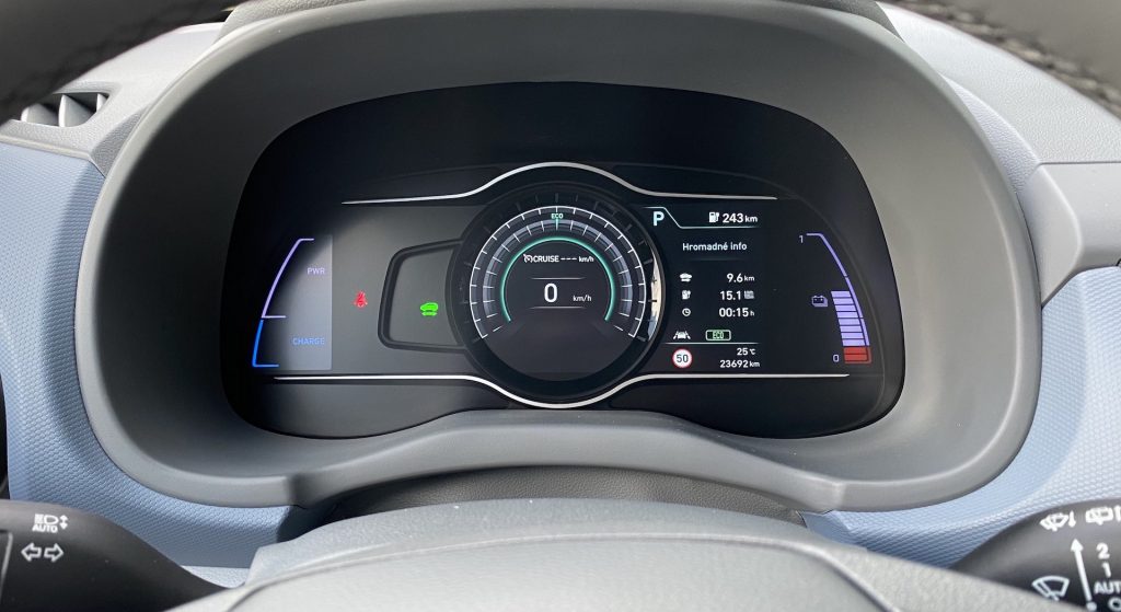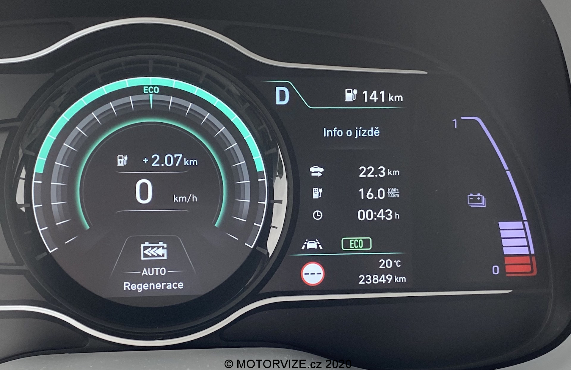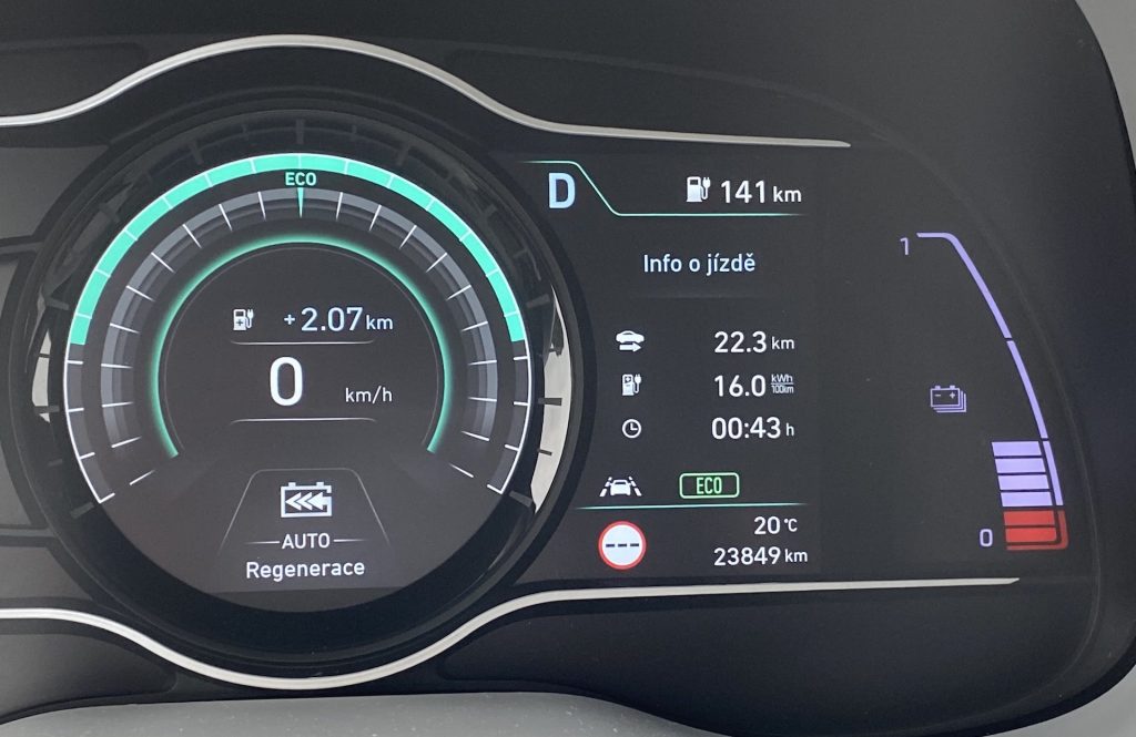 Tak jak to tedy jezdí… DOBŘE, o tom žádná. Dynamika je oproti konkurenci se spalovacími motory nadprůměrná. Výkon je k dispozici kdykoliv a kdekoliv. O divokém lítání ale Kona určitě není, byť by vás k tomu její výkon mohl svádět, dřív nebo později dospějete do bodu, kde na voliči jízdních režimů nahodíte ECO a budete se zkrátka vozit. A právě v tomhle směru mi dávala Kona největší smysl. Při uvolněné jízdě je opravdu pohodlná, nebývale tichá a díky elektromotoru opravdu kultivovaná. Žádné vibrace ani běžný hluk – jen ticho a pohoda na palubě, to je opravdu příjemné a jediné, co klid umí narušit, jsou rychlosti okolo dálničního limitu, kde aerodynamický hluk vzroste nad běžným řidičem příjemnou úroveň. Upřímně ale nedokážu rozluštit, jestli je „hlučnější“ nebo jen tak působí právě proto, jak je běžně tichá. Tipoval bych to spíš na druhou možnost. Tím, že chybí hluk od motoru a v podstatě celého hnacího ústrojí, začal jsem víc vnímat právě hluk od podběhů nebo větru. Nejedná se ale o nic strašného. Podvozek je nastavený na komfortní a pohodlnou jízdu, a přesto je schopen poměrně dynamické jízdy. Na žádné sportování to není, ale to snad nikoho ani nenapadne. Je dobré si ale říct, že vůz je opravdu stabilní, dobře vede stopu a následuje vaše pokyny. Limity jsou daleko za tím, co od něj může typický uživatel požadovat a to je dobře. Jednou zajímavostí jsou pádla pod volantem, která logicky neslouží k řazení jednotlivých převodových stupňů – elektroauta tuto potřebu nemají, nastavujete jimi tři stupně rekuperace energie. Její efektivita na třetí stupeň je „ohromná“. Při vhodném využívaní tohoto prvku se dá jezdit prakticky bez brzd. Při rekuperaci Kona zpomaluje takovým způsobem, že destičky snad vydrží i po „sešrotování“ (nadsázka, pozn. red.). Navíc Hyundai dokázal rekuperaci umně integrovat i do adaptivního tempomatu a díky automatizaci jsou i přechody mezi jednotlivými rekuperačními stupni neznatelné. Uspořené kilometry i v tomto režimu naskakují opravdu rychle (viz. foto).
