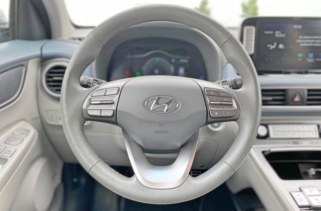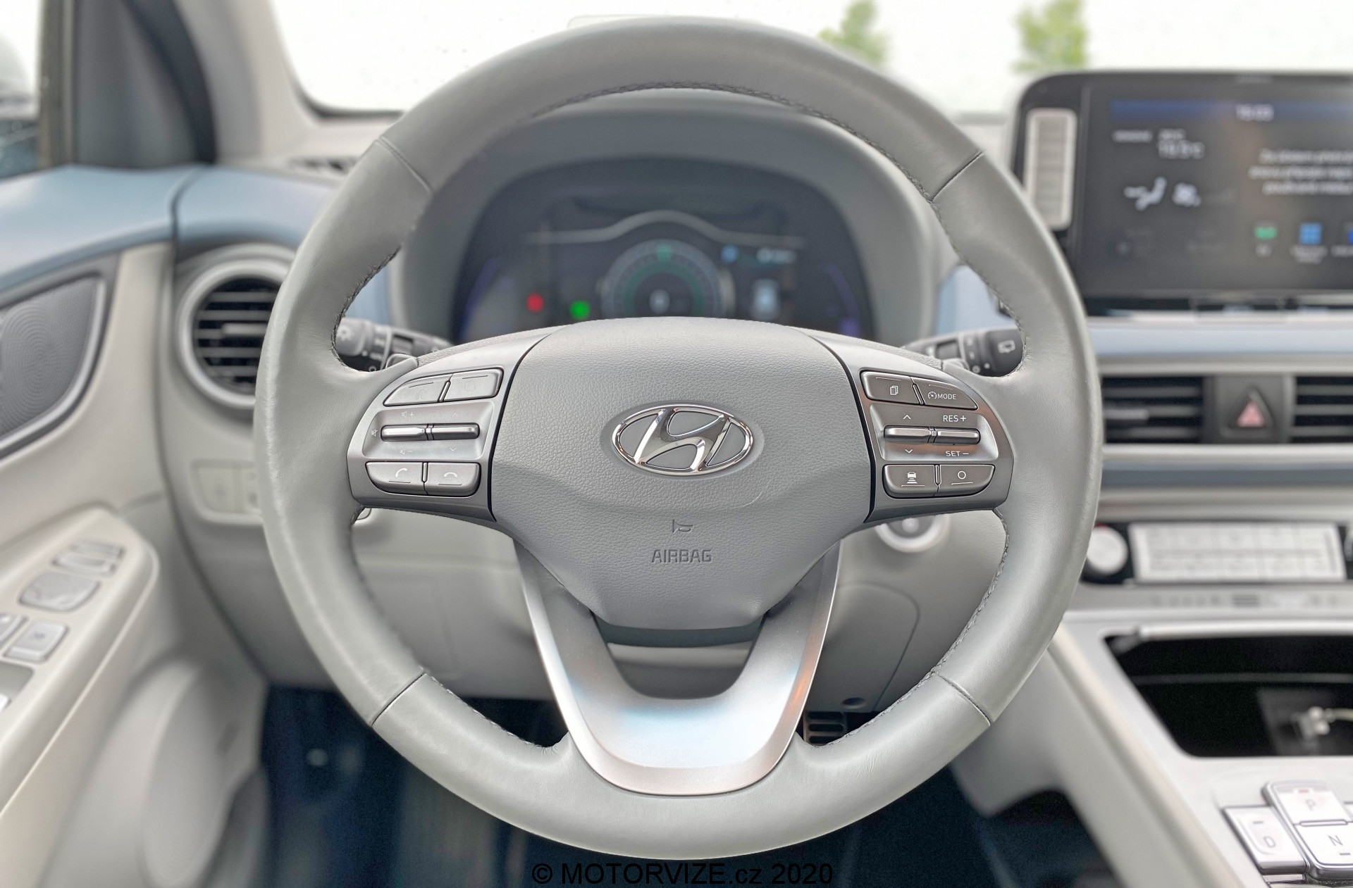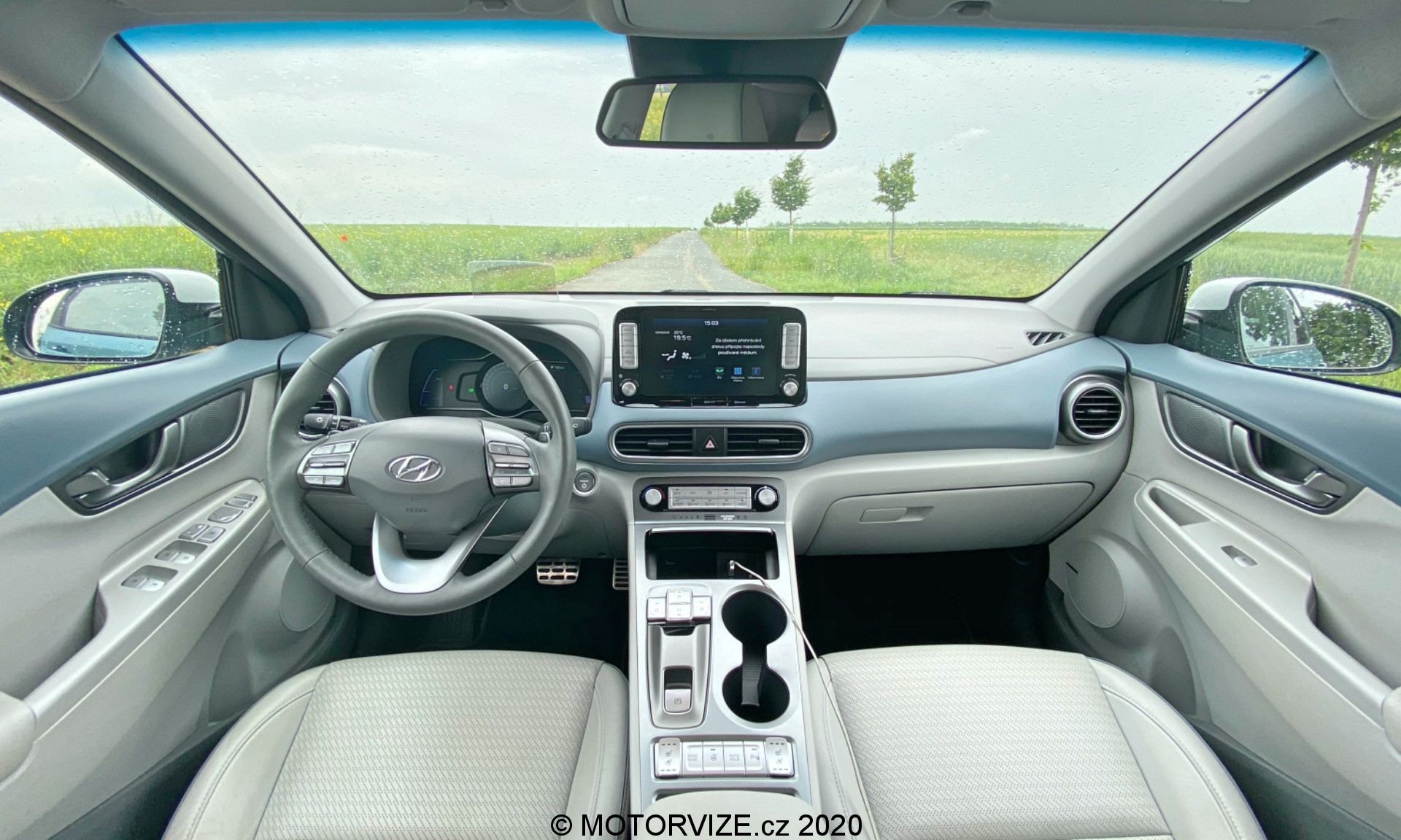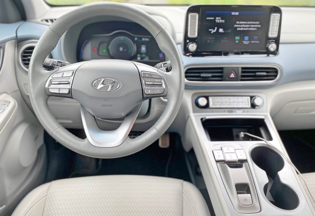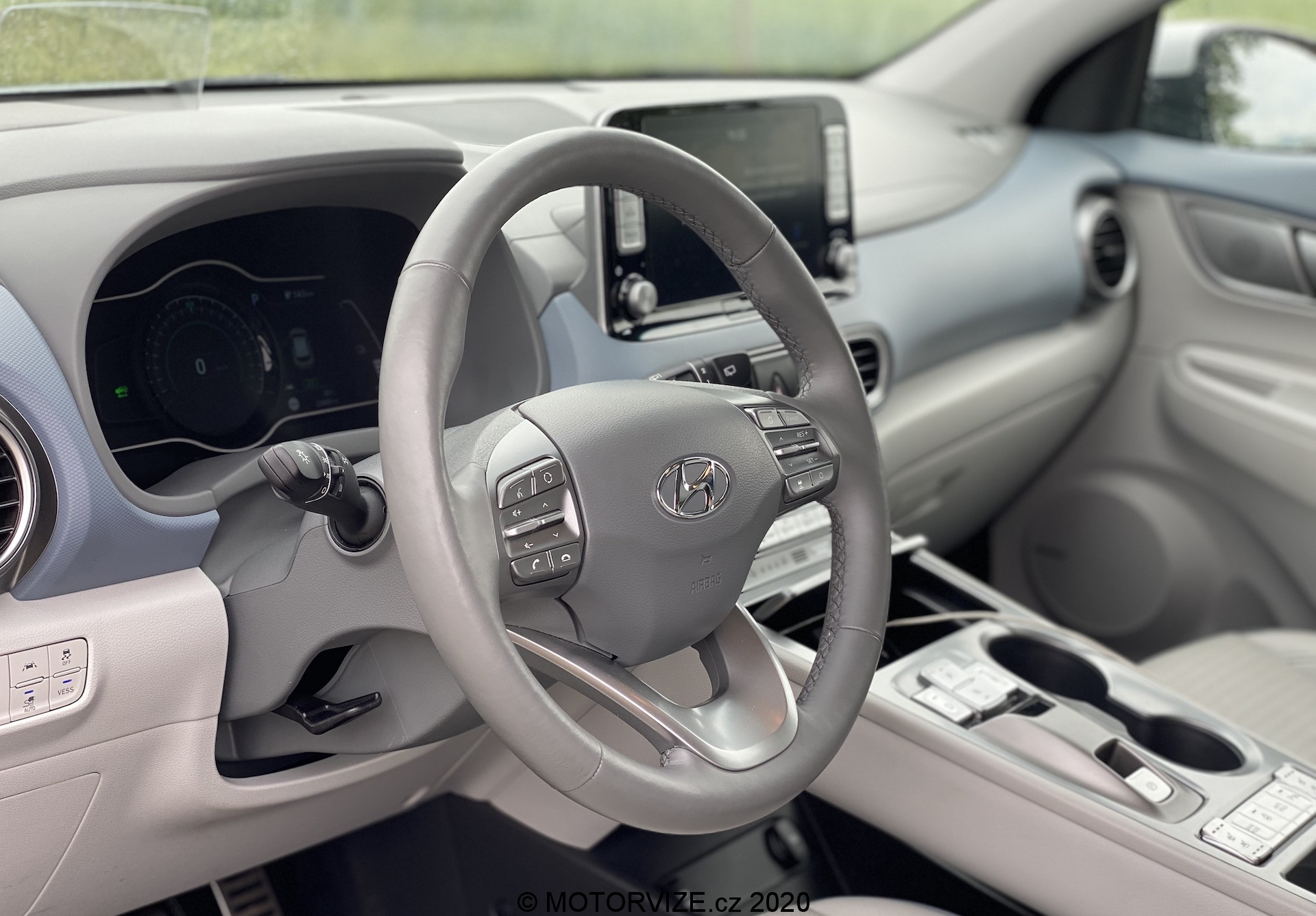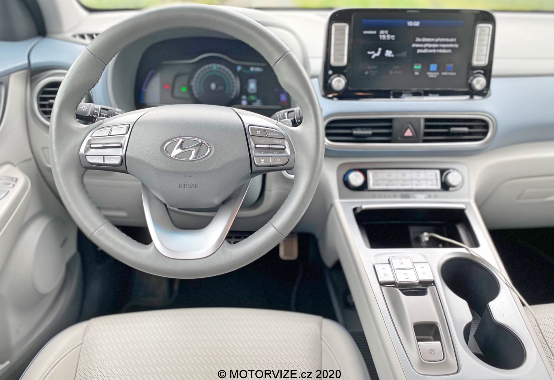 První dojem po nasednutí do Kony je příjemný. Testovaný vůz měl minimálně tříbarevný vkusně sladěný interiér kombinací různě světlých, tmavých šedivých a zelenkavých (možná modrých) tónů. Jsem jen chlap – tak si nechám o odstínech rád poradit. V každém případě interiér nabízí klidnou atmosféru, což k danému typu vozu určitě sedí. Prostoru na předních, komfortních, vyhřívaných a dokonce odvětrávaných sedačkách najdete dostatek. Věřím, že spíš nadbytek. Na zadních sedadlech je to samozřejmě o kousek slabší, ale při běžném obsazení si vystačíte. Jedinou slabinu v oblasti vnitřního prostoru nalezneme v kufru. Ten není kdovíjak prostorný a i nakládací hrana je poměrně vysoko. Pro dva určitě stačí, při dvou dětech už spíše ne.