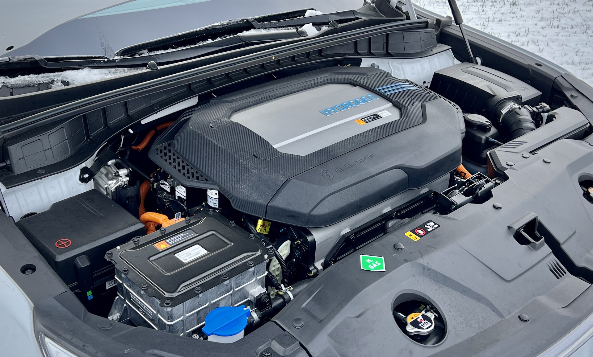 Zprvu je potřeba si připomenout, že vodíkový vůz je vlastně elektromobilem, kterému energii dodává reakce vodíku se vzduchem v palivovém článku (i proto tedy použití zkratky FCEV). Já bych se navíc ani nebál přirovnat jej k mild-hybridu. K dodávání dostatečného množství energie totiž kromě reakce v palivovém článku slouží i 1,56kWh baterie (stejná, jakou můžeme najít třeba u modelu Ioniq či Kona Hybrid). Akumulátor je tu kromě snahy o zvýšení efektivity také pro dosažení rozumné míry výkonu. Maximální systémový výkon totiž sice činí 120 kW, což mimochodem není vyloženě moc, palivový článek je ale schopný dodat elektromotoru v jeden okamžik „pouze“ 95 kW, o zbylých 25 kW se tak musí postarat akumulátor. Maximální výkon ale samozřejmě není to jediné, k čemu slouží. Mírné rozjezdy se taktéž dají zvládnout výhradně na baterii, do níž se mimochodem energie akumuluje výhradně z rekuperace při brzdění, a je tu i bezpečnostní funkce. Chvilku po zastavení a „vypnutí“ auta totiž palivový článek ještě pracuje a reakci je potřeba vždy bezpečně ukončit (zpravidla jde o zhruba 1 minutu). Poprvé vás to možná překvapí, po čase ale pochopíte, že hluk při odchodu souvisí také s vyprázdněním vody, která vzniká reakcí vzduchu a vodíku a jíž můžete ve formě páry vystupující zezadu a zespod auta v danou chvíli vidět.