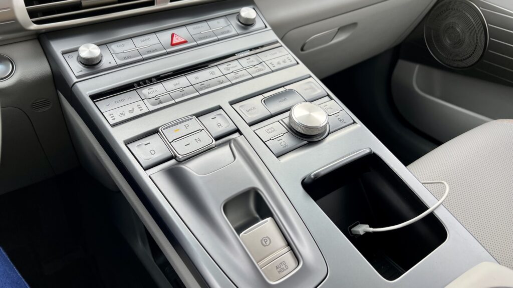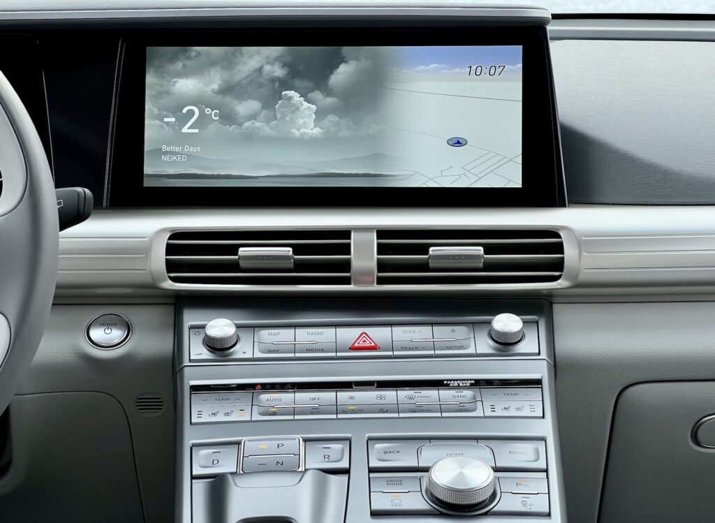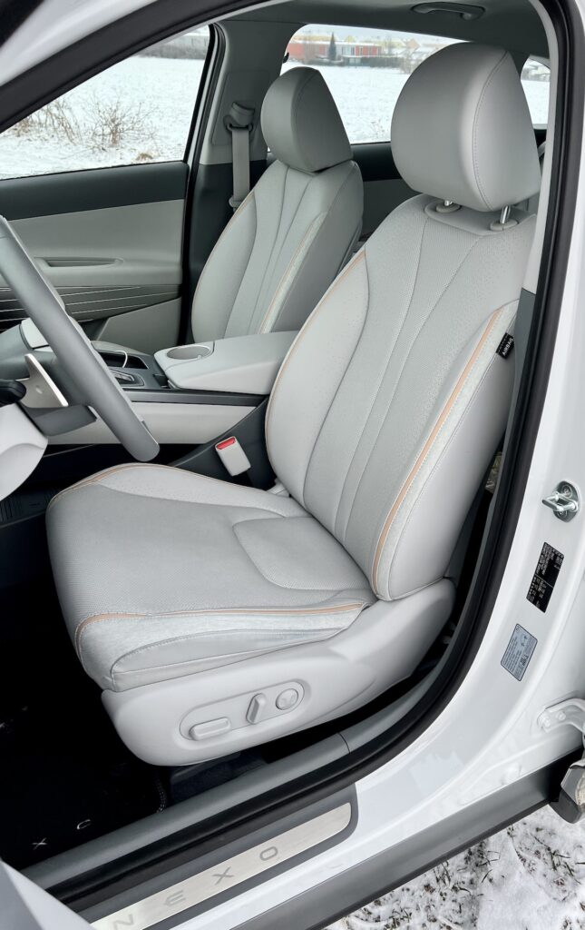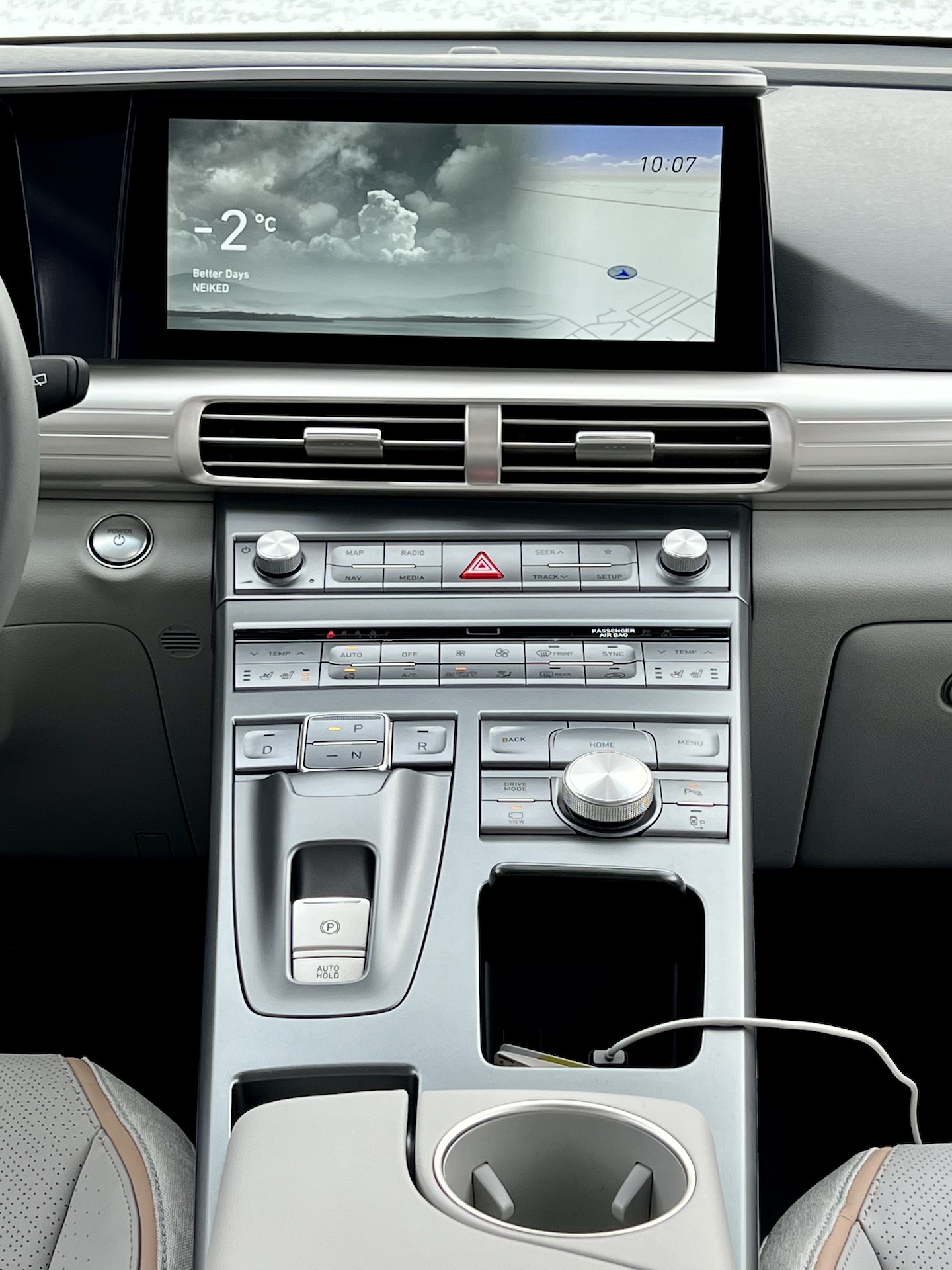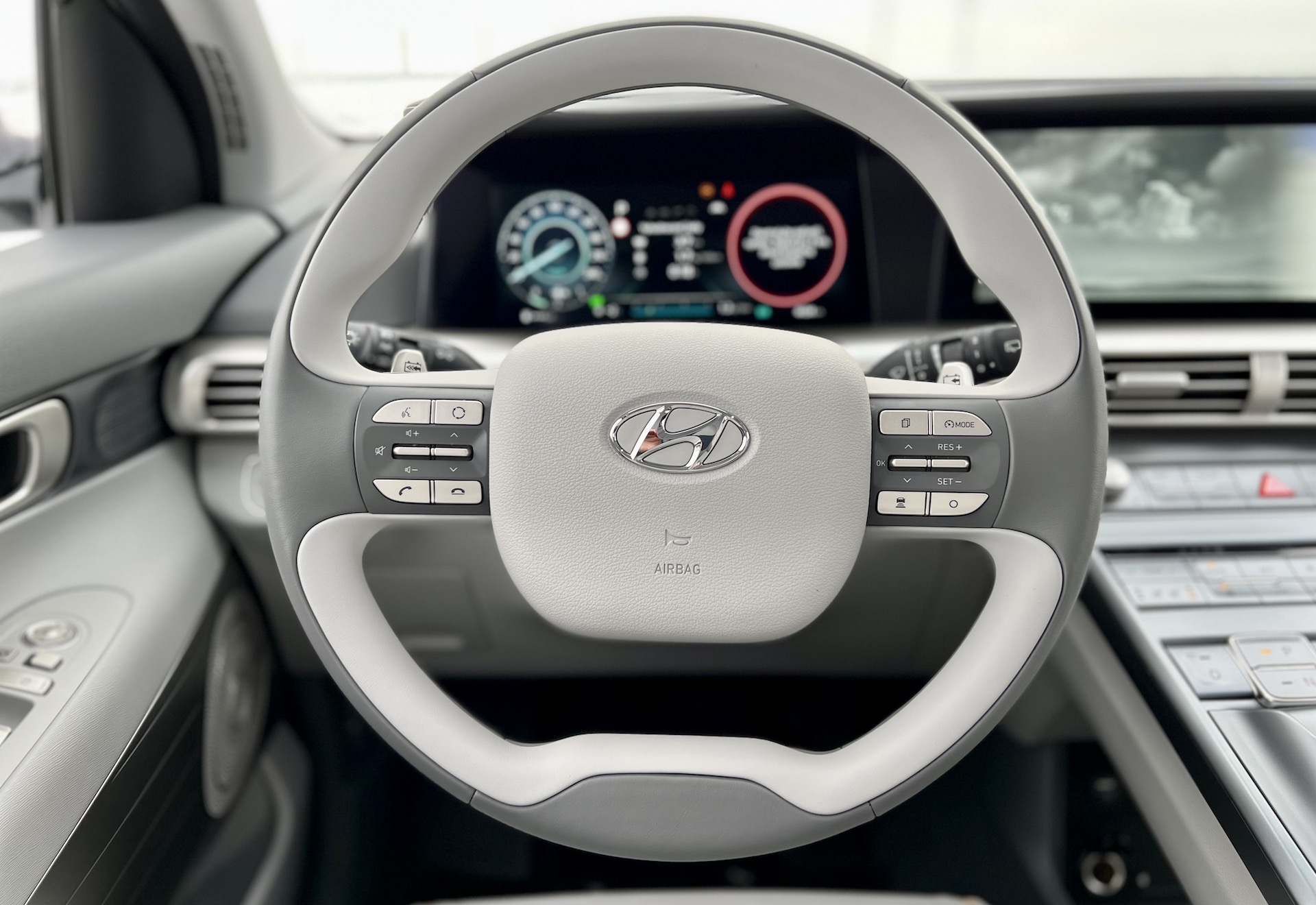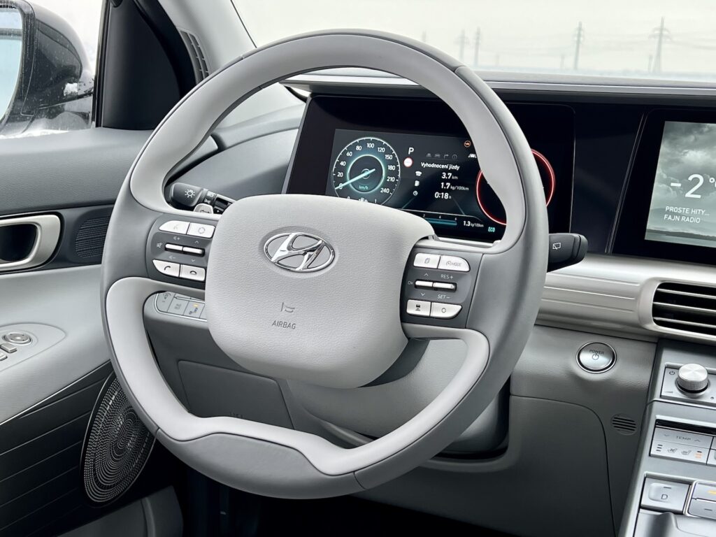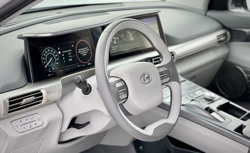 Ani u interiéru se nemám v plánu dlouze zastavovat, byť konkrétně tady – troufám si tvrdit – se Hyundai odvázal trošku více. Ne snad, že by Nexo zvenku nevypadalo nic moc nebo že by mu bílé lakování neslušelo, kdybyste ale usedli dovnitř, hned byste věděli, o čem mluvím. Zkrátka zatímco zvenku bych neměl problém jej zařadit vedle stávající SUV značky, uvnitř nabídne několik hned na první pohled jasně rozpoznatelných prvků, které nesdílí s žádným dalším modelem. Zatímco třeba takovou kapličku přístrojů, tradiční dominantní prvek prostoru před řidičem, poznávám a jak po grafické stránce tak po té ovládací jde o „standardní“ řešení značky Hyundai, volant nebo infotainment a zejména pak jeho ovládací prvky se jasně odlišují. Příjemné funkčně a především pak esteticky je řešení jednolitého panelu, v němž jsou obě velké obrazovky zakomponovány – digitální přístrojový štít i centrální displej audiosystému. I to je na Hyundai netradiční a možná až futuristicky prémiové řešení. Volant překvapí svými pouze dvěma rameny, mně osobně to ale nevadí, čemuž vděčím i celkově velmi povedené barevné i materiálové kombinaci. Celému interiéru totiž vévodí dvě světlé barvy – světlejší béžová (nebo krémová chcete-li) a světle šedá. Přesně v této gesci se odehrává i kožené potažení volantu, kdy šedá kůže z obvodu příjemně vykresluje spodní zesílení a obě dvě ramena. Obdobně vkusně působí i zbytek interiéru vč. sedadel. Snad jen středový panel nemusel spoléhat na leskle šedý plast. Dostáváme se ale k jádru věci, právě tady se totiž nachází jakýsi „joystick“ a několik tlačítek dohromady sloužících pro ovládání infotainmentu. Právě kombinaci mechanického a dotykového ovládání já často kvituji a nejinak tomu bude i v tomto případě. K systému palubní zábavy toho není moc co říct, softwarově se spoléhá na to, na co jsme u Hyundai poslední dobou zvyklí, a to je jedině dobře. Nechybí tak třeba ani zvuky přírody nebo animace pohonu. K tomu všemu Nexo přidává úctyhodně velký 12,3“ displej s příjemným rozlišením. Zkrátka uvnitř je poznat, že se příliš nešetřilo a já osobně bych tento interiér řadil k horní hranici mainstreamu, neb se výrobce o prémiovou atmosféru na palubě opravdu snažil.