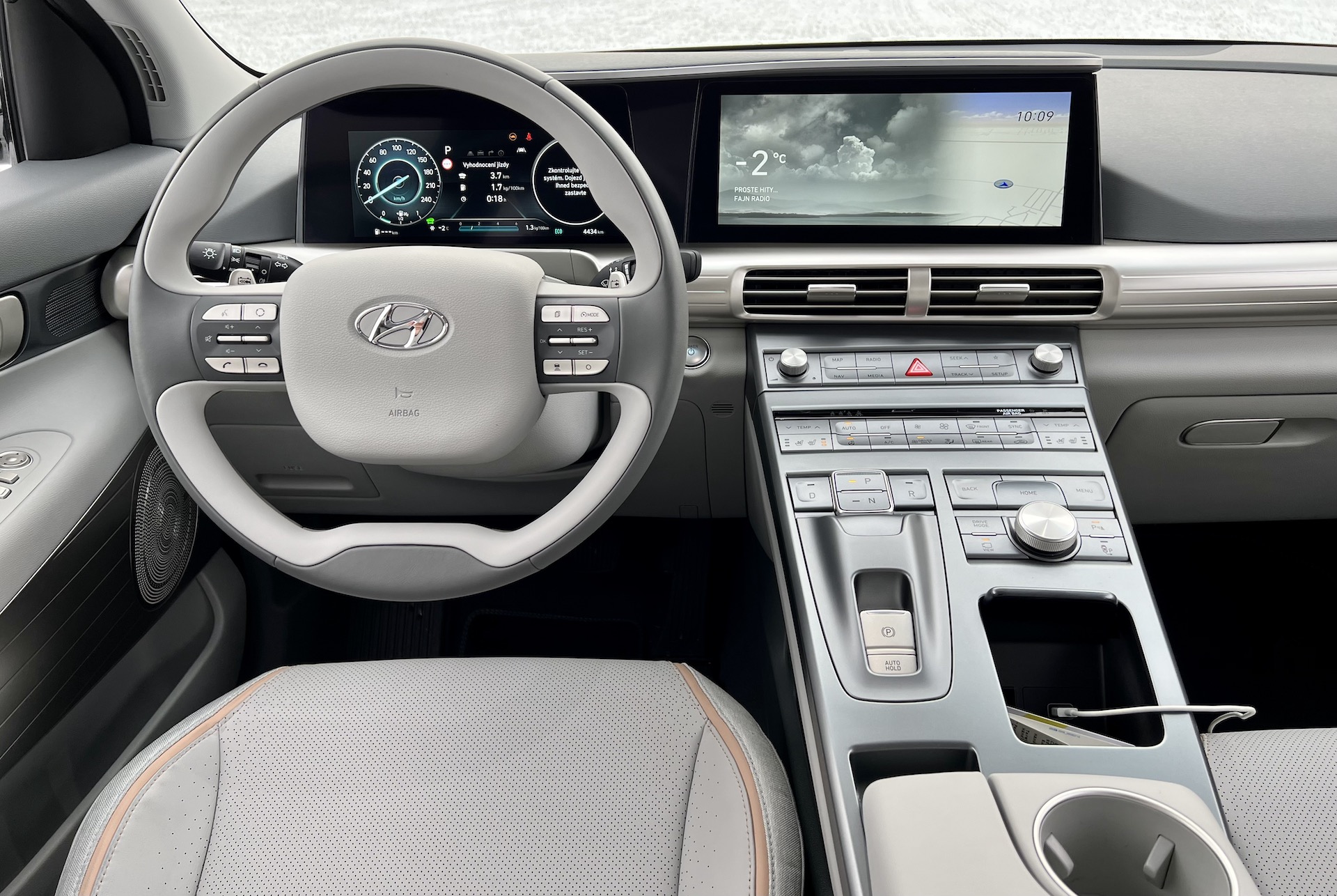 z tradičního elektromobilu, třeba sesterského IONIQu 5, měli byste pocit, že najednou sedíte ve voze o třídu níže. Nexo je sice o něco větším autem, přesto 305 koní, které představují vrchol současného IONIQu 5, bude působit značně živěji. Škoda pak, že (zatím) není v nabídce verze s pohonem 4×4. V současnosti je všech 163 koníků posíláno na přední nápravu. A když už jsme narazili na tu nabídku, musím doplnit, že u Hyundaie v Čechách prozatím oficiální ceník ještě nenajdete. Vyjádření je jasné – dokud nebude vybudována dostatečná infrastruktura (tzn. alespoň jedna čerpací stanice), nebude možné jej v Čechách zakoupit. To je mimochodem asi ten největší kámen úrazu vodíkového auta. Mohli bychom dlouze polemizovat nad tím, jak velké zásoby vodíku máme, jak ekologické je jeho získávání a do třetice všeho dobrého také jaká je jeho cena a s tím související náklady na jeden ujetý kilometr. Od toho všeho se ale můžeme nyní oprostit, protože v našich podmínkách oficiálně není možné vodík do vozu doplnit. Jedinou možnost představuje neveřejná čerpací stanice v ÚJV Řež, která pro pilotní zkušební provoz dodávala vodík