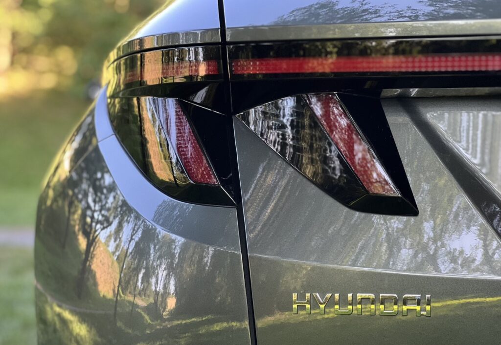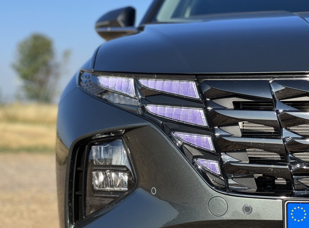 Světla na Tucsonu se mi vždy velmi líbila a stále to platí. Zvláště denní svícení je opravdu poutavé a dodává autu výrazný vzhled. Máme zde pět samostatných bloků světel, které jsou umístěné v okolí mřížky chladiče a svítí všechny najednou. Vzhledově auto působí velmi masivně a robustně, i když ve skutečnosti nemá takové rozměry, jak by se mohlo zdát. Maska je hodně mohutná a dodává na dojmu velkoleposti. Pohled zezadu ale ukazuje, že auto není tak široké a nafouknuté, jak na první pohled vypadá.