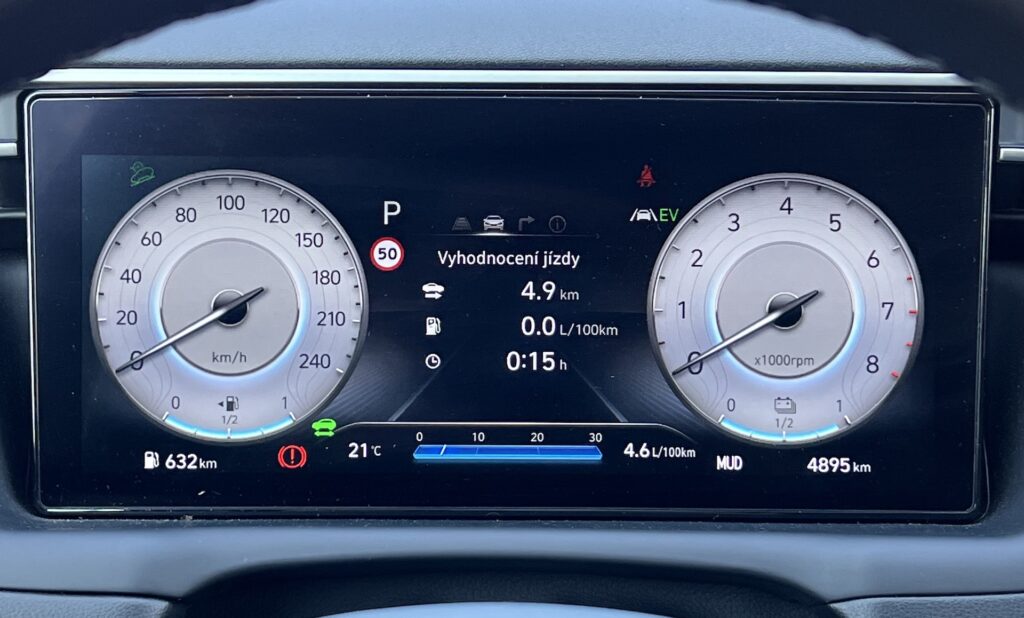 Nasedám do auta, startuji a jedu. Možná je to špatně řečeno, žádný velký start se nekoná, plug-in hybrid mám totiž nabitý, a tak spalovací jednotka zatím vůbec nenaskakuje. Tucson v plug-in hybridní variantě kombinuje známou benzínovou přeplňovanou 1.6 o výkonu 132 kW s elektromotorem o výkonu dalších 67 kW. Systémově spolu umí dosáhnout maximálních 195 kW a nabídnou i pohon 4×4. 265 koní a k tomu 350 Nm točivého momentu jsou za mě parametry pro pohon středně velkého SUV naprosto dostačující. Po Praze se s autem jezdí velmi dobře a za málo, a to především ve chvíli, kdy je dostatek energie v baterii. Na jedno nabití lze s klidným stylem jízdy při městském provozu ujet i lehce přes 50 km, což rozhodně není špatné. Jakmile je baterie vybitá nebo vynutíte skrz nastavení jízdních režimů pohon primárně na spalovací motor, s efektivitou provozu to už tak slavné není. Stejně jako u ostatních plug-in hybridů tak platí i tady, že roste smysluplnost pohonu s tím, kolik procent dokážete absolvovat čistě na elektřinu. Stejně tak, jako si dokážu představit cesty ve městě takřka bez použití benzínového motoru (tzn. s nulovou spotřebou), tak si při vyšším dálničním tempu umím představit na palubním počítači hodnoty třeba i přes 8 l/100 km. Celkový pocit z jízdy je ale velmi dobrý, auto se chová velmi předvídatelně, řízení je možné lehce přeposilované, ale ani to mi u C-SUV nedokáže zkažit náladu. Výkon je více než dostačující a autu se nedá upřít hezký odpich. Po najetí nějakých těch kilometrů musím ale ocenit, že vše má své tlačítko. Neměl jsem pocit jako v moderních autech, kde musím vše proklikávat za jízdy na displeji, ale na vše jsem si našel tlačítko a při jízdě už věděl kam sáhnout. Týdenní ježdění s Tucsonem PHEV tak považuji za velmi příjemné.