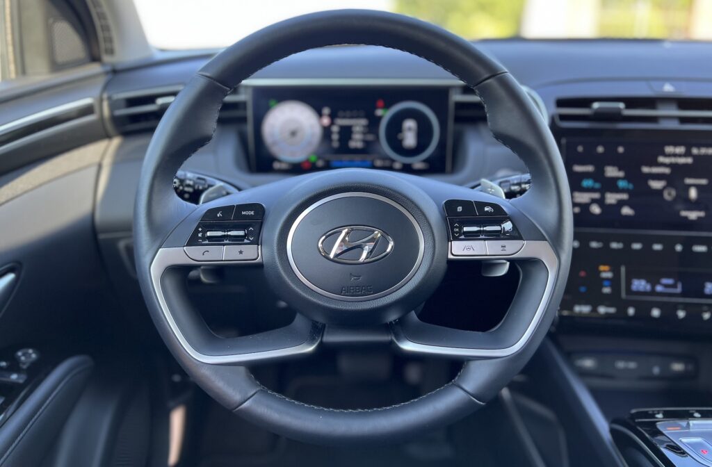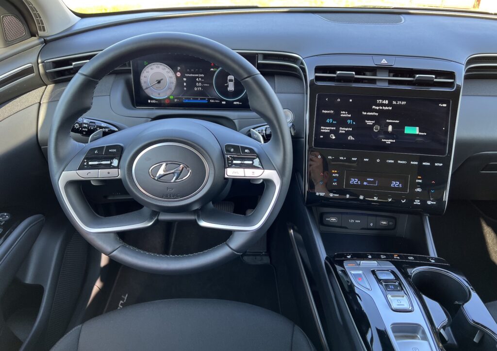 Na první pohled je vidět, jak se Hyundai u interiérů posunul a odkud čerpal inspiraci. Nejvíce vás to praští do očí u velkého displeje na středovém panelu, tlačítek na volantu a výdeších klimatizace. Když už jsme u volantu, tak ten je vyhřívaný, což v zimě určitě každý ocení. Moc se mi zalíbilo, že auto umí samo reagovat, pokud vjíždíte do uzavřeného prostoru a zapne vnitřní cirkulaci vzduchu. To vše, stejně jako většina zbývajících prvků interiérů, patří už k dnešní klasice značky Hyundai. Rozhodně to ale není špatně. Třeba takový kompletně digitální přístrojový štít, kterým je vybaven každý Tucson od druhého výbavového stupně Comfort, patří k tomu nejlepšímu, co dnešní automobilový svět nabízí. Líbí se mi i to, jakým způsobem se mění jeho grafika v návaznosti na zvolený jízdní režim. Pokud bych u displejů ještě chvilku zůstal, stěžovat bych si nemohl ani na centrální displej systému palubní zábavy. Hyundai nabízí jeho dvě verze – 8“ a 10,25“ provedení. Moderní konektivita je i tady samozřejmostí. V neposlední řadě je pro interiér zejména u vozů typu SUV důležitá prostornost. Největším SUV značky je sice Santa Fe, nicméně ani Tucson, hrdý zástupce třídy C-SUV, se nenechá zahanbit. Základní objem zavazadlového prostoru činí sice u námi testované plug-in hybridní varianty o 19 litrů méně (558 litrů proti 577), s dieselovými motorizacemi je objem ale ještě o osm litrů nižší. Ani to ale není málo a stěžovat si nemohou ani pasažéři středního vzrůstu sedící na zadních sedadlech. Celkově tak hodnotím vnitřní prostor nového Tucsonu pozitivně. Teď už ale k jízdě.