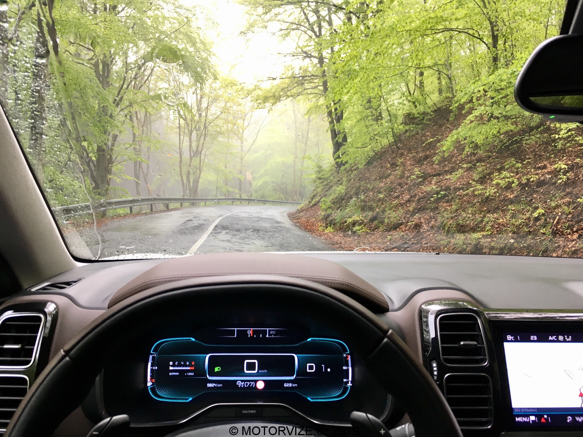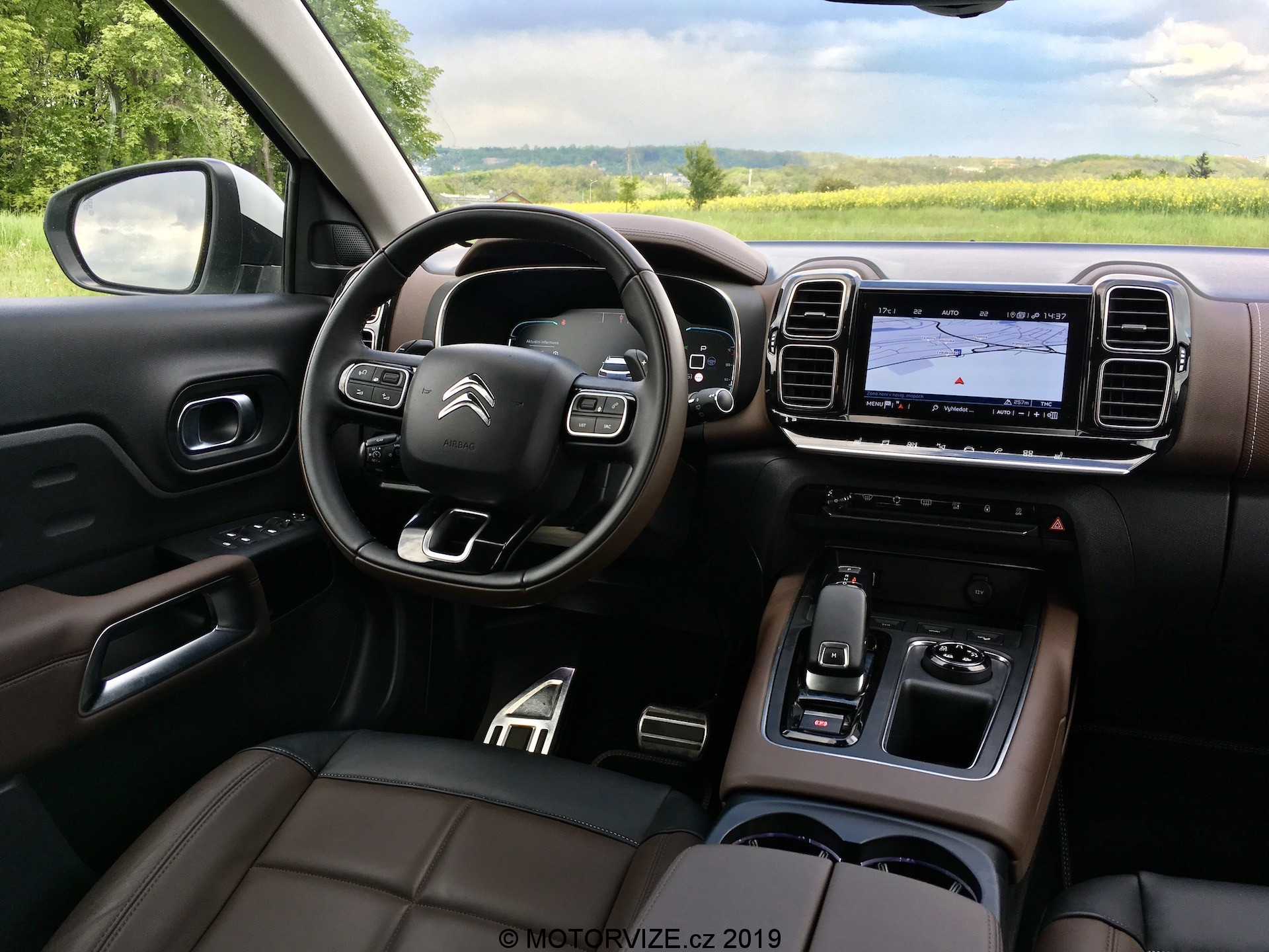 Kromě designu se C5 propaguje jako nejpohodlnější SUV v kategorii, díky tlumičům s progresivními hydraulickými dorazy a sedadlům Advanced Comfort a například dvojitým bočním sklům pro lepší odhlučnění. Co se týče podvozku – auto je pohodlné, ale rozhodně nečekejte zázraky – pořád jsou to klasické tlumiče, pořád je to vyšší auto s vyšším těžištěm a požadavkem na bezpečnou jízdu. Prohlášení o tom, že auto jede jako na vzduchovém polštáři, tak to platí hlavně o jemných nerovnostech typu dlažební kostky a spáry, které v autě jsou opravdu cítit jen stěží – na větších výmolech si auto umí pěkně po francouzsku bouchnout a zatřást se. Ale běžné rozbité silnice se záplatami a malými výtluky pobírá podvozek statečně, to se mu musí nechat. Ve světě SUV, která kromě výšky ještě dávají na odiv svou sportovnost (a jsou tak velmi tvrdá), poskytuje Citroen i na největších kolech 205/55 R19 komfort v této třídě nevídaný. Nižší výbavy mají kola o pár palců menší, což ještě výrazně posune pocit z toho co podvozek “pobere”. Co se týče hluku, i tady nelze než nechválit – zesílená boční okna tlumí hluk od zrcátek, kola jsou slyšet jen minimálně a v normálním režimu jízdy se ani motor neprojevuje hlukem. Při vytočení je motor samozřejmě slyšet ve formě jednolitého hučení.