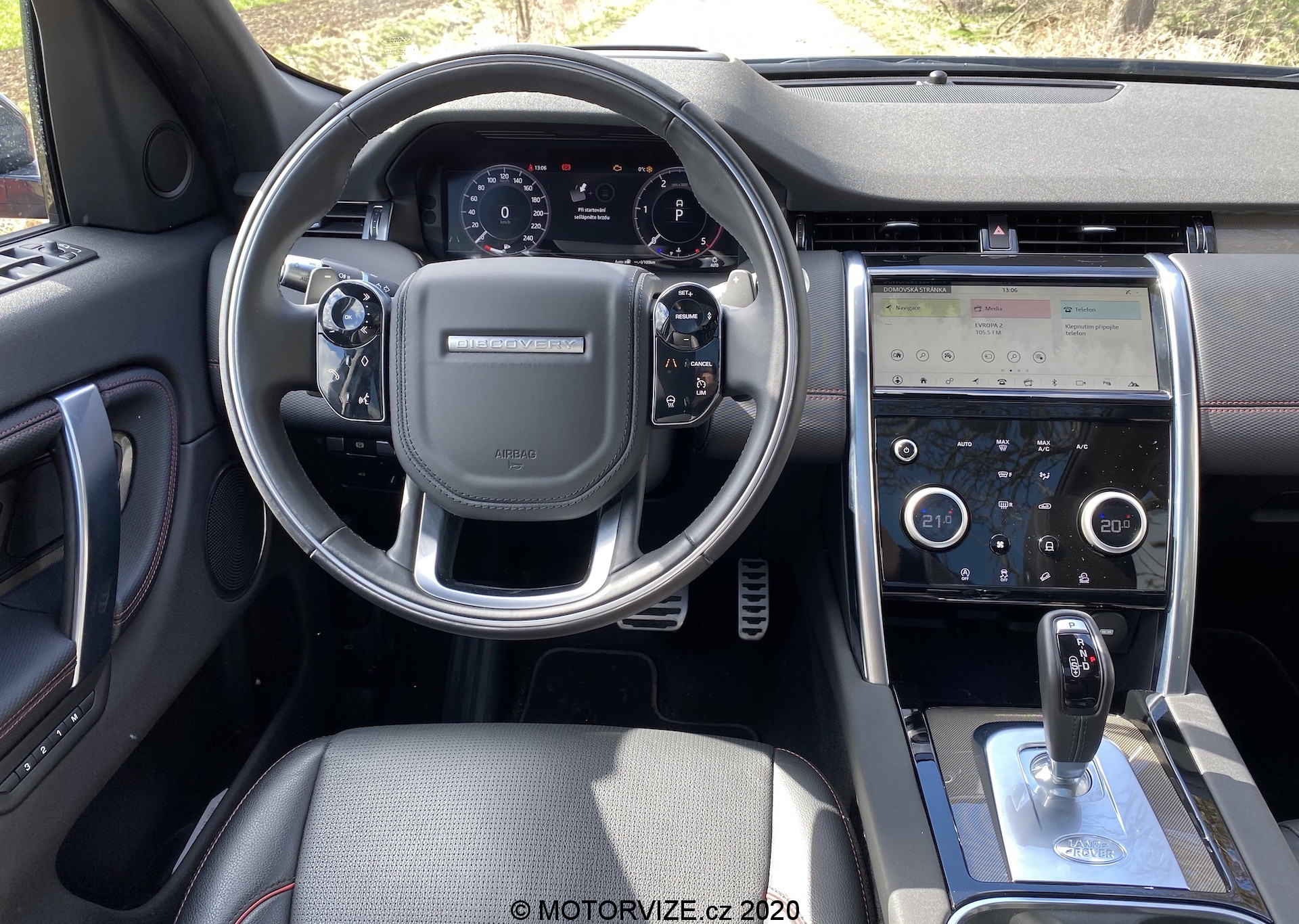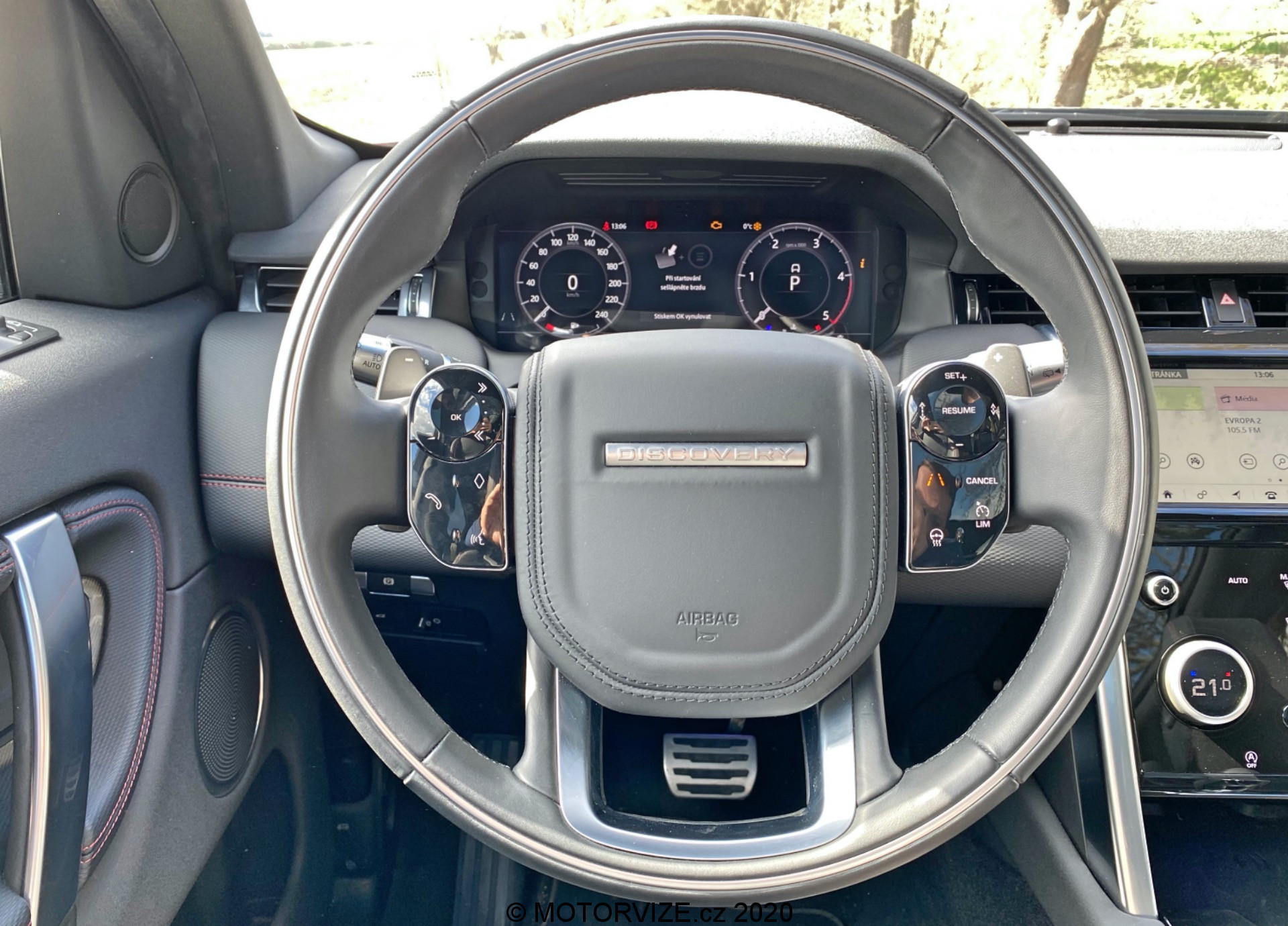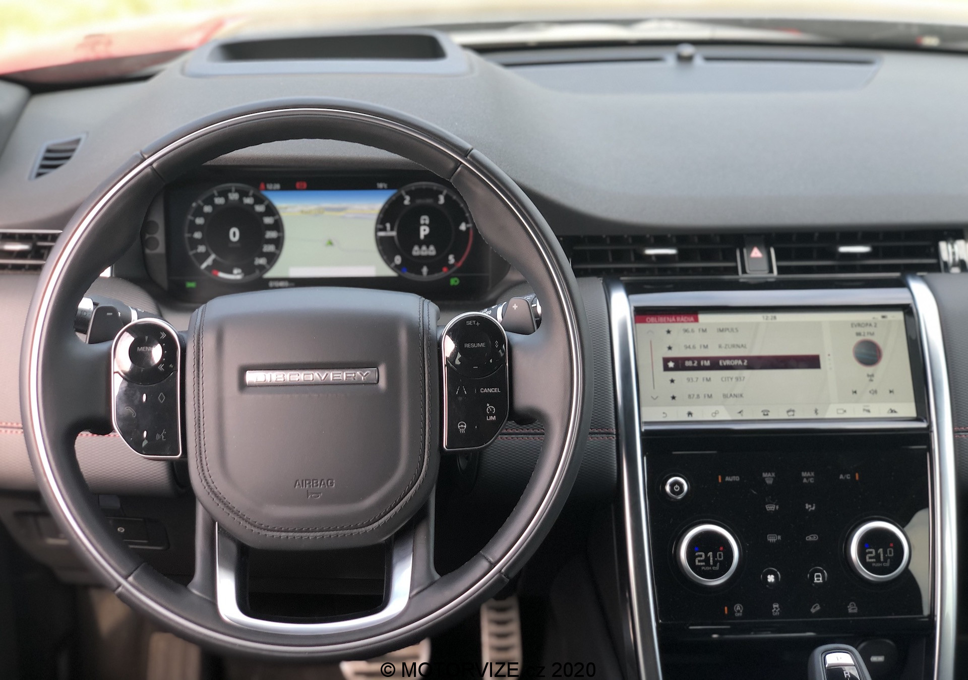 Různé možnosti zobrazení displejů společně s multimediálním systémem příliš rozebírat nechci. Jednoduše řečeno vše vypadá skvěle, pracuje svižně a kompatibilita je příkladná. Co mne ale opravdu zaujalo, je středový panel po displejem, který vypadá jako klasický černý klavírní lesk nicméně v momentu, kdy máte potřebu, nebo chuť změnit rychlost ventilátoru klimatizace, zapnout vyhřívaní předních křesel, nebo navolit ten pravý jízdní režim, stisknete příslušné tlačítko a právě tento lesklý povrh je náhle prosvícen v jiném bodě a ovladač teploty klimatizace promění svou funkci dle vašeho požadavku. Jsem ohromen. Stejné zpracování funkčních tlačítek nalezneme i na volantu. Zpočátku to může být trochu zmatečné… Chce to trpělivost… Jakmile si na tyto možnosti navyknete, oceníte čistotu pracovního prostoru bez vysokého počtu různých přepínačů a spínačů, tohle se opravdu povedlo. A už jsem zmínil, jak vás bude bavit dotykově točit s ovladačem hlasitosti na volantu? Mezi inovace lze zařadit i středové zpětné zrcátko, jenž se umí z klasického změnit v displej zobrazující o něco širší obraz a umožňující nastavení sklonu i jasu. Nebudu lhát, toto řešení jsem měl možnost zkoušet už kdysi v Evoque, tady jsem si na něj ale poprvé opravdu zvykl. V neposlední řadě bych se rád zastavil ještě u jedné, často opomíjené drobnosti. Tovární (vestavěné) navigace už dneska příliš nepoužíváme – oddáváme se především těm internetovým i se všemi jejich výhodami i nevýhodami, a to především díky CarPlay či Android Auto, jejichž konektivitu Land Rover samozřejmě nabízí. Discovery mě ale doslova nutila používat i vlastní mapy. Důvod byste neuhodli. Jde především o jejich skvělou grafiku a možnost vyvedení do digitálního přístrojového štítu přímo před řidiče. Mezi mnoha možnostmi zobrazení se navíc ukrývá i ta zobrazující mapu přes celý displej, což je tak odzbrojující, že bych se snad vrátil v čase. Digitální přístrojovku koncern Jaguar/Land Rover uvedl před lety jako jeden z prvních a mnoho toho na ní dodnes neměnil. Víte proč? Protože je jednoznačně skvělá – nabízí mnoho různých režimů zobrazení a volbu jednotlivých informací.