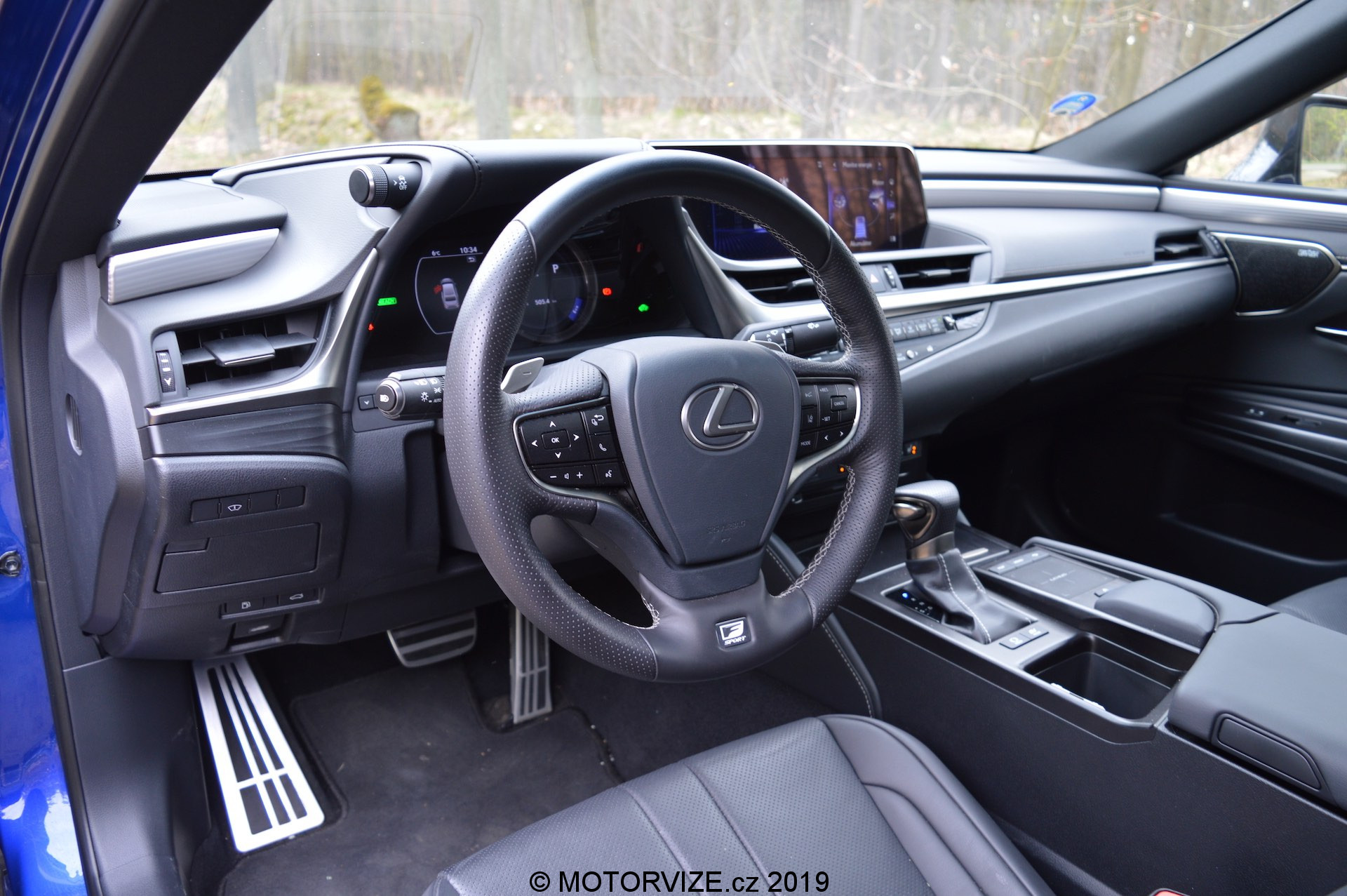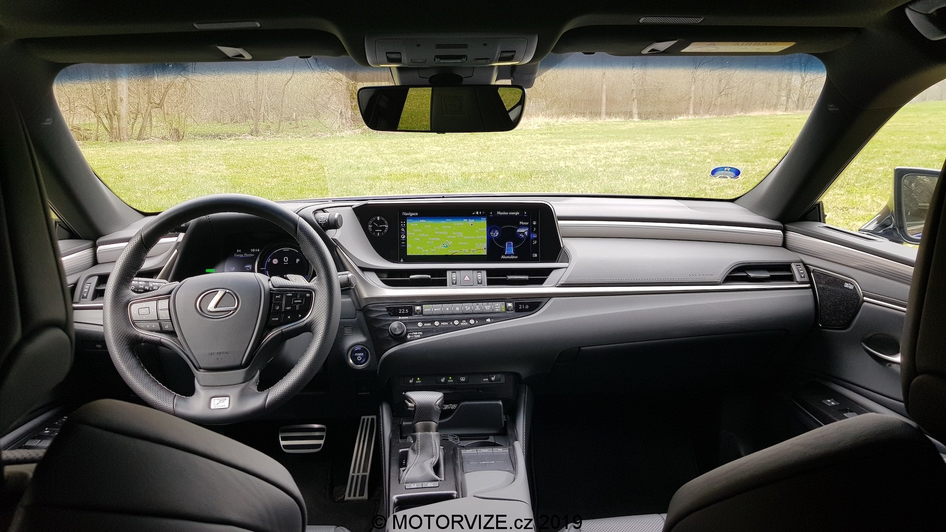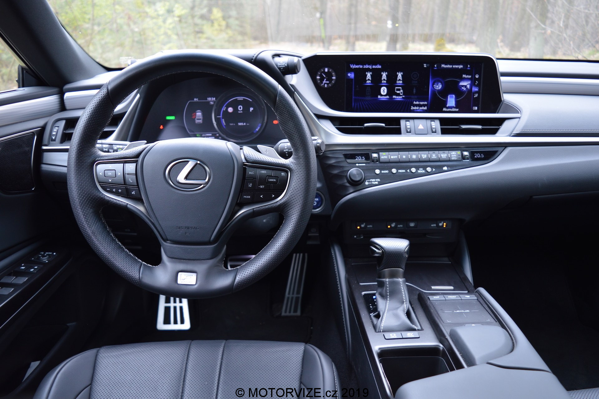 Při návrhu celkového vzhledu a pojetí kabiny ES vycházeli designéři z koncepce „Lexus Future Interior“, která spojuje řidičsky zaměřený kokpit s prostornou a pohodlnou zónou pro předního spolujezdce. Před řidičem je kaplička přístrojů s typickým pohyblivým budíkem, jenž dokáže zobrazit veškeré informace o jízdě a o vozidle tak, že řidič nemusí spouštět oči z vozovky. Navíc má k dispozici i HeadUp displej s velmi ostrou grafikou a jasnými barvami (seřízení HUD lze ke všemu najít rychle a je intuitivní). Sportovní tříramenný volant padne příjemně do ruky, má silný věnec s perforovanou kůží. Ve středu je mírně utopený 12palcový nedotykový displej pro informační systém vozu, který se ovládá přes touchpad umístěný na středovém panelu. Setkal jsem se s názorem, že ovládání je příliš komplikované, dobré akorát tak pro raketové inženýry, ale to já sám potvrdit nemohu. Po chvilce zkoušení jsem se se systémem sžil a dokázal ho ovládat naprosto intuitivně bez nutnosti koukat, na co šahám. Jedinou velkou výtku bych k němu ale měl. Lexus zatím nelze spojit s telefonem a zrcadlit jeho obsah prostřednictvím konektivity Apple CarPlay nebo Android auto. Na oficiálních stránkách výrobce jsem se ale dočetl, že i tato funkce by měla přijít v některé z aktualizací ještě tento rok. Na levé straně vedle displeje jsou malé analogové hodiny, které mi připadají, že do takto „technického“ interiéru ani nepatří a vlastně se v něm i ztrácejí. Níže se nachází několik klasických tlačítek na ovládání klimatizace a rádia (palec nahoru).
