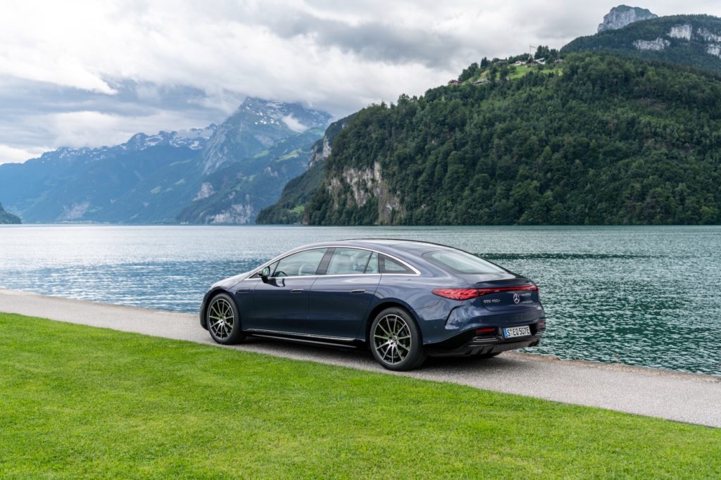 Sílu motorů jsme představili již v úvodu, pojďme se proto podívat na ostatní faktory a funkce, které nový Mercedes posouvají dopředu. K mimořádné ovladatelnosti a dynamice modelu EQS přispívá standardně dodávané natáčení zadní nápravy s úhlem otočení kol až 4,5°. Alternativně si mohou zákazníci objednat natáčení zadní nápravy, u něhož se zadní kola otáčejí do stran až o 10°. Tuto variantu lze navíc aktivovat dodatečně prostřednictvím bezdrátových aktualizací OTA (Over-the-Air). Průměr otáčení více než pětimetrového sedanu se tím zmenší na 10,9 metru, což je průměr otáčení mnoha modelů kompaktní třídy. Na centrálním displeji jsou v menu jízdních režimů zobrazovány příslušné úhly otočení kol na zadní nápravě včetně předpokládané trajektorie jízdy vozu.