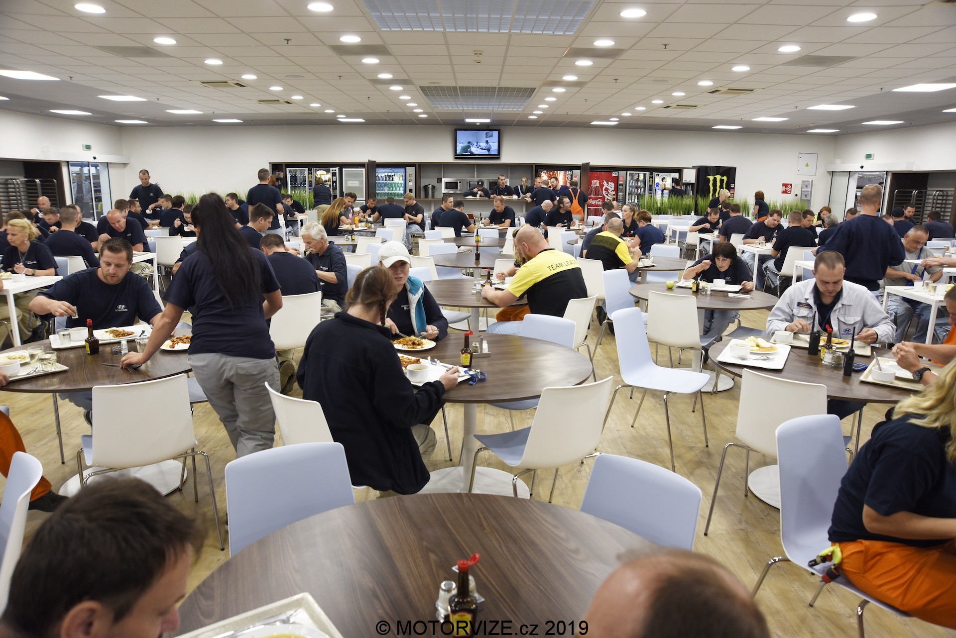 Co nás čekalo jako první? Samozřejmě že nějaký ten úvod a hlavně seznámení s celou automobilkou. Shlédli jsme video, kde bylo řečeno vše, co by vás mohlo napadnout. Věděli jste třeba, že tisíce stromů, které zde byly dříve místo areálu, nebylo vykáceno, jak to dělá většina subjektů, nýbrž došlo v každém jednotlivém případě k náročnému přesazení na jiné místo? Tento obrovský komplex navíc zajišťuje práci více než třem tisícům osob. Pracují zde převážně muži, což není vzhledem k oboru nic překvapujícího, najdete tu ale i mnoho žen. Po vyslechnutí základních informací, které jsem přijala s obdivem, jsme se převlékli do pracovních oděvů a ještě před „tvrdou prací“ následoval náš oběd.