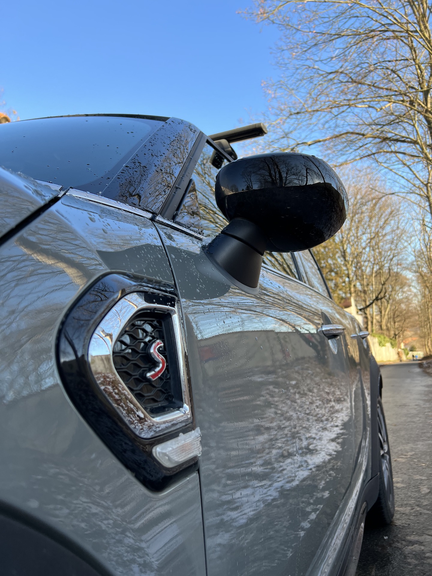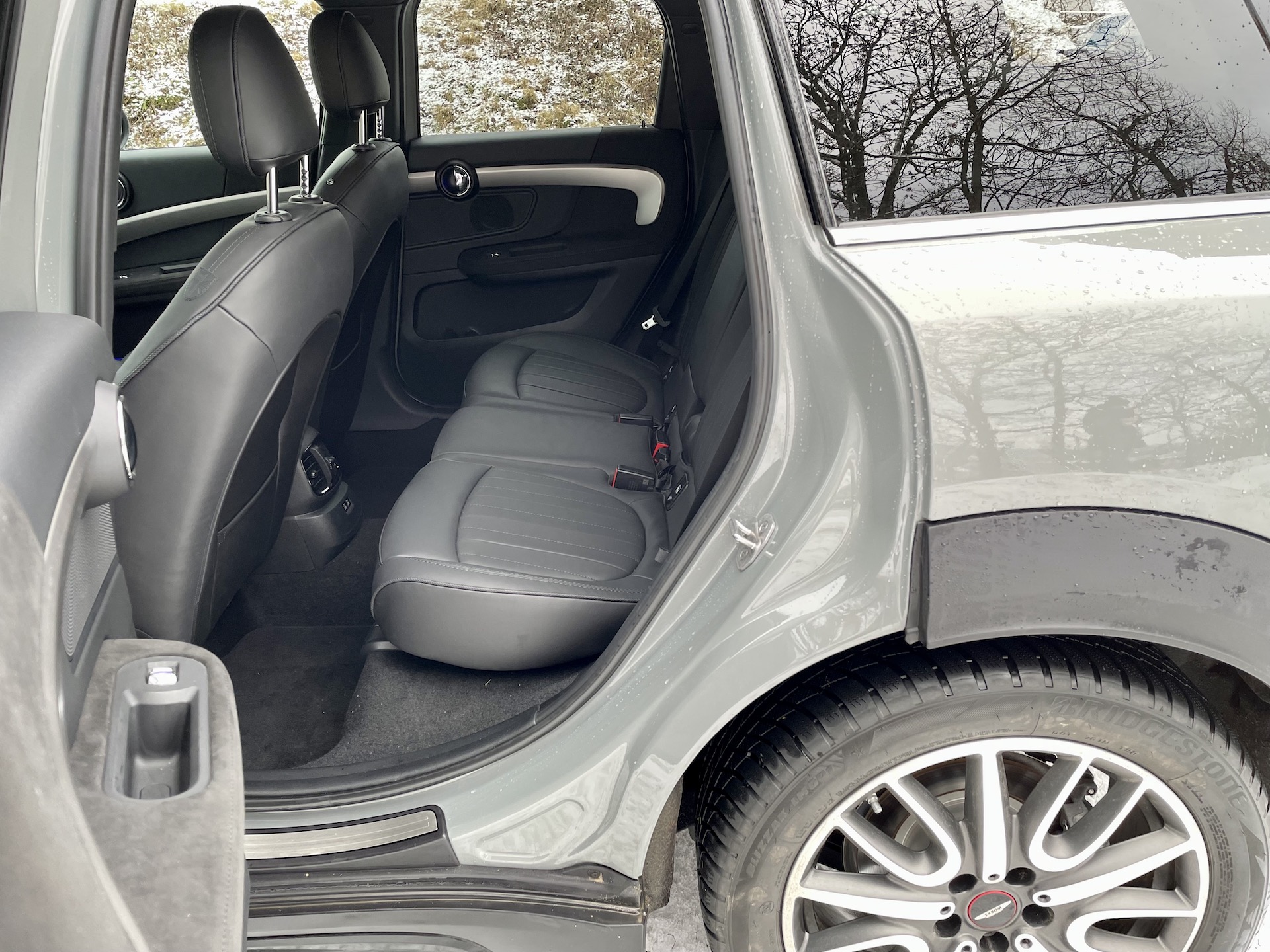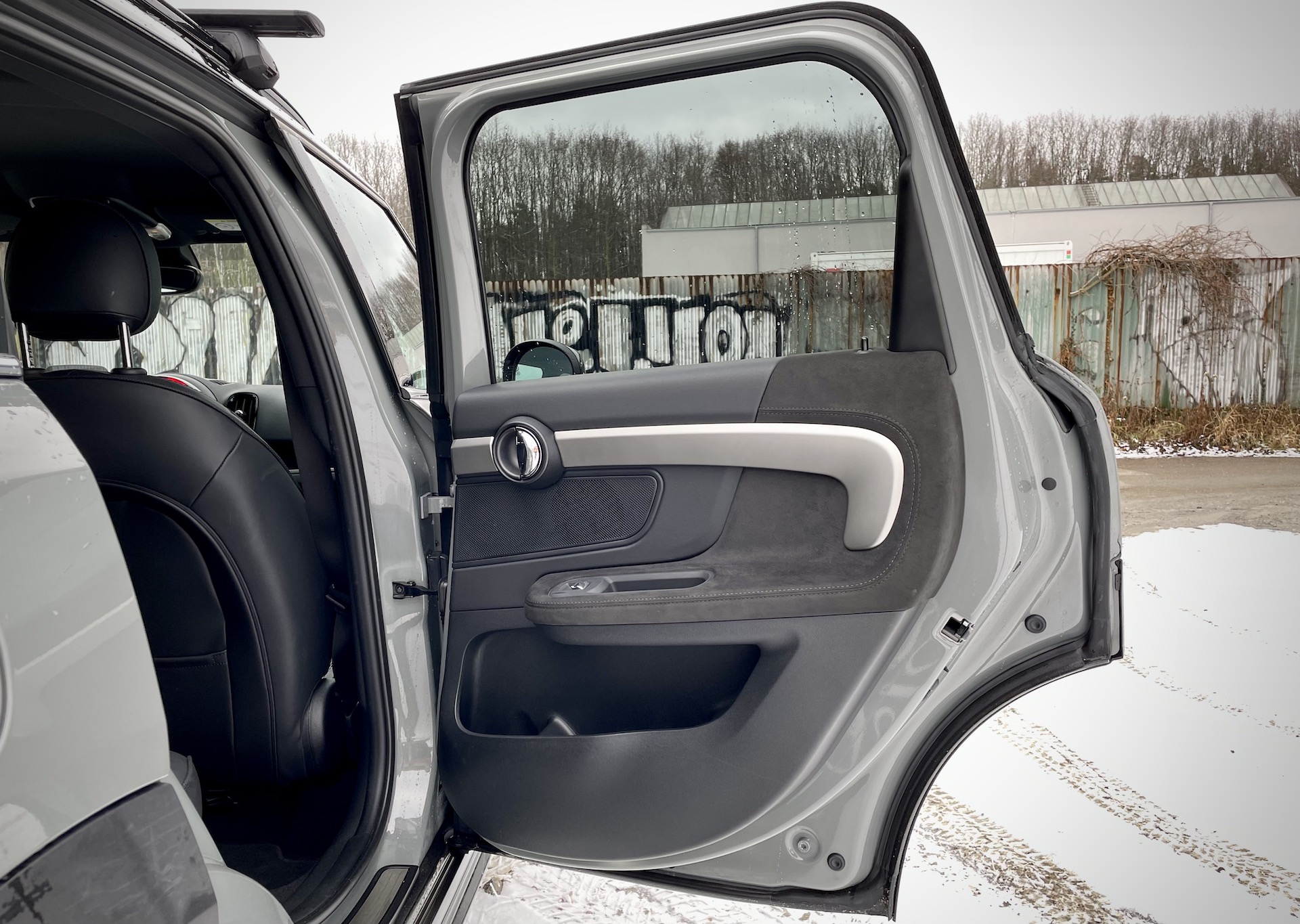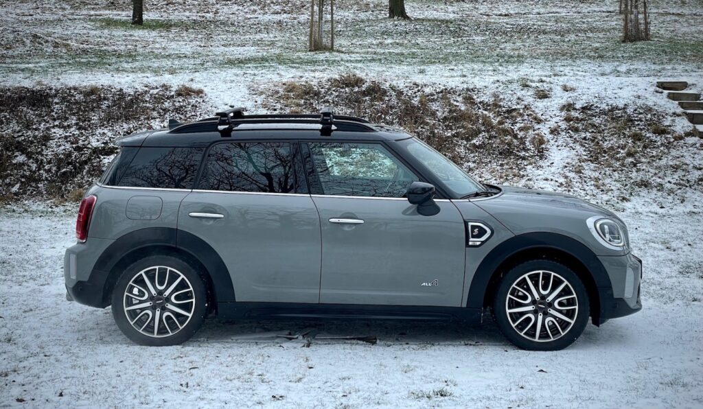 Boční profil díky jednotlivým detailům stále připomíná miníka i s tím, že je trochu na „steroidech“. Jsou to popořadě poměrně kolmé přední okno, kulatá zpětná zrcátka, zaoblené pochromené kliky a především boční profil, připomínající velký hatchback – oproti původním Mini spíš obrovský, ale ten základní tvar, ten tam je. Zajímavá je také kombinace šedé barvy, která mi v určitých chvílích připadá až lehce zelenkavá, a černých doplňků, tedy doplňků – černá je celá střecha, včetně A, B i C sloupků a doslova neprůhledných zadních oken. Vrchní a spodní část vozu od sebe odděluje tenká opět chromovaná linka, která se táhne okolo celého vozu. Boční profil je sice v této karosářské variantě asi nejméně sexy, ale pěkné a vyvážené auto to je.