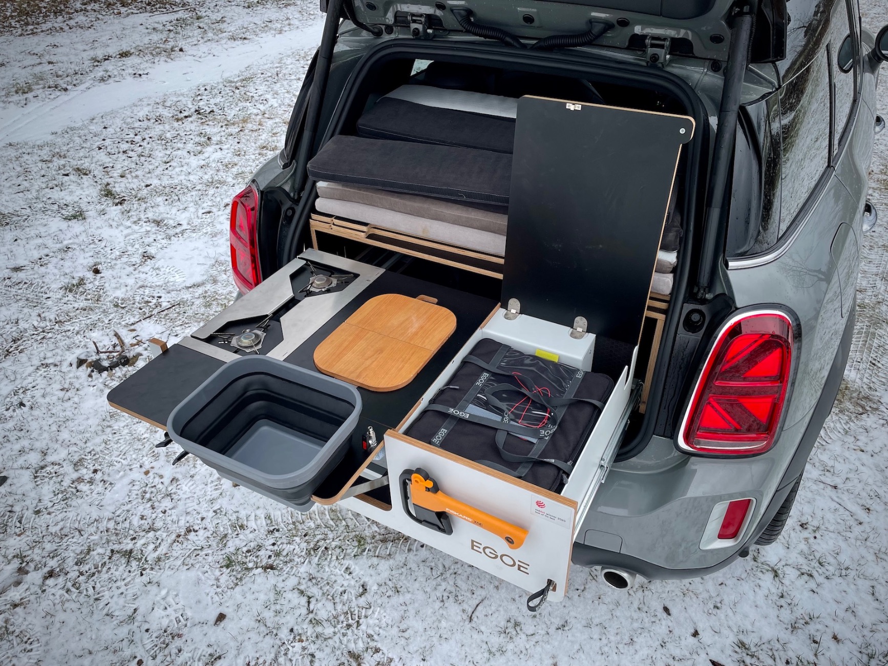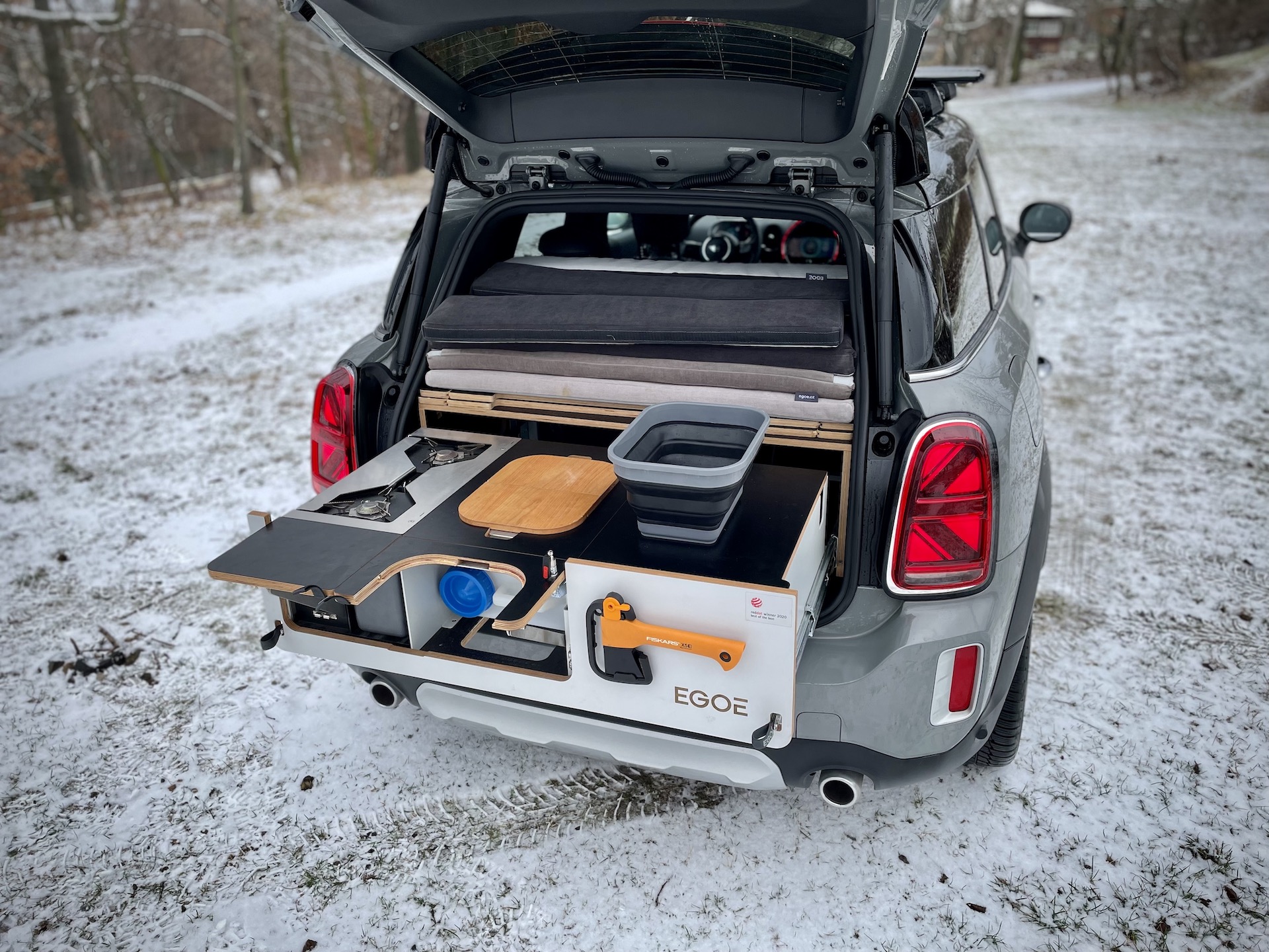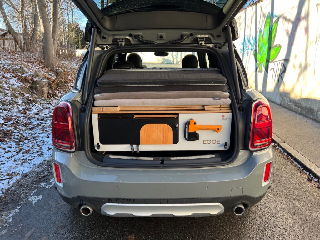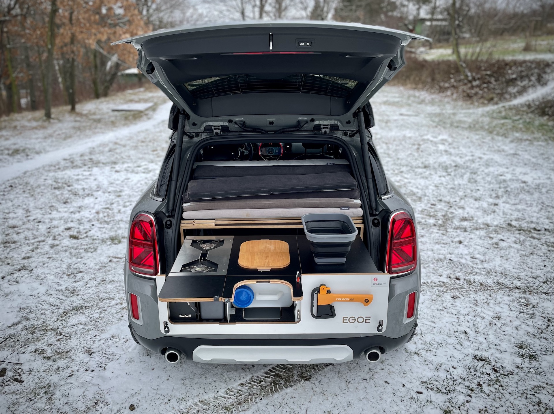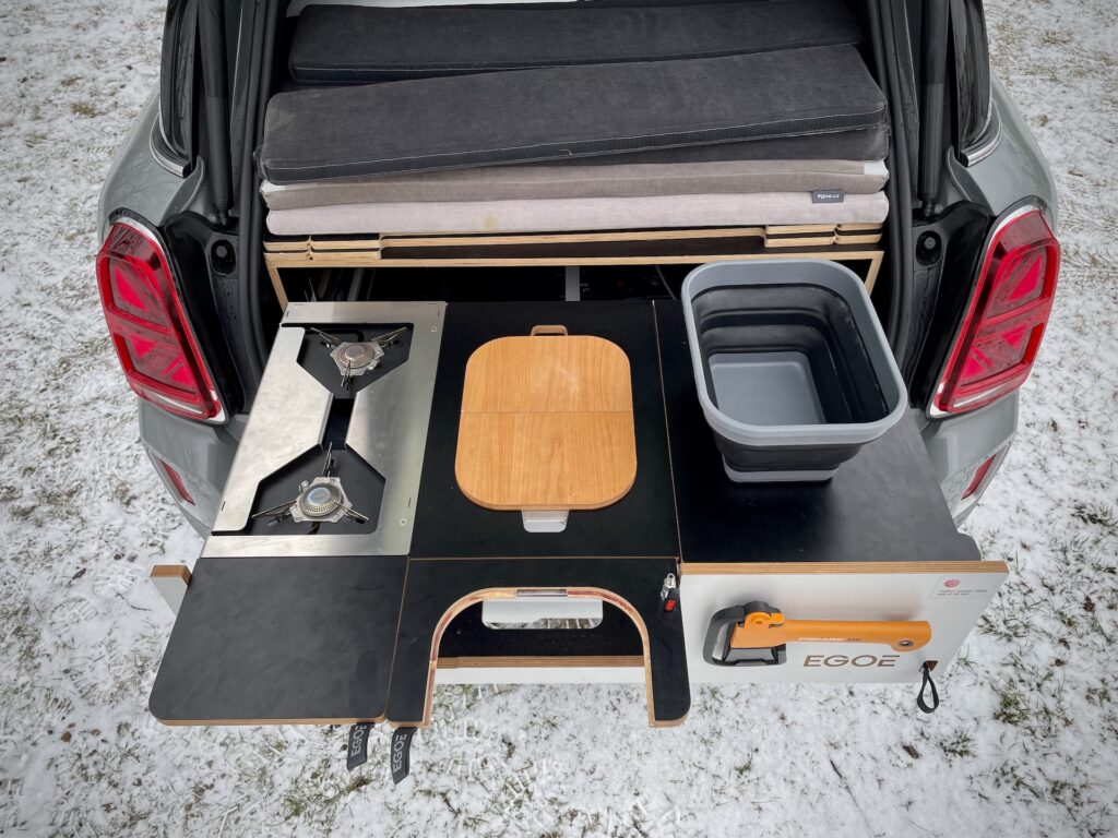 Konkrétní testovaný kousek přijel vybavený vestavěnou (demontovatelnou) kuchyní a lůžkovou úpravou včetně možnosti umístění stanu pro dvě osoby na střechu. Navíc je zde i možnost vytvoření třetí „postele“ místo zadních sedaček. Lepší představu o této úpravě si můžete na základě přiložených fotek. Našel jsem ledničku, sporák, pracovní plochu, nůž, skládací misku a dokonce sekyrku – asi na lov toho, co pak budu vařit. Osobně mi vestavba do takhle malého auta nedává moc smysl, ale pro někoho to evidentně bude zajímavé. Co si o takové úpravě myslíte vy? Samozřejmě se vše dá z kufru vyndat… A ten pak bude k dispozici. No je to volba… Kufr, nebo kuchyň?