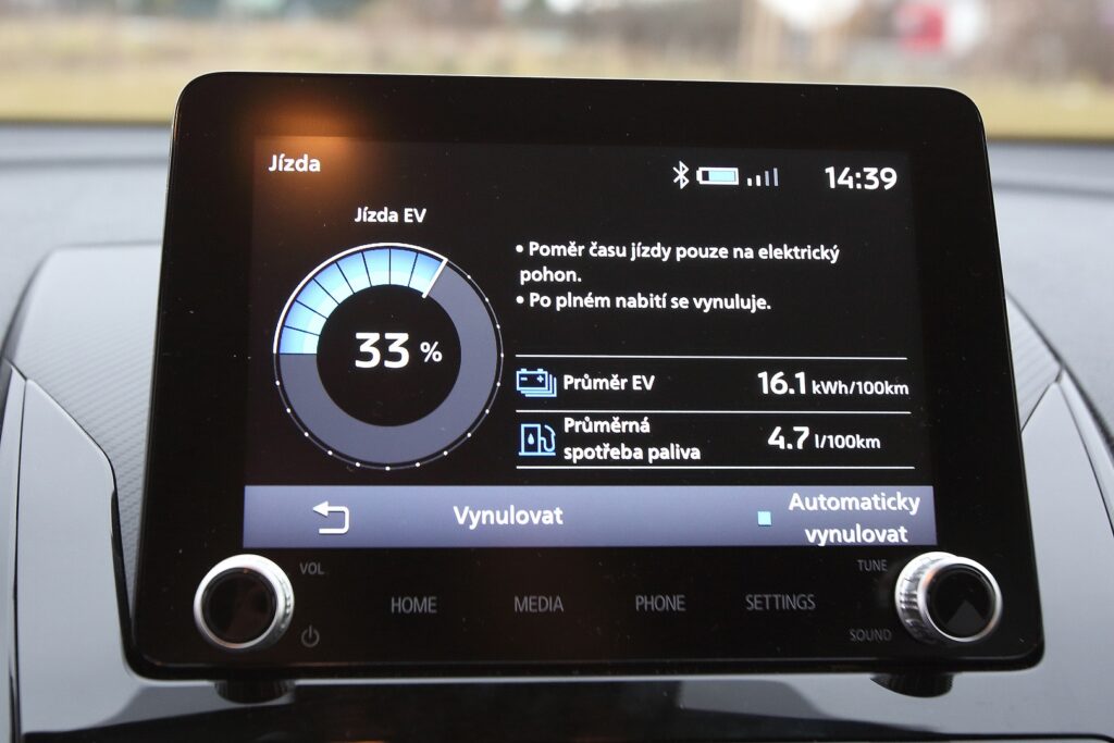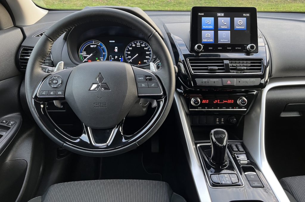 Startujeme a vyrážíme vstříc novým zážitkům. Start, jak už jsme zvyklí, nelze vůbec pocítit, jako by se nic nedělo. Po sešlápnutí plynu se naprosto plynule rozjíždíme. Není slyšet vůbec nic, jenom slabé bzučení. První dojem je perfektní, cítím krásně tuhý podvozek, nízké těžiště díky bateriím, a i na typických „českých“ silnicích auto filtruje nerovnosti. Jízda přes různé výmoly nebo zpomalovací prahy je jak na obláčku. To se opravdu povedlo. Po většinu cesty se ani spalovací motor nezapne. Když už na něj dojde, přeci jen je trochu slyšet, ale není to nic, co by vás snad jenom trochu rušilo z klidné jízdy. Elektřinu můžete také rekuperovat. Síla rekuperace lze nastavit v 6 stupních tedy od B0 po B5, kdy v režimu B0 v podstatě plachtíme a v B5 se vůz dá ovládat pouze jedním, a to plynovým pedálem. Jakmile na něj přestanete šlapat, Eclipse výrazně brzdí. Tyto stupně ovládáme pomocí páček pod volantem v podobné logice jako u přeřazování automatické převodovky u jiných vozů. Páčky jsou velmi příjemné na dotek, poctivě hliníkové, žádný plast. Vše krásně funguje přesně do doby, než klesne kapacita baterie pod 30 %, nebo dokud nepřekročíte rychlost 135 km/h. V tomto případě se rozběhne benzínový motor, jenž pohání přední kola a stále dobíjí baterie. Zde je znát pouze 72 kW čtyřválcového motoru, který má přeci jenom s téměř dvoutunovým vozem trochu problémy. Po zastavení a připojení vozu na rychlonabíječku, které naštěstí jsou již dnes standardem u každého většího nákupního areálu, můžete Eclipse nabít na 80 % zhruba za 25 minut. To je mimochodem velká přednost řešení Mitsubishi. Jediný, kdo u plug-in hybridu nabízí rychlonabíjení typu DC, je snad Mercedes-Benz, a to jsme o jednu až dvě třídy jinde. Snad jen škoda, že se Mitsubishi stále spoléhá na v Evropě dnes už postupně opouštěný konektor CHAdeMO. Po Praze se pak dá za pomocí častého dobíjení jezdit se spotřebou 17-19 kWh na 100 km a za 0 l benzínu. Pokud ovšem nebudete nabíjet a spolehnete se na vyrábění elektřiny spalovacím motorem, můžete počítat se spotřebou i 10 l na 100 km, a to úplně pozitivně hodnotit nejde. Má spotřeba byla někde kolem 14 kWh/100 km a 3 l benzínu na 100 km, což už určitý smysl dává. Zkrátka a jednoduše v tomto případě platí zcela na 100 %, že čím více dobíjíte, tím zajímavější (ekonomičtější a ekologičtější) provoz Eclipse je. Škoda jen, že to dálniční tempo (předpisových 130 km/h) není žádnou hitparádou, uměl bych si představit o trochu vyšší (akustický) komfort a nižší spotřebu. To je ale zapříčiněno primárně tím, že elektřina už v takových chvílích příliš pomoct nedokáže. Jako vhodné prostředí pro Eclipse tak vidím primárně město a jeho okolí, občasné výlety po dálnici samozřejmě zvládne. Pro více takových cest třeba i s vyšší vzdáleností do cíle by přeci jen byla stále lepší volbou standardní benzínová jednotka, která ale v rámci modernizace z nabídky zcela zmizela.