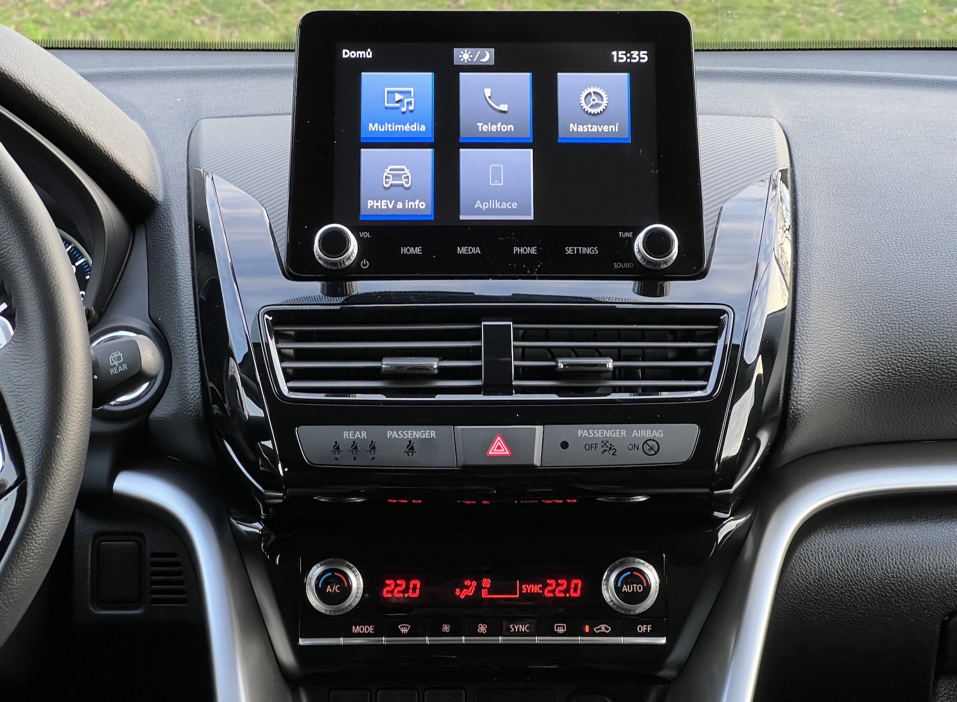 Právě tady si dovolím opět krátké poohlédnutí k roku 1999, kdy mi interiér Mitsubishi Galant přišel naprosto úžasný a snový. Teď je ovšem konec roku 2021 a už to taková bomba není. Interiér Eclipse Cross není vůbec ošklivý nebo nefunkční, ale je řekněme typicky Japonský. Volant nenadchne ani neurazí, sedadla jsou příjemná, ale ne špičková, a jakožto dekor nechybí ani „plastový karbon.“ Zpět k věci: moc nerozumím tomu. proč se Japonci ještě nenaučili ovládat palubní počítač třeba na volantu, ale stále si prosazují kolíček u kapličky. Naopak některá další opravdová tlačítka ocenit musím, vše se totiž nemusí ovládat pomocí dotykové obrazovky. Ne, že by tu žádná nebyla, vprostřed najdeme 8“ dotykový displej audiosystému, který je skvěle čitelný, grafiku má pěknou, ovládání funkční, a hlavně má rychlé reakce na dotyk. Poslední věc k interiéru a dostaneme se k technice vozu. Je velká škoda, že nový Eclipse Cross přisel o posuvnou zadní lavici. Jde hlavně o to, že i přes nárůst objemu zavazadlového prostoru nejde o vyloženě přebytek litrů, navíc musíte počítat s tím, že pořád s sebou vozíte nabíjecí kabely.